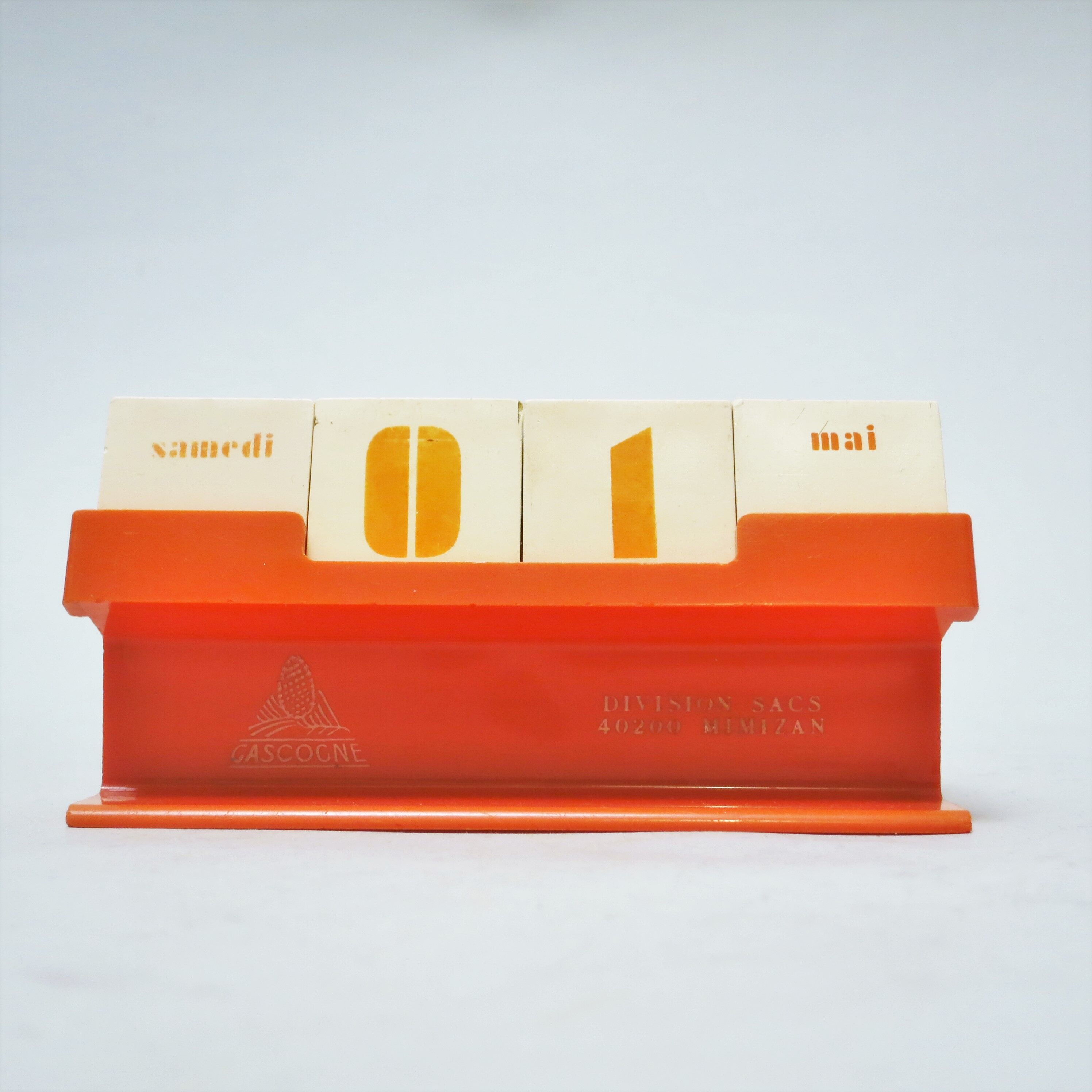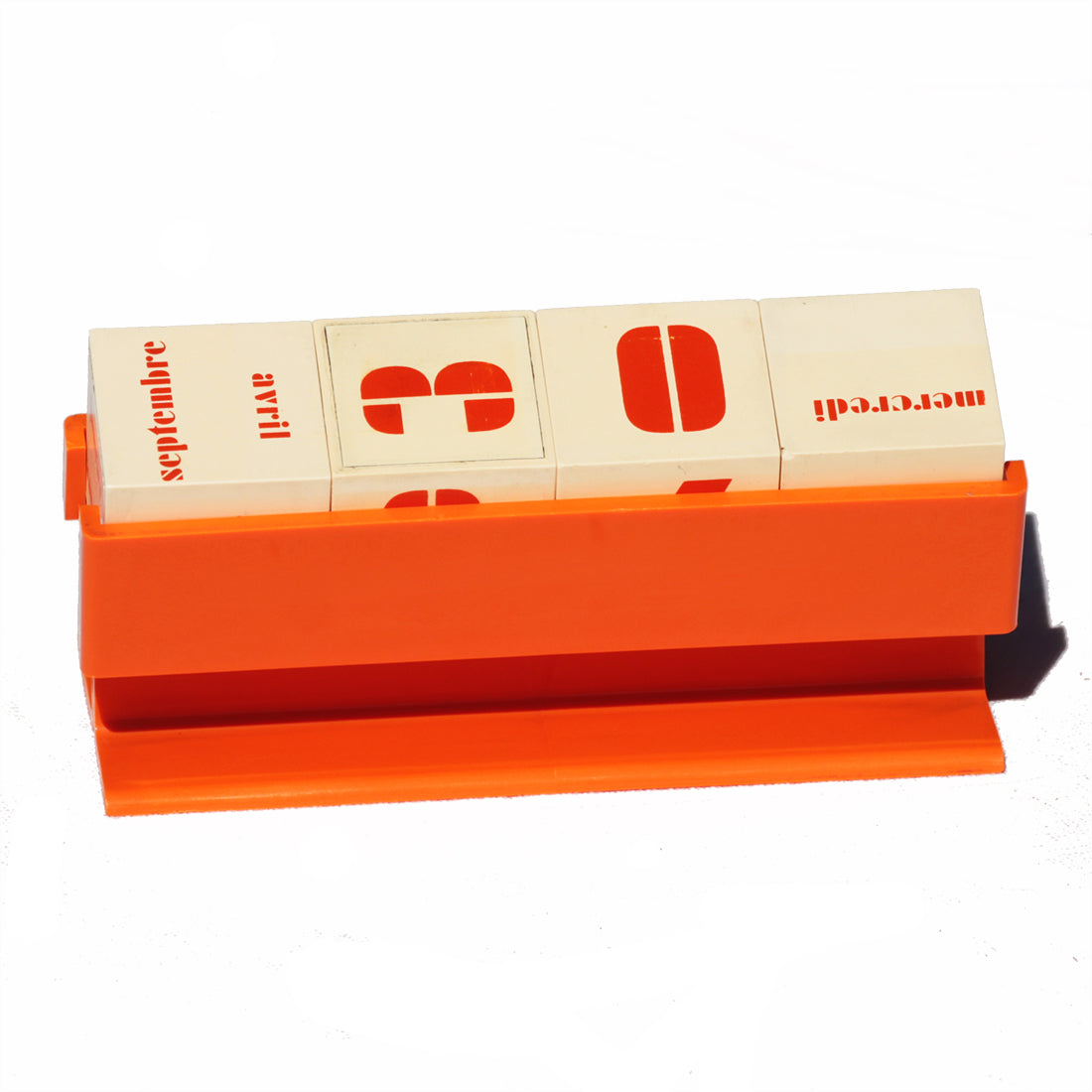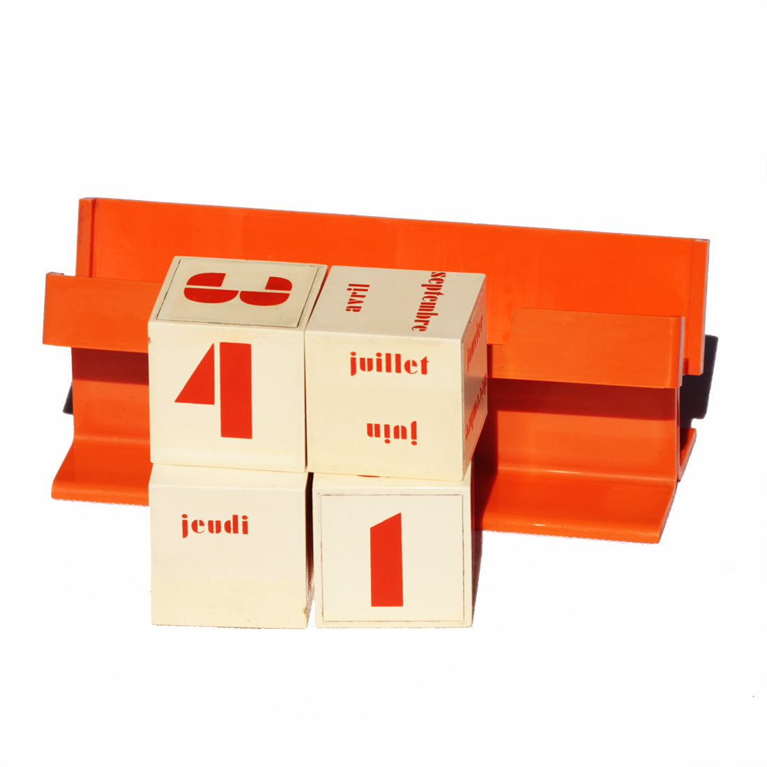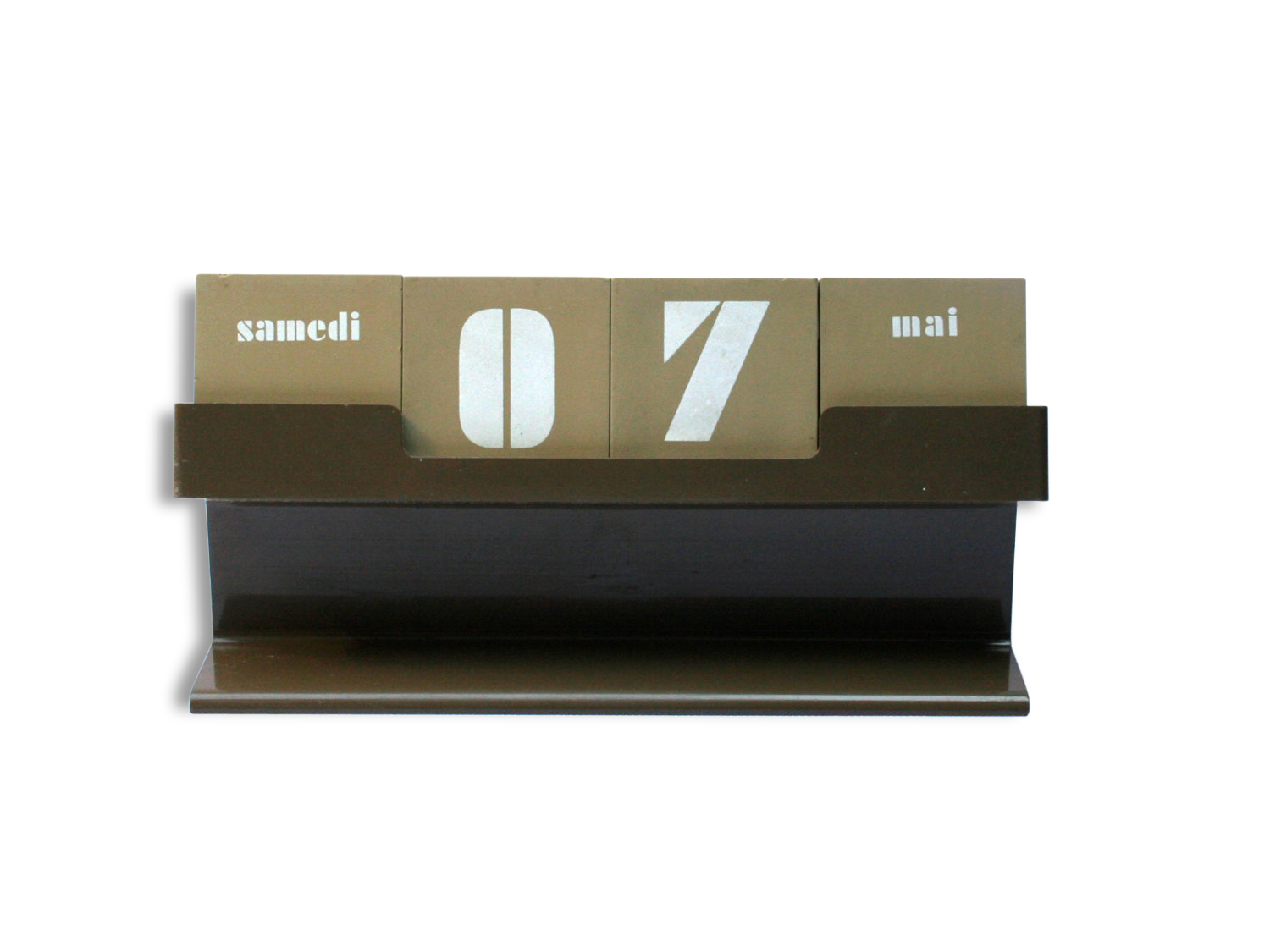 Some searching online leads to several versions of this calendar, all in French! They have the exact same design, with text in Futura Black and those same, alternate numbers. Most in the same colour scheme, one in tasteful brown and beige.