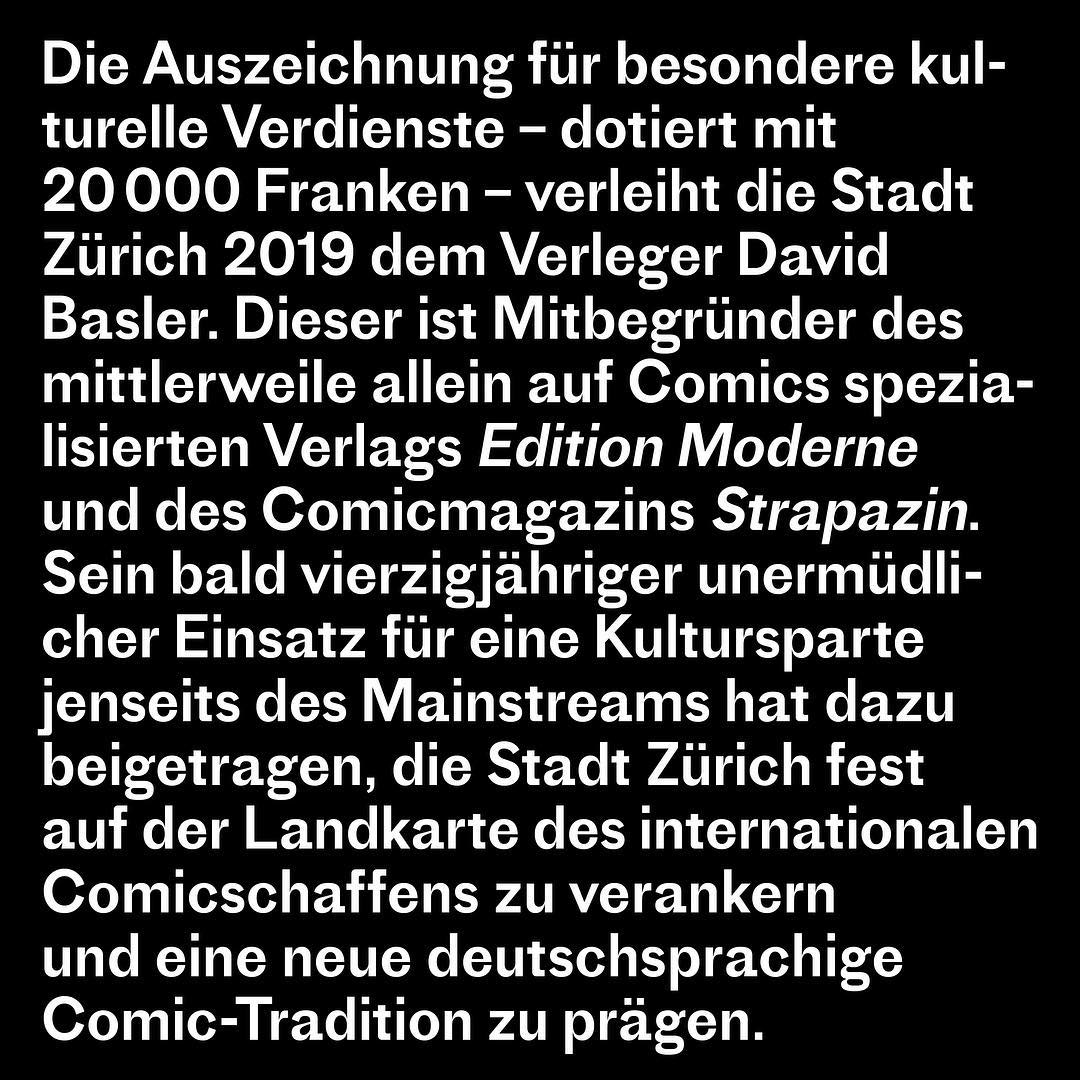 In 2019, the City of Zürich honored co-founder David Basler for special cultural achievements.