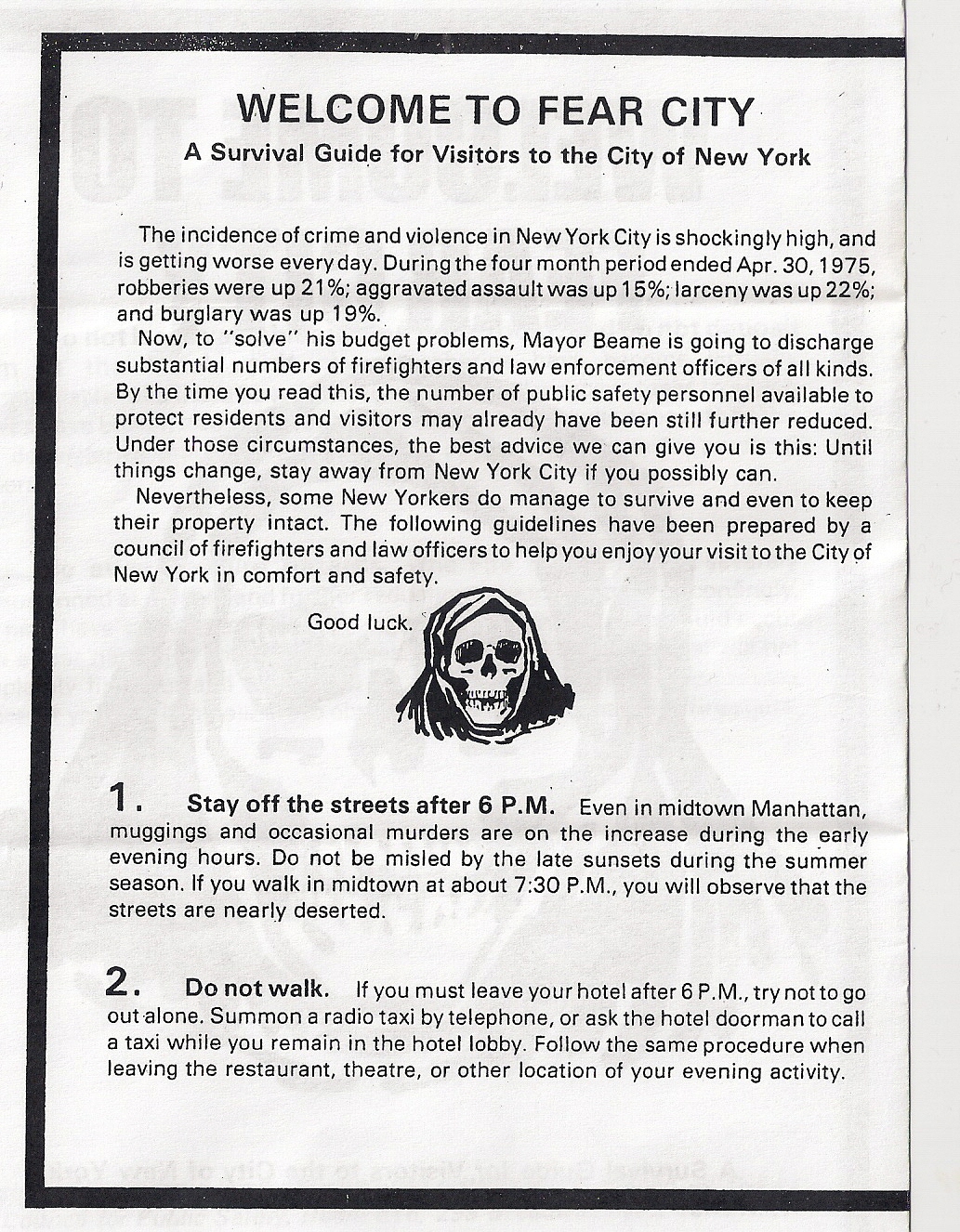 To cut costs, Mayor Abraham Beame planned to lay off 16,590 municipal employees (including 1,000 policemen). In response, the Council for Public Safety (a trade organization of 80,000 city employees, many of them police) passed out pamphlets titled Welcome to Fear City: A Survival Guide for Visitors to the City of New York (pdf) warning tourists of the dangers of visiting the city. It was a sort of argumentum ad baculum (intimidation tactic), implying that laying off 1,000 policemen would make the city more dangerous and tourists would fall victim to crime.
