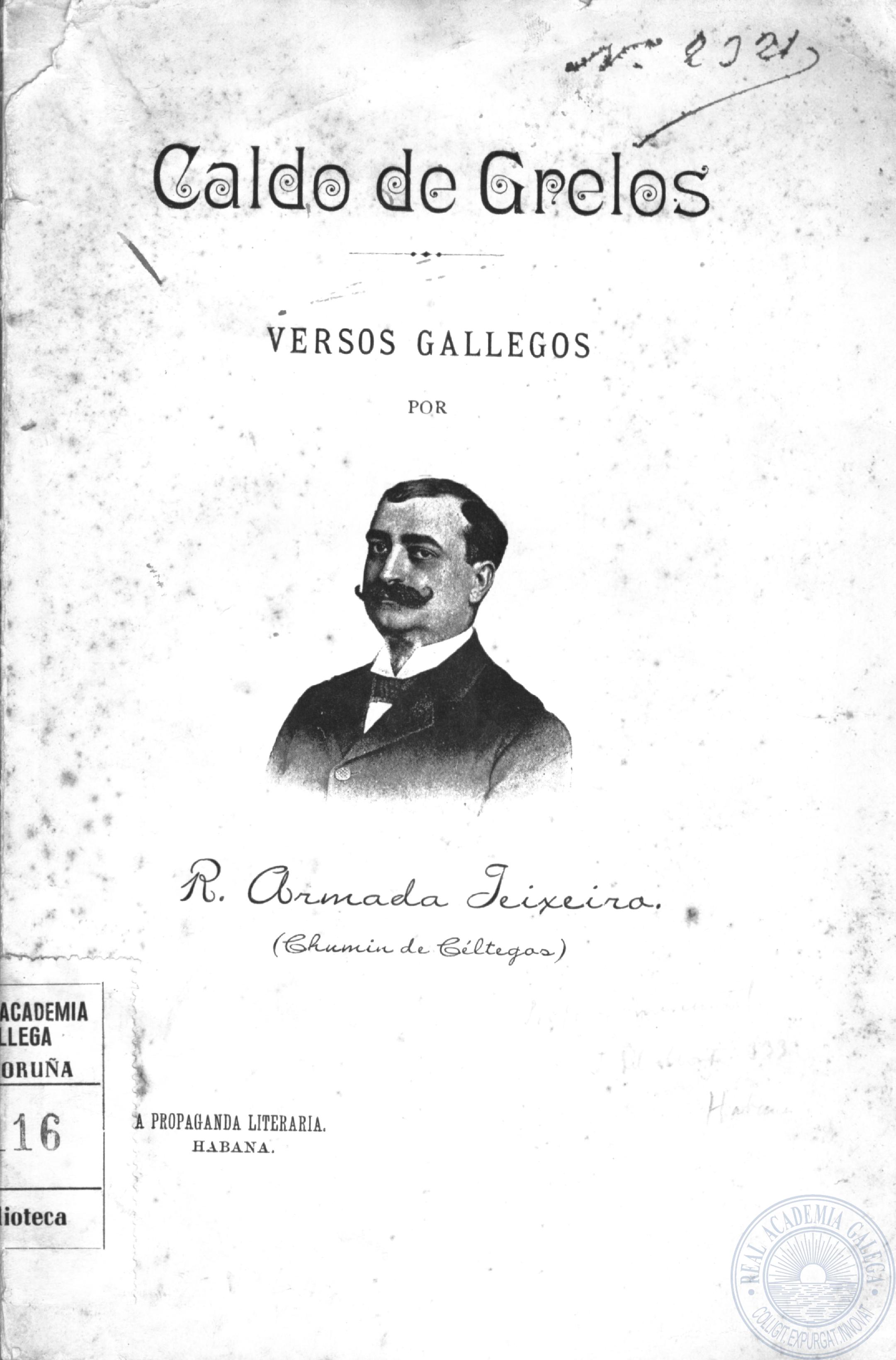Caldo de grelos. Versos gallegos is a book of Galician poetry written by R. Armada Teixeiro (Chumín de Céltegos) and published by A Propaganda Literaria, Habana (Cuba), 1895.