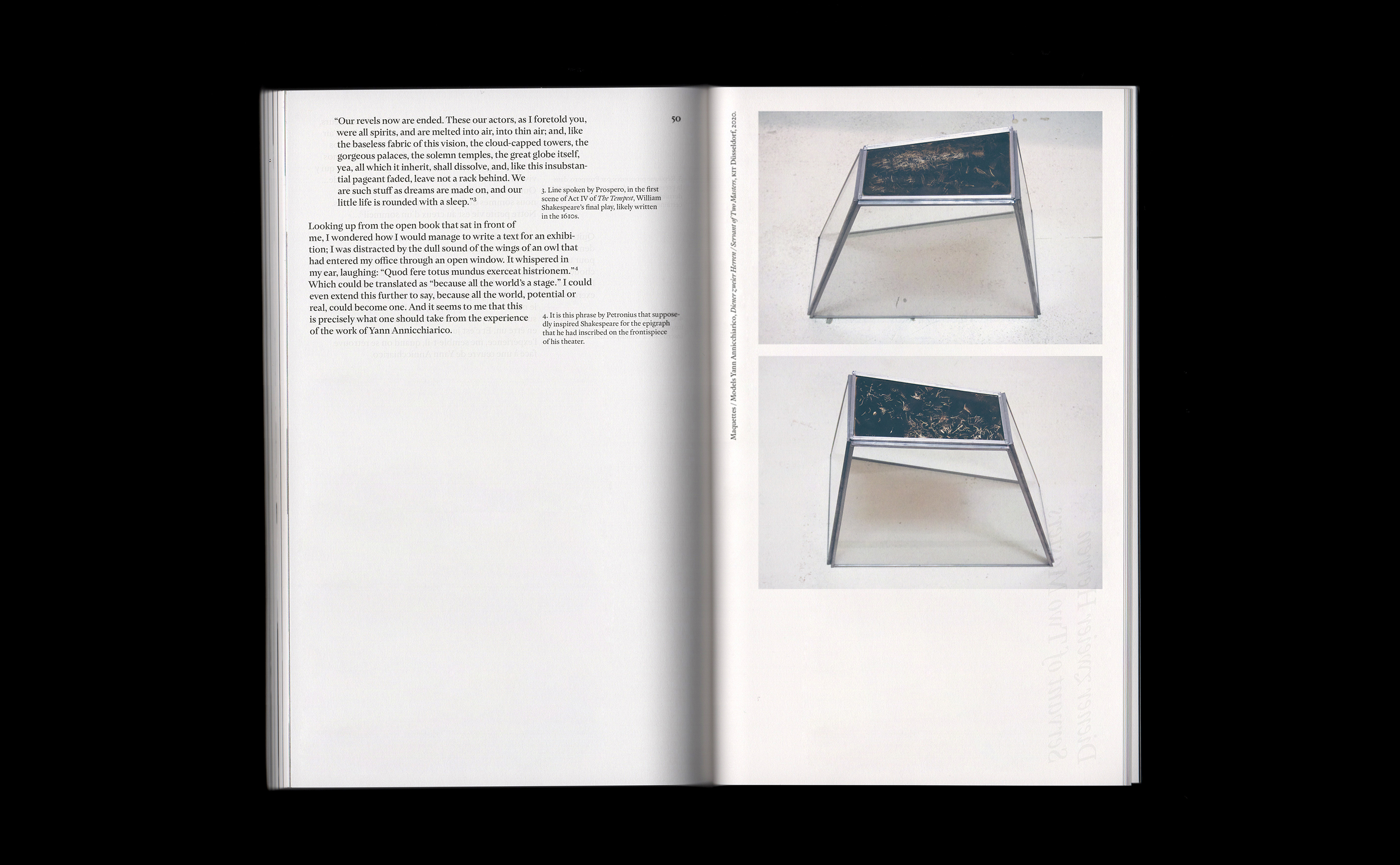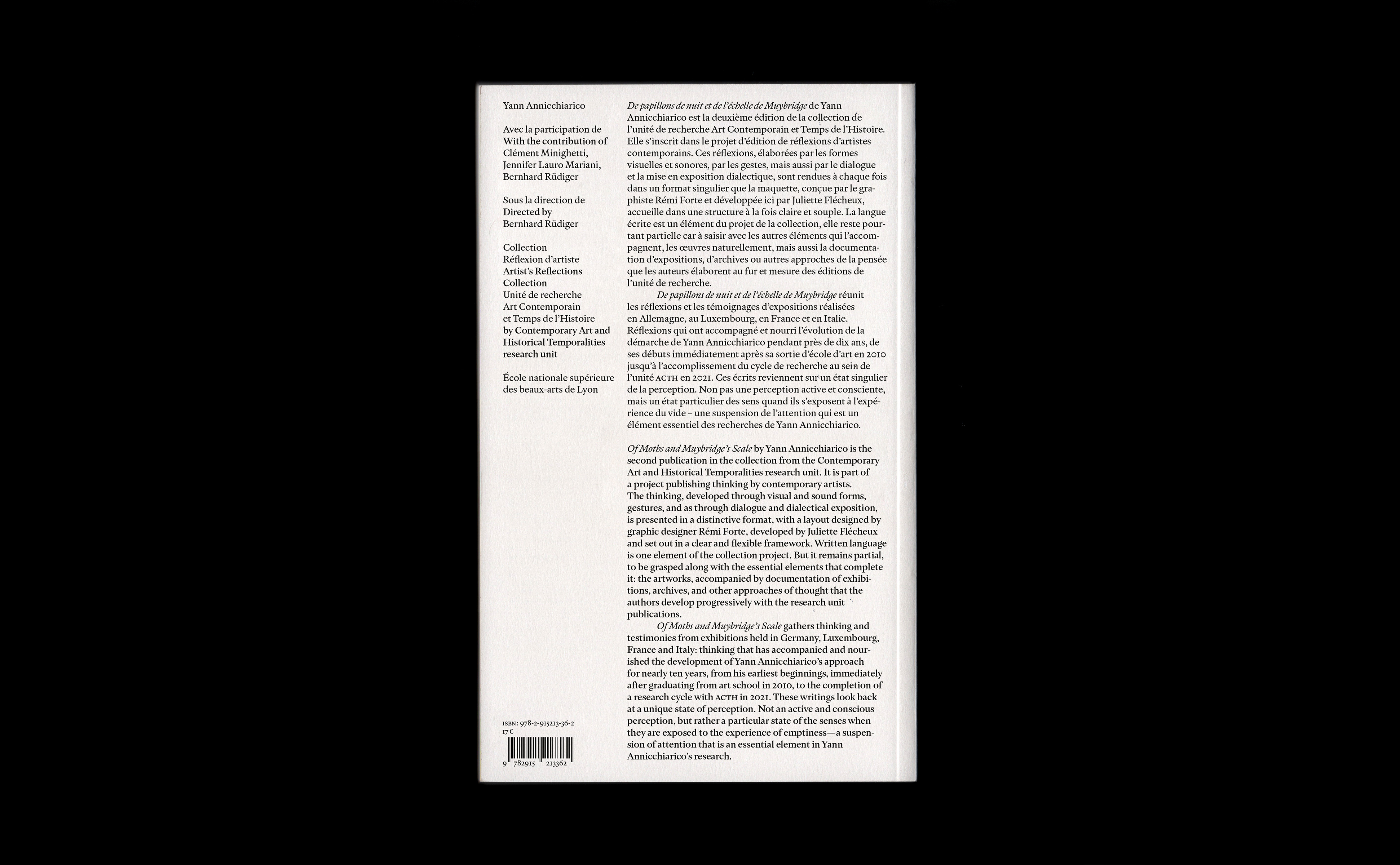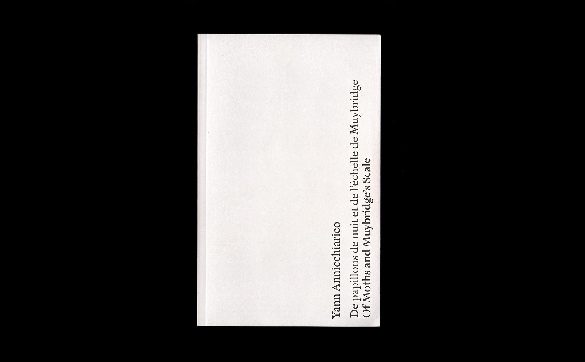 De papillons de nuit et de l’échelle de Muybridge / Of Moths and Muybridge’s Scale by Yann Annicchiarico is the second publication in the collection from the Contemporary Art and Historical Temporalities research unit. It is part of a project publishing thinking by contemporary artists. The thinking, developed through visual and sound forms, gestures, and as through dialogue and dialectical exposition, is presented in a distinctive format, with a layout designed by graphic designer Rémi Forte, developed by Juliette Flécheux and set out in a clear and flexible framework. Written language is one element of the collection project. But it remains partial, to be grasped along with the essential elements that complete it: the artworks, accompanied by documentation of exhibitions, archives, and other approaches of thought that the authors develop progressively with the research unit publications.
