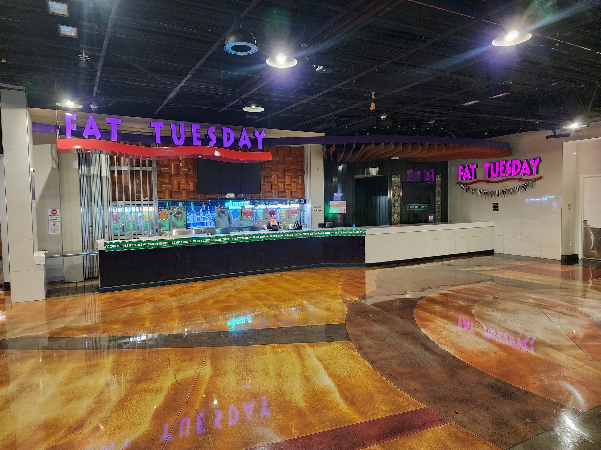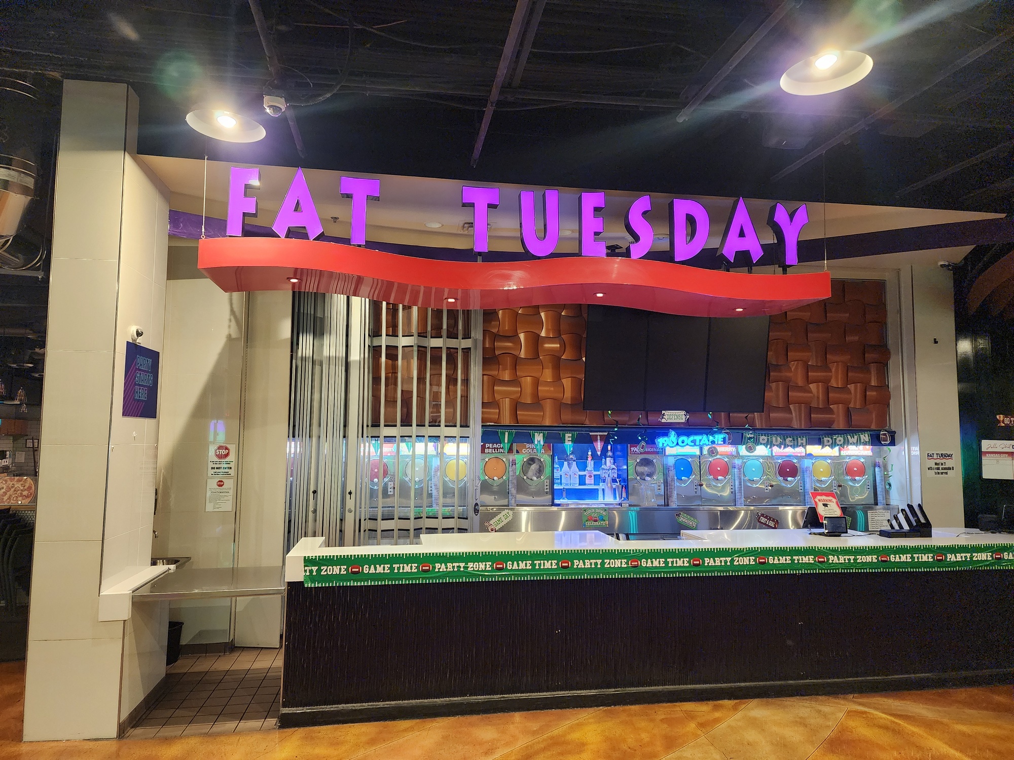 Fat Tuesday was first established in 1984 in New Orleans (the name is a translation of the French Mardi Gras). Today the chain has restaurants in nearly 90 locations across the United States and abroad. The logo uses Lithos (1989). Shown here is the Fat Tuesday restaurant inside the MGM Grand hotel, Las Vegas, Nevada, USA.