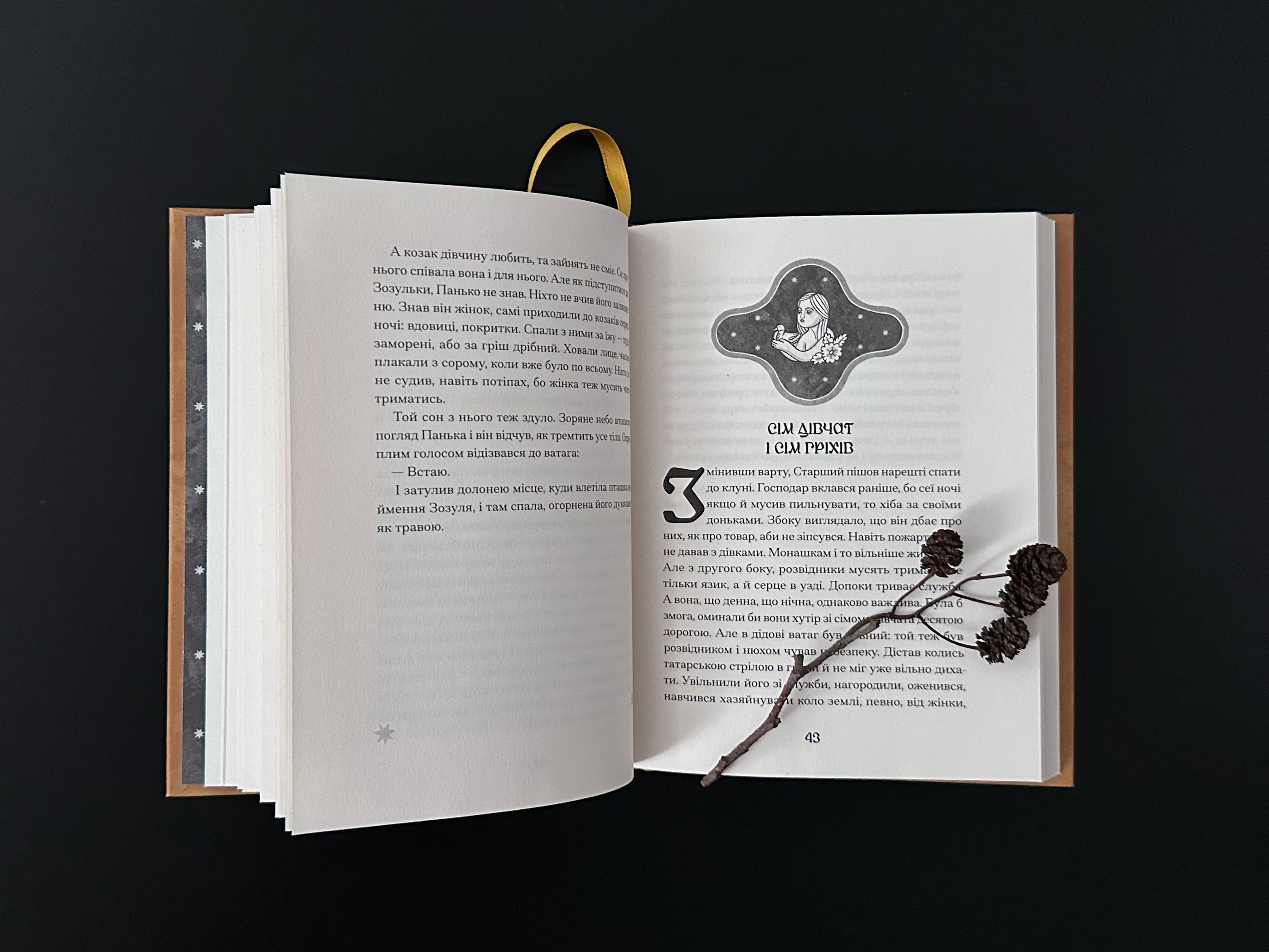 The Morta typeface used on the cover and titles is all about strange and unknown, and is therefore a good visual key to opening the doors to the magical worlds of Halyna Pahutyak. “While working on concept sketches, I synthesized such theses as historical and cartoon, mystical and attractive. The slant of the italics is flipped the other way to give the feeling of looking from the other side, from behind a mirror,” Michael Rafailyk, says about his Morta concept.