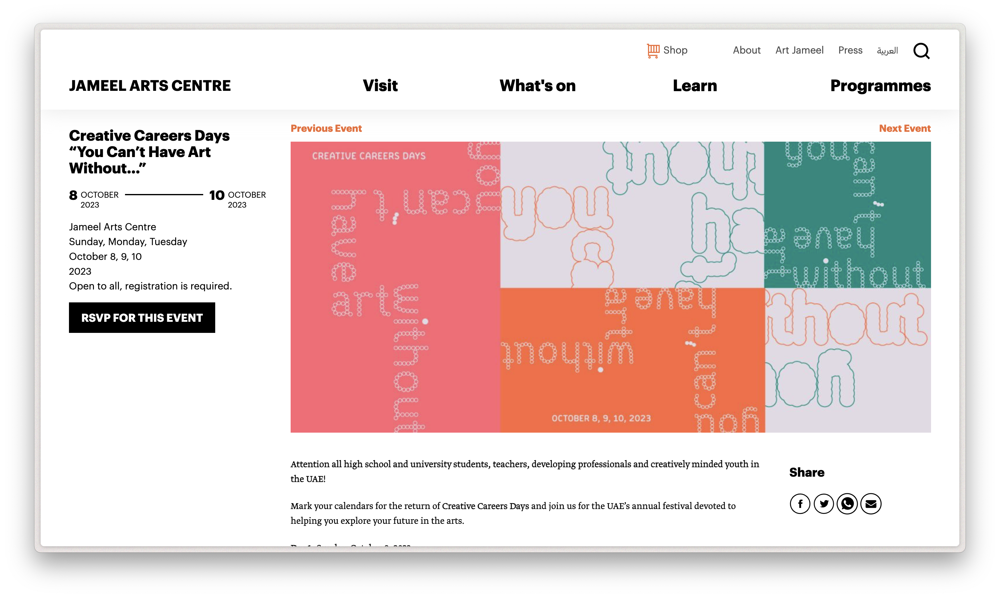 This second iteration of Creative Careers Days, titled You Can’t Have Art Without…, is dedicated to showcasing the multiple roles that can contribute to the growth of the arts ecosystem. Discover how you can apply your core interests from business, accounting and law to humanities, social studies and languages, as well as fine and performing arts to the creative industries.