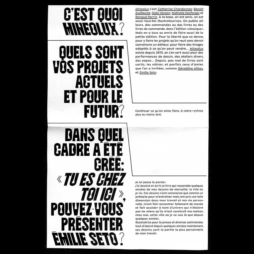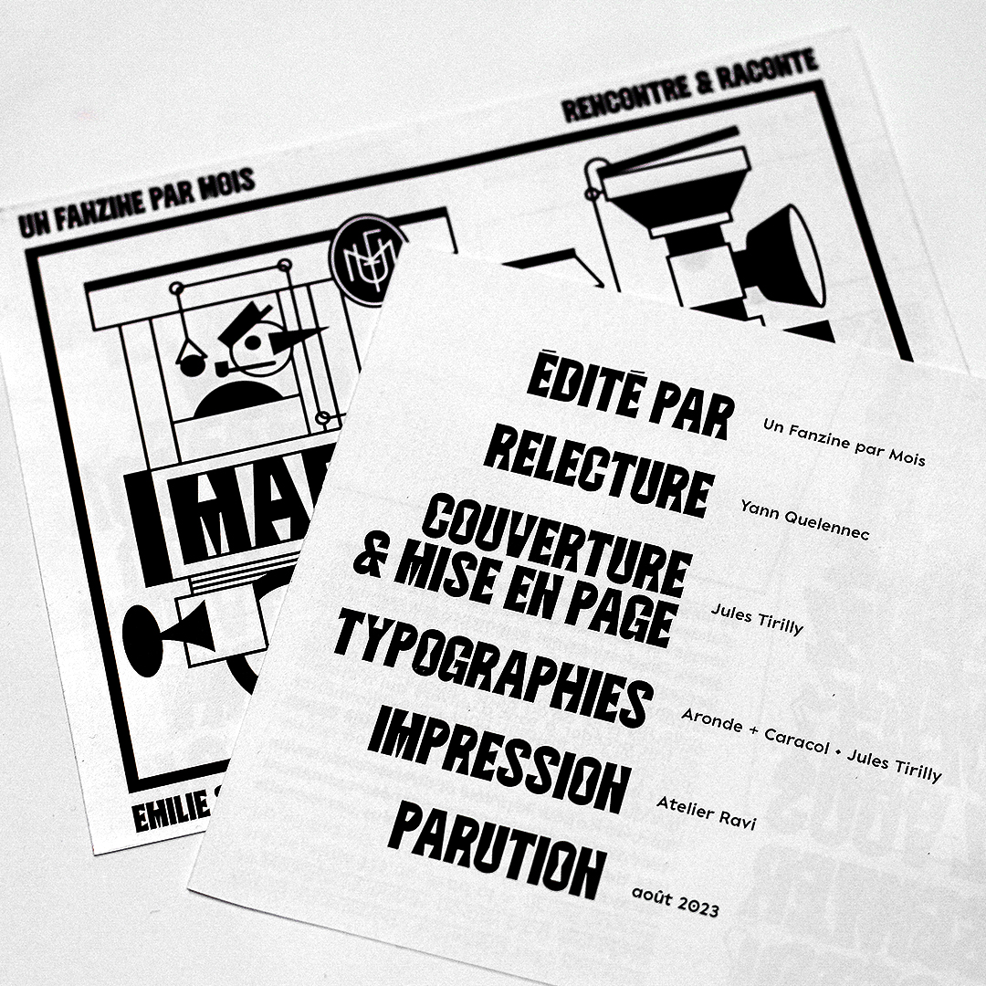 Un Fanzine par Mois – interview Émilie Seto Contributed by Jules Tirilly on Feb 22nd, 2024. Artwork published in August 2023. Source: www.instagram.com Jules Tirilly. License: All Rights Reserved. Interview designed by Jules Tirilly for Un Fanzine par Mois, which in August 2023 distributed the fanzine tu es chez toi ici by Émilie Seto, published by Mineolux. The typeface Aronde is used here for the title and in the illustration. It is accompanied by Caracol in the body text. Source: www.instagram.com Jules Tirilly. License: All Rights Reserved. Source: www.instagram.com Jules Tirilly. License: All Rights Reserved. Source: www.instagram.com Jules Tirilly. License: All Rights Reserved. Source: www.instagram.com Jules Tirilly. License: All Rights Reserved. Typefaces More about ArondeGet ArondeMore about Caracol Formats Booklets/Pamphlets (2359) Topics Art (4575) Designers/Agencies Jules Tirilly (2) Tagged withUn Fanzine par Mois (1)Mineolux (1)zines (158)black and white (1983)uses by the typeface’s designer (1242)pre-release uses (688)left-leaning italics / backslanted (153)gender-inclusive typography (42)French (language) (2472)Risograph printed (232)Émilie Seto (1)interviews (407)guillemets («») (182)locomotives (9)type integrated with image (433) Artwork location France (2772) Marseille (61) In Sets2+ typefaces by 1 designer (Florian Hardwig) (1085)PHANTA (Leonardo de la Fuente) (285) Post a comment Name Email – will not be published Website Your response Submit Comment More in Art Konstfack Research Week 20252025falk schröterContributed by falk schröter YES & NO magazine2017PentagramDomenic LippaJeremy KunzeContributed by Yosinto Éditions Sans Soleilc. 2022Lea GallonEléa RochatContributed by Altiplano Typefaces Staff Pick Sponsor More in Booklets/Pamphlets kirche reframedc. 2017Johannes PistoriusContributed by Johannes Pistorius KLEOS+KLEA2024Voodoo VoodooCatarina PereiraContributed by Catarina Pereira Ringside2009Stefi Orazi StudioContributed by Stephen Coles Norwich Cathedral2009The ClickContributed by Indra Kupferschmid More Fonts In Use Common Office2019Common Office New YorkHai Minh TranContributed by CO Staff Pick Queen – News of the World album art1977Frank Kelly FreasCreamContributed by Florian Hardwig Staff Pick Centre du Théâtre d’Aujourd’hui2014Cardell StudiosGabriel JasminAlix NeyvozContributed by Philippe Dionne Bussières Staff Pick The Immortal Mississippi John Hurt album art1967Jules HalfantContributed by Nick Sherman Staff Pick The Rachel Papers by Martin Amis (Alfred A. Knopf)1974Ray CruzContributed by Chris Purcell Staff Pick Nike LeBron 9 Shoes Ads (Design Explorations)2013HortContributed by Stephen Coles Staff Pick “The Land of Free Press” – Trump-Putin meeting campaign by Helsingin Sanomat2018Helsingin SanomatContributed by Florian Hardwig Staff Pick Maybourne Papersc. 2012Construct LondonContributed by Swiss Typefaces Staff Pick