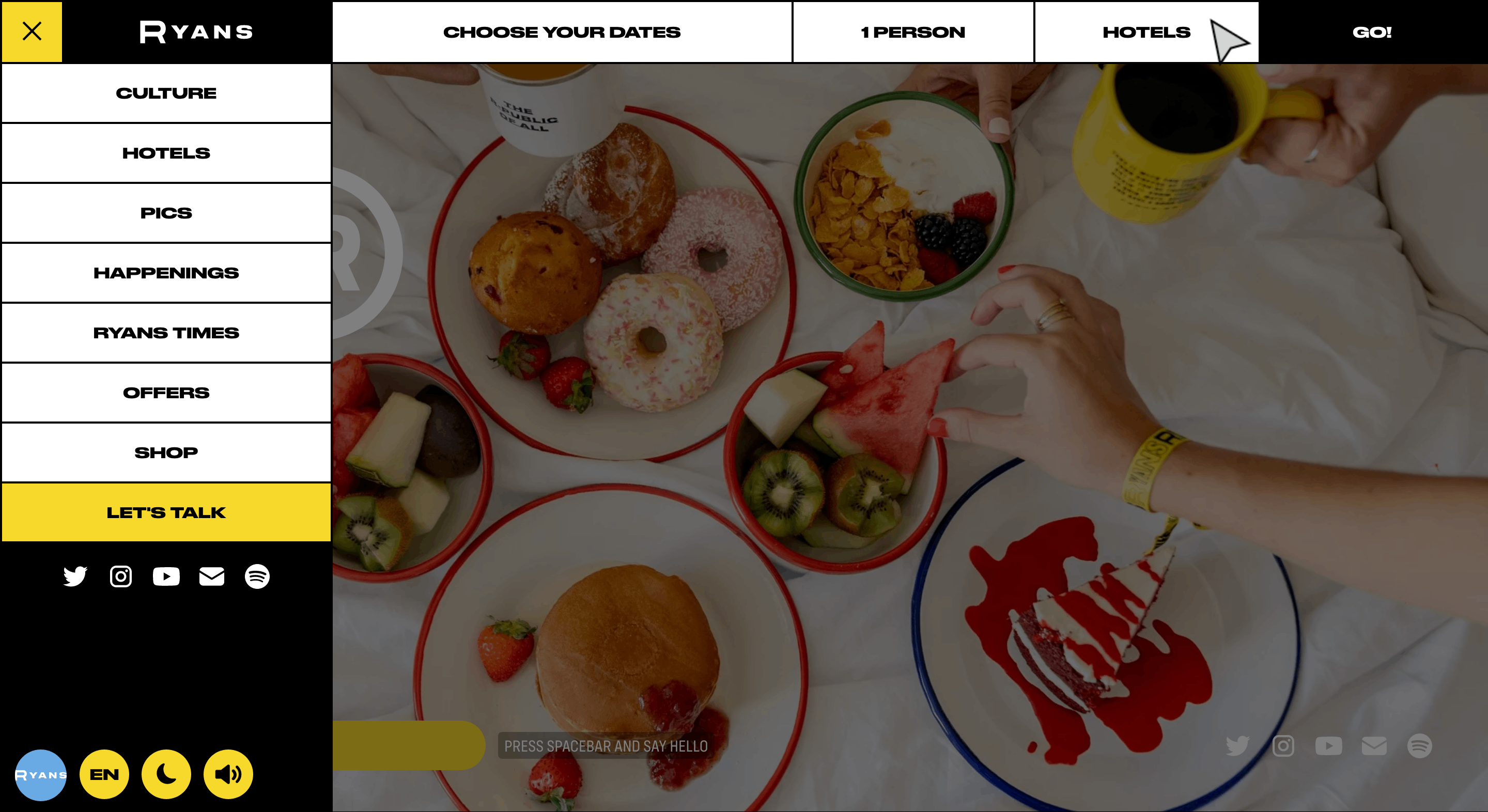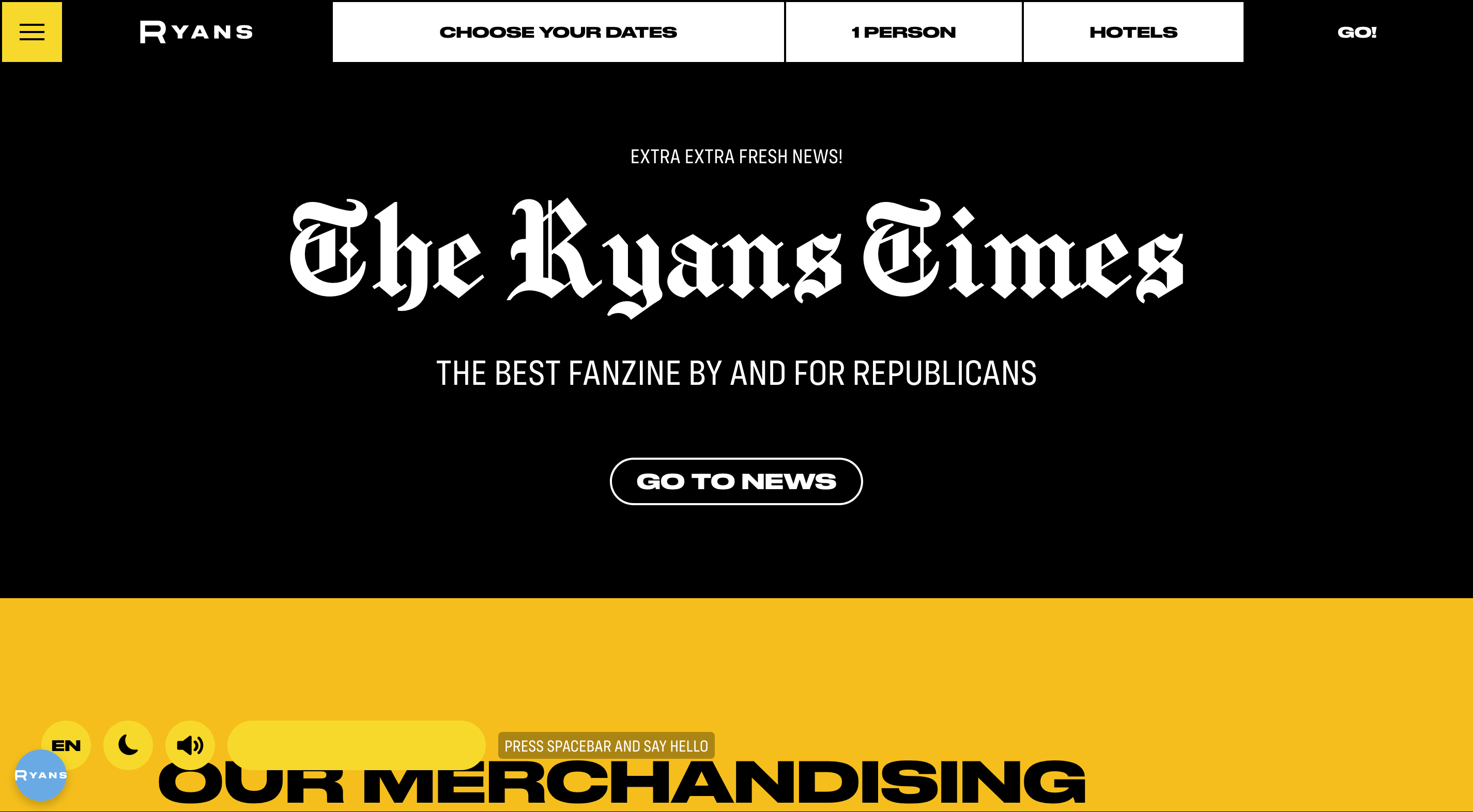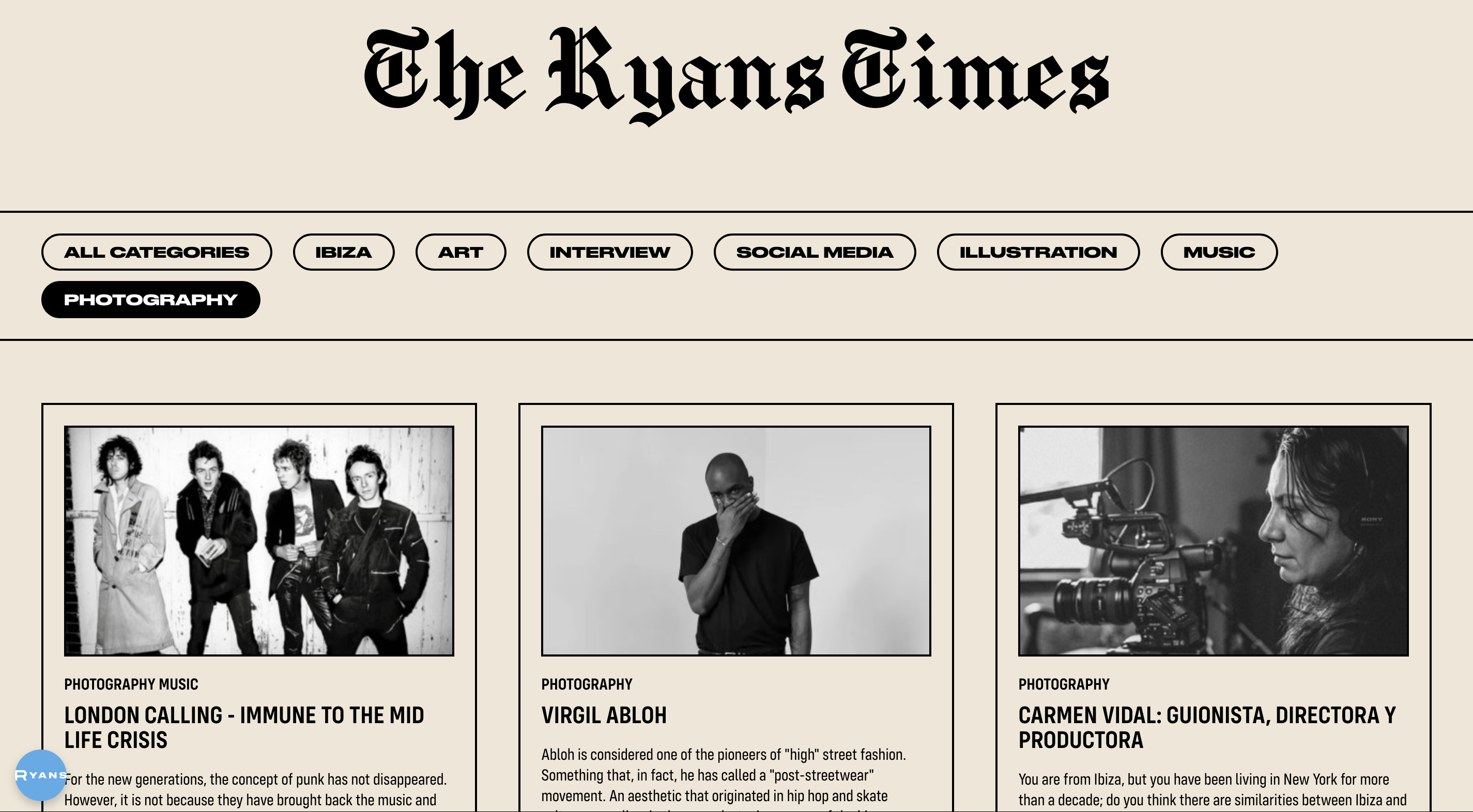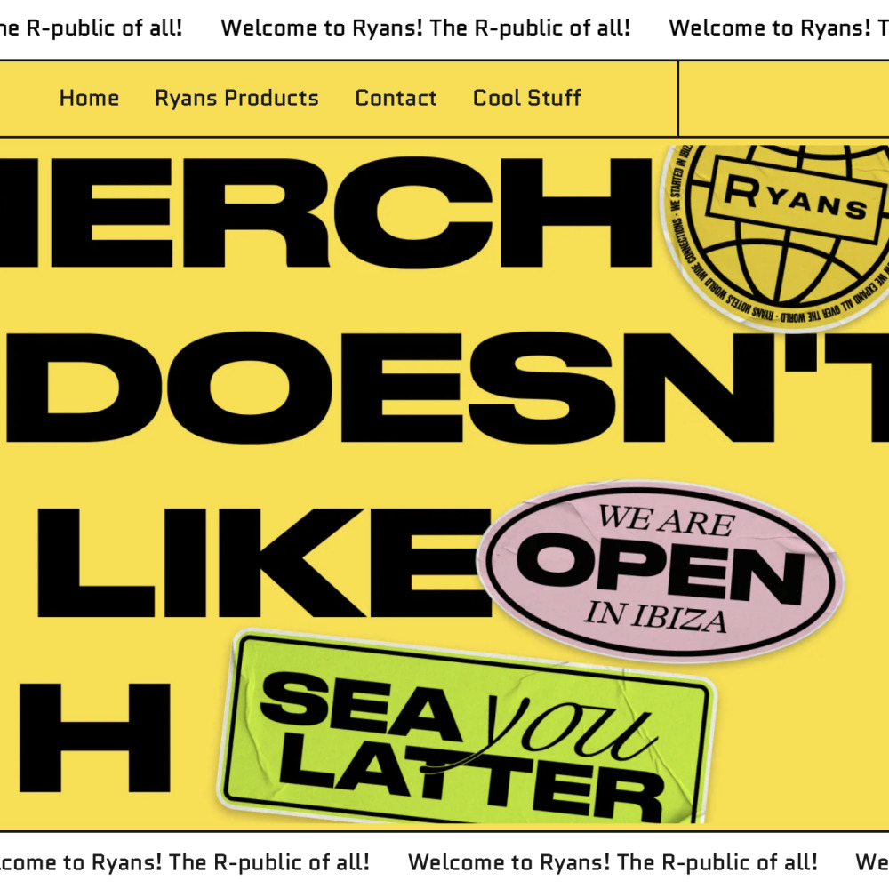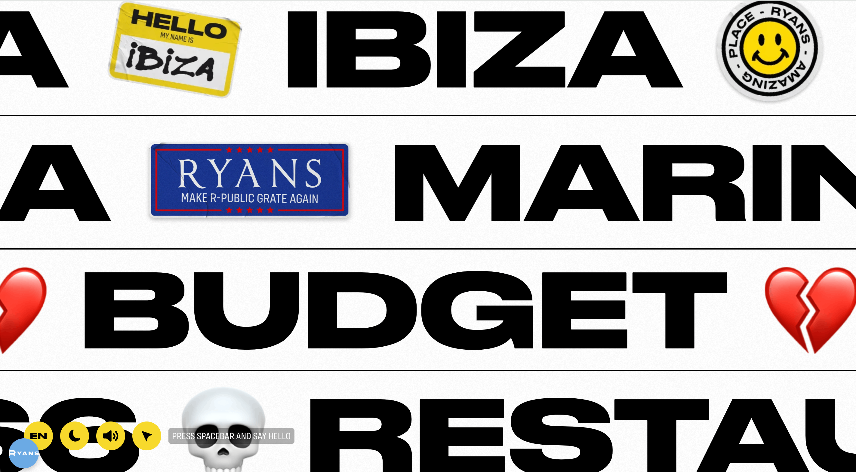 The logo of The Ryans Times uses Chomsky. The site additionally uses Apple Color Emoji in the ticker-style menu as well as various typefaces for the travel stickers. This includes Millionaire Script (“you”), Sister Spray (“Ibiza”), and Imperator (“Ryans”).