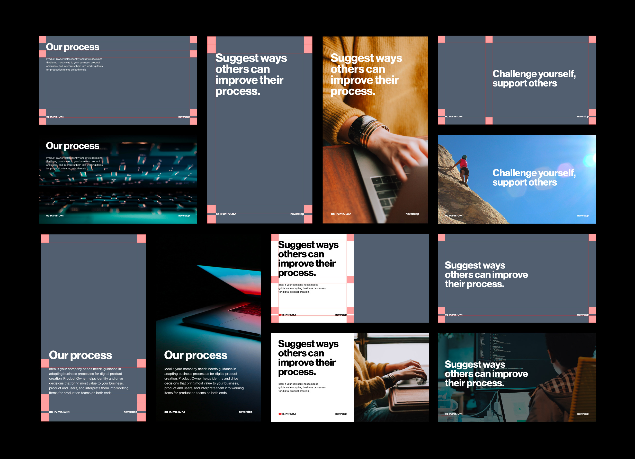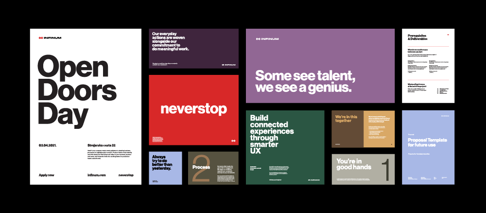 Infinum is an independent design and development agency founded in 2005. They grew into one of the world’s most reputable companies in their industry, and it was time for their branding to evolve as well. In collaboration with Infinum’s in-house team, Studio Size developed a more sophisticated visual presence and a brand story captured in the motto “neverstop”.