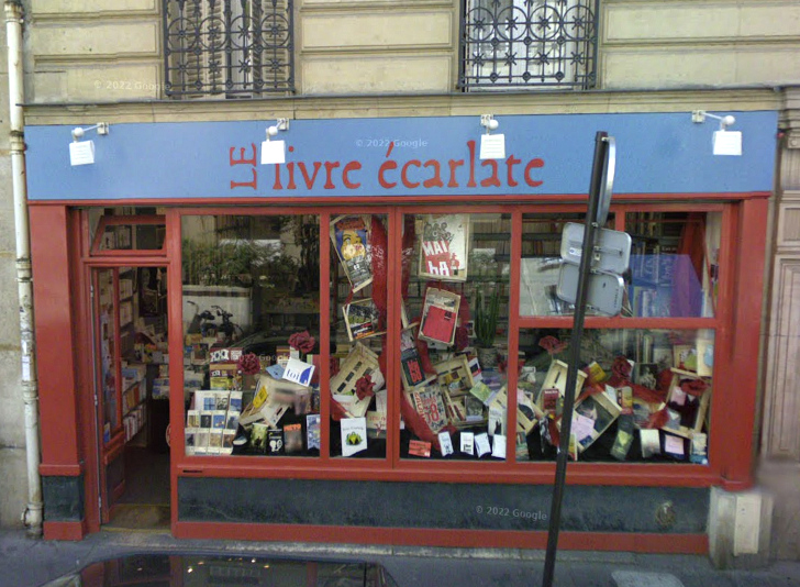Philippe Leconte opened his bookstore Le livre écarlate in 2005. I’d assume that the sign with the logo was installed in the same year.