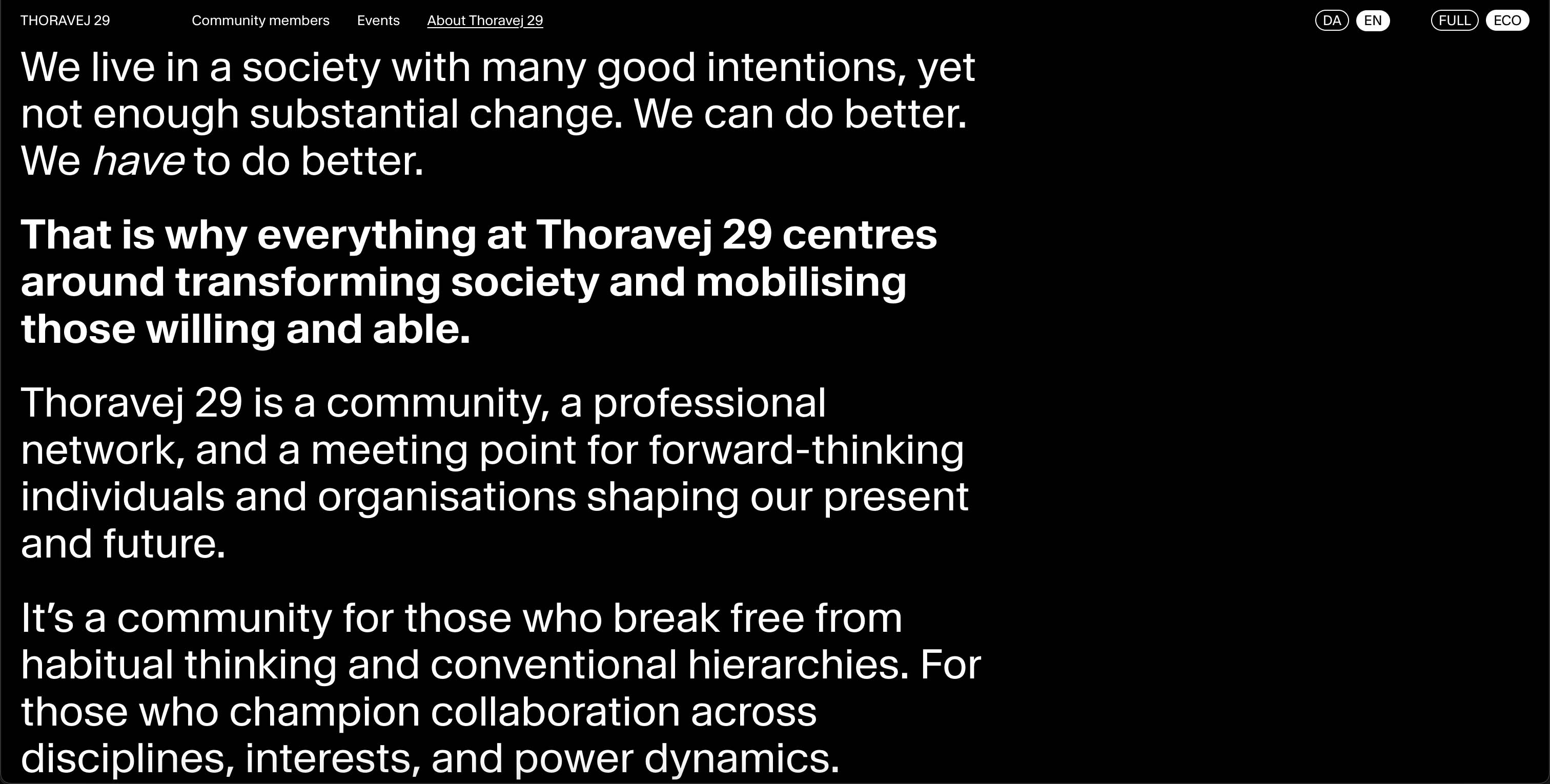 Thoravej 29 is a community, a professional network, and a meeting point for forward-thinking individuals and organisations shaping our present and future. It’s a community for those who break free from habitual thinking and conventional hierarchies. For those who champion collaboration across disciplines, interests, and power dynamics.