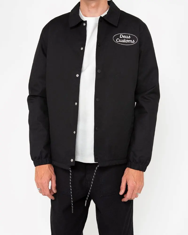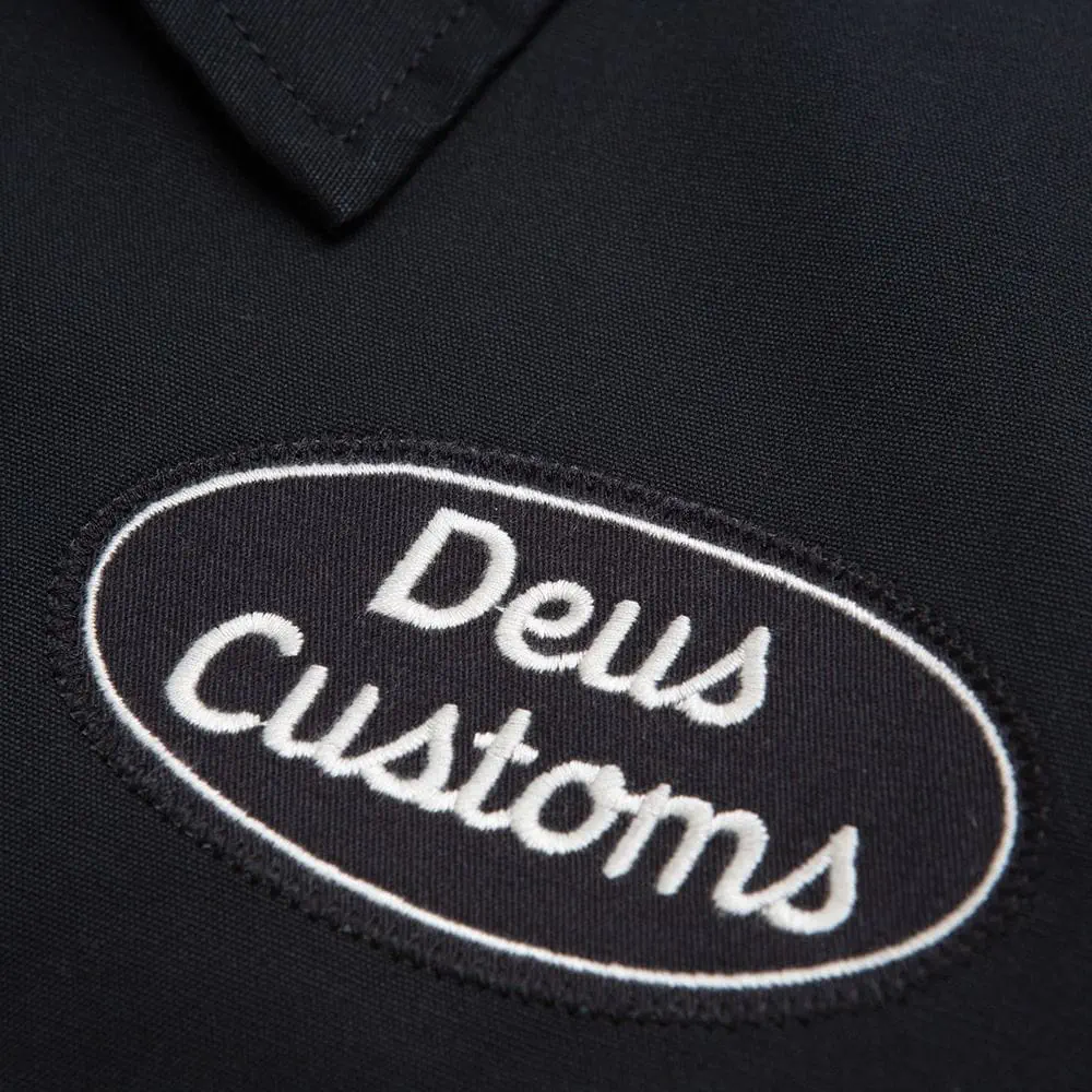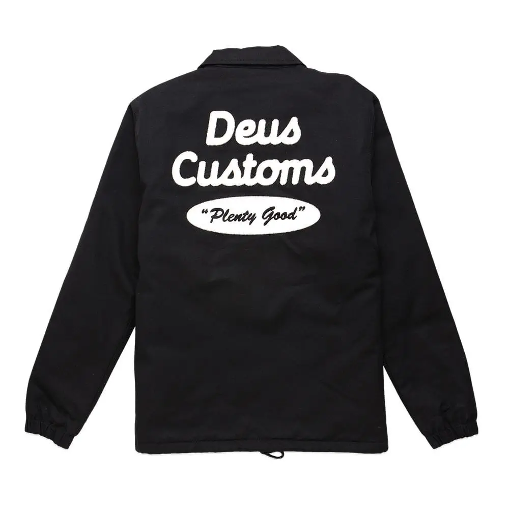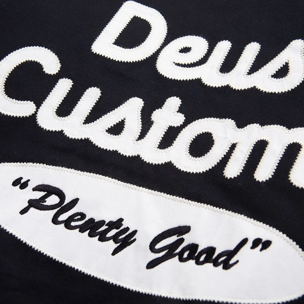 The item featured in this post is a functional jacket named “Plenty“ from the Deus Customs series. Black and of a no-nonsense straight cut, it was designed at the Deus House of Simple Pleasures in Camperdown, Sydney. Its highlights are purely typographic and feature Brush Script (“Plenty Good”), an American classic from the 1940s, and Enfantine (“Deus Customs”), a script typeface designed by Jean-Baptiste Levée from Production Type. While the calligraphic idea behind the first is that of a pointed brush used in sign painting, Enfantine distinguishes itself by monolinear strokes, a wide rhythm with open counters, and by standing upright, a feature seldomly found in script typefaces.