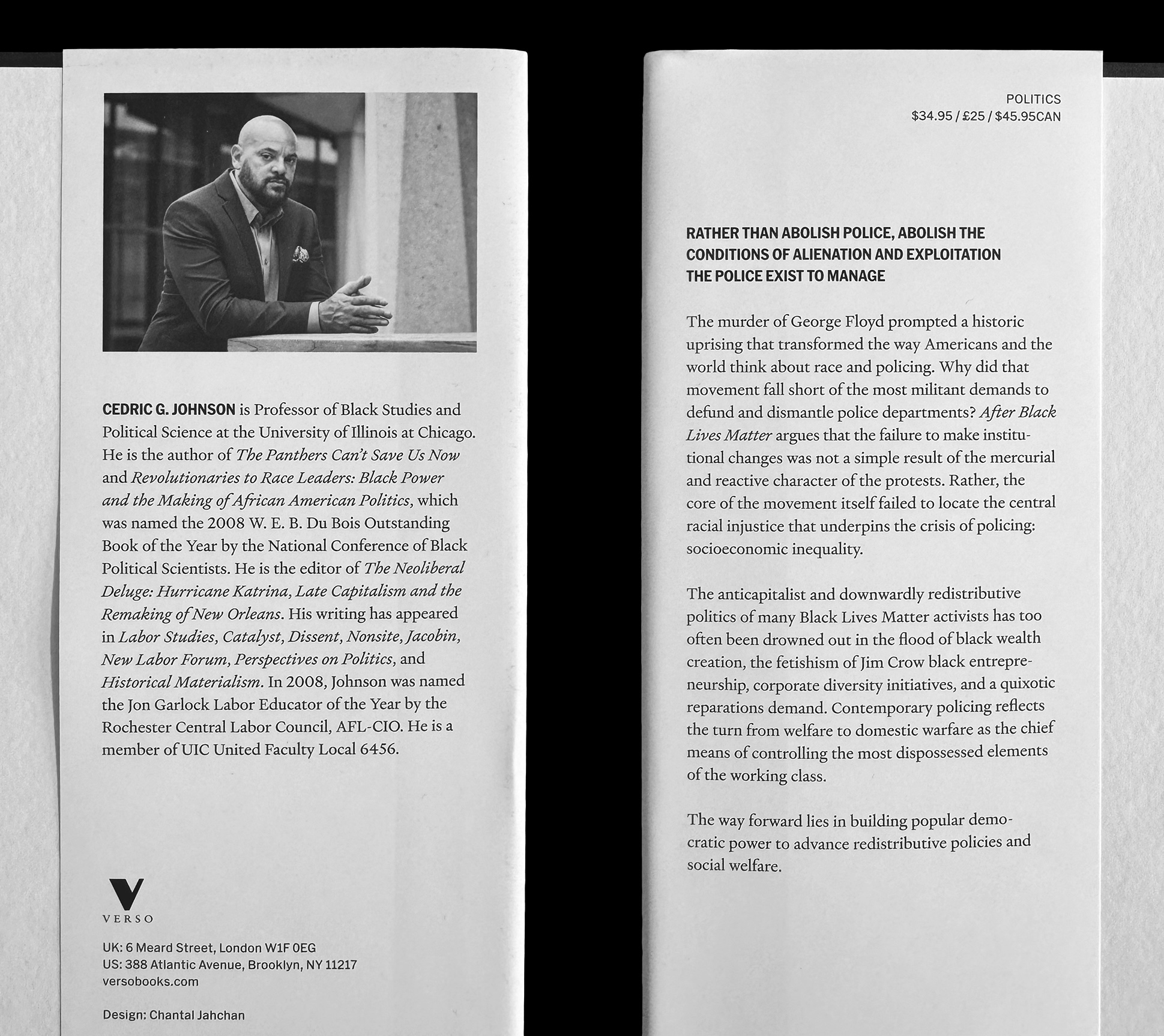 The book is published by Verso Books in hardcover and paperback editions. The covers were designed by Chantal Jahchan with the front set in a single large size of tightly-set, all-caps HEX Franklin (using the HEX Franklin Tyght variable font for tight letterspacing), justified with inline images of protests. On the back covers and dustjacket flaps, smaller settings of HEX Franklin are paired with Heldane for paragraph text.
