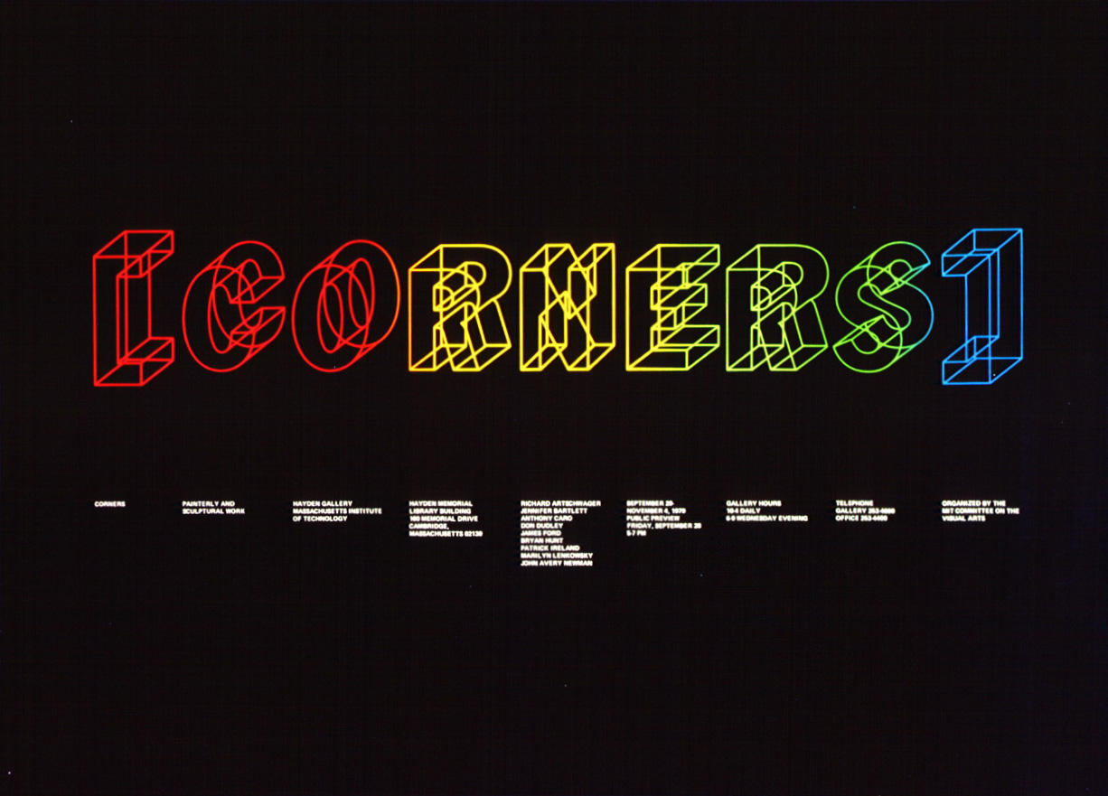 Poster for the Corners exhibition of “painterly and sculptural work” in the Hayden Gallery at the Massachusetts Institute of Technology.