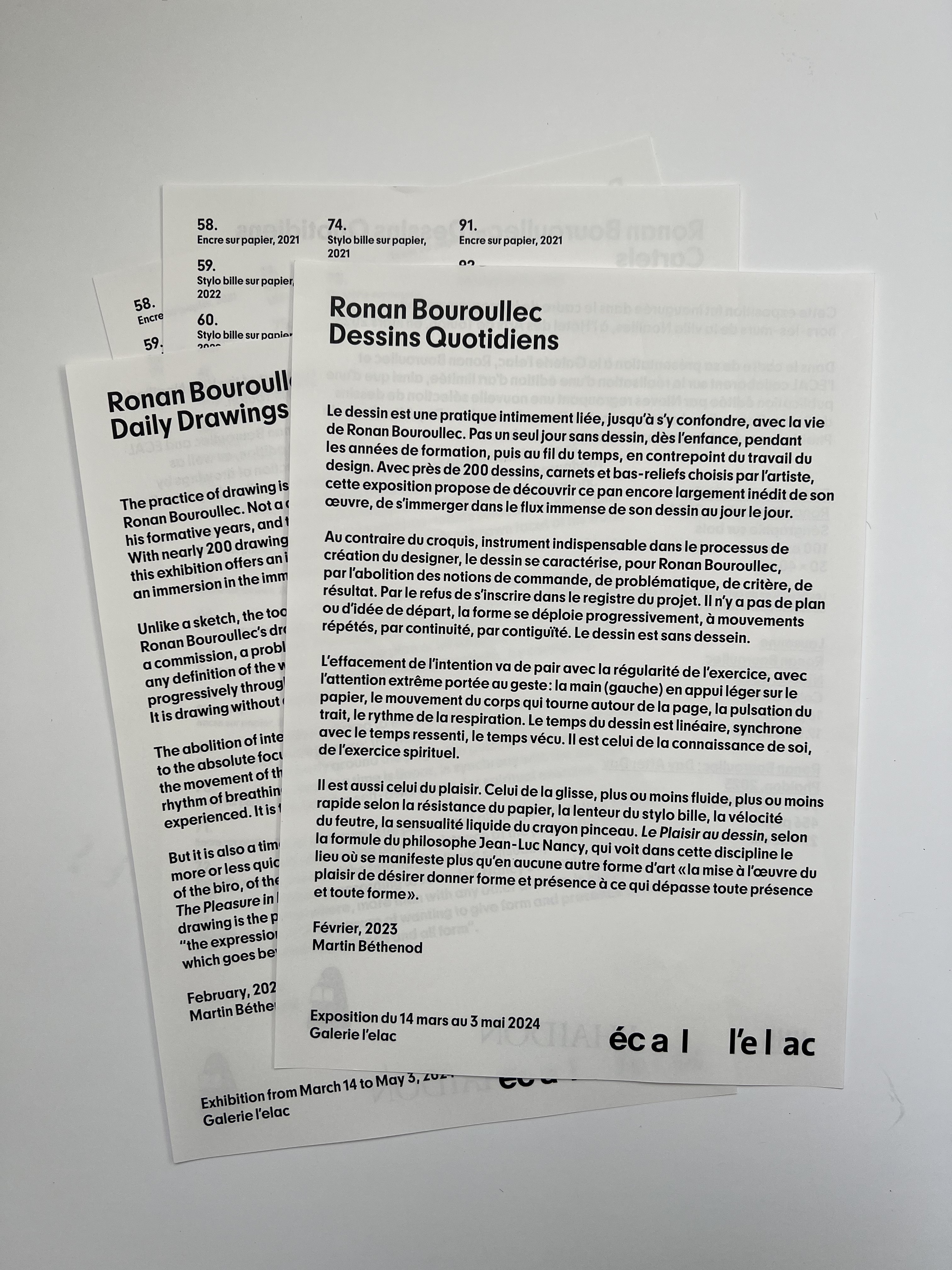 Ronan Bouroullec, from the famous design duo Ronan & Erwan Bouroullec, showcases his artistic practice at the ECAL gallery ELAC, from March 13 to May 3, 2024, in Dessins Quotidiens (Daily Drawings).