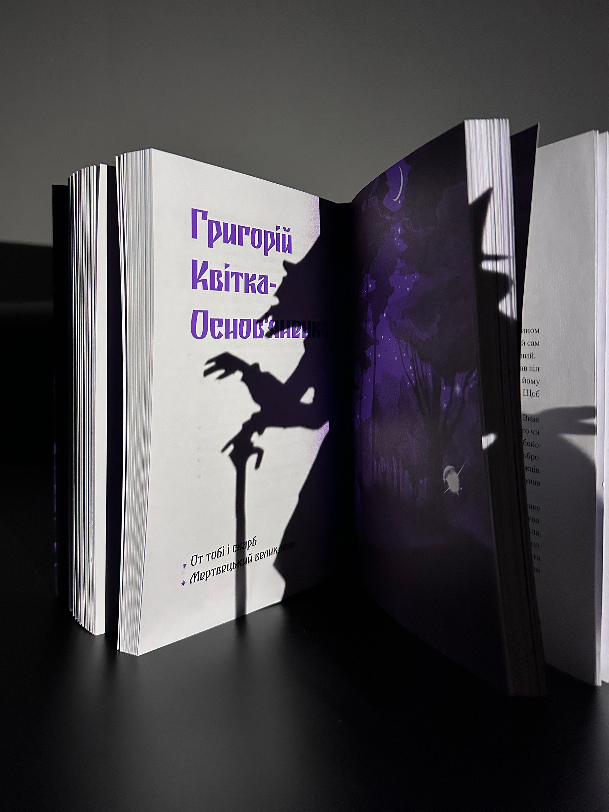 The book was designed by Anna Gavryliuk, using illustrations by Masha Foya and Sealt by Michael Rafailyk for the cover, headlines, and page numbers. The text typeface is Fiorina by Andriy Konstantynov. Фіолетова тінь was published by One more page.
