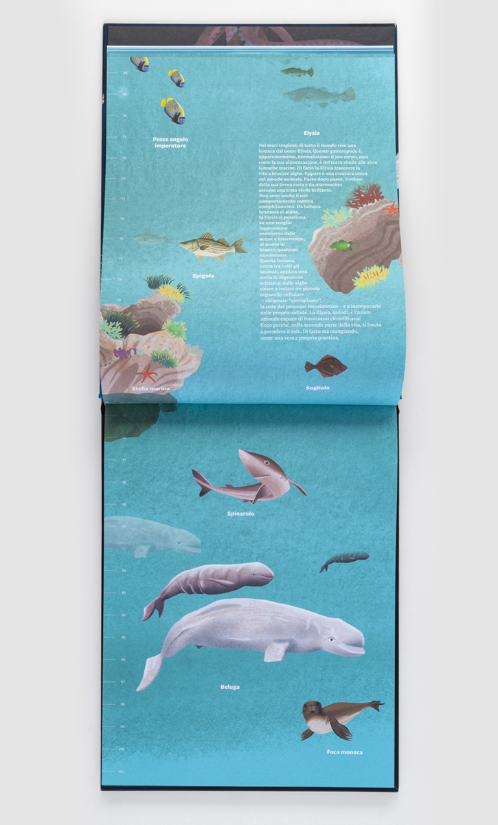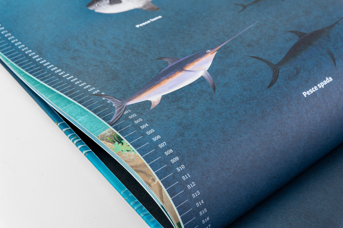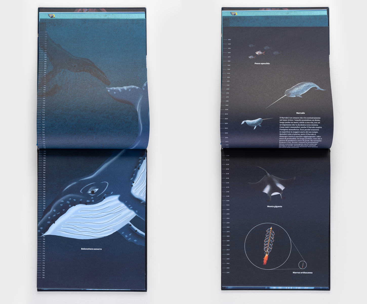 The book is leafed through vertically and this action together with a metric scale and the color of the pages, gradually darker, gives the readers the idea of descending into the depths, encountering many animals especially in the first pages, leaving room for emptiness and darkness as you go further down, to the depths of the ocean.