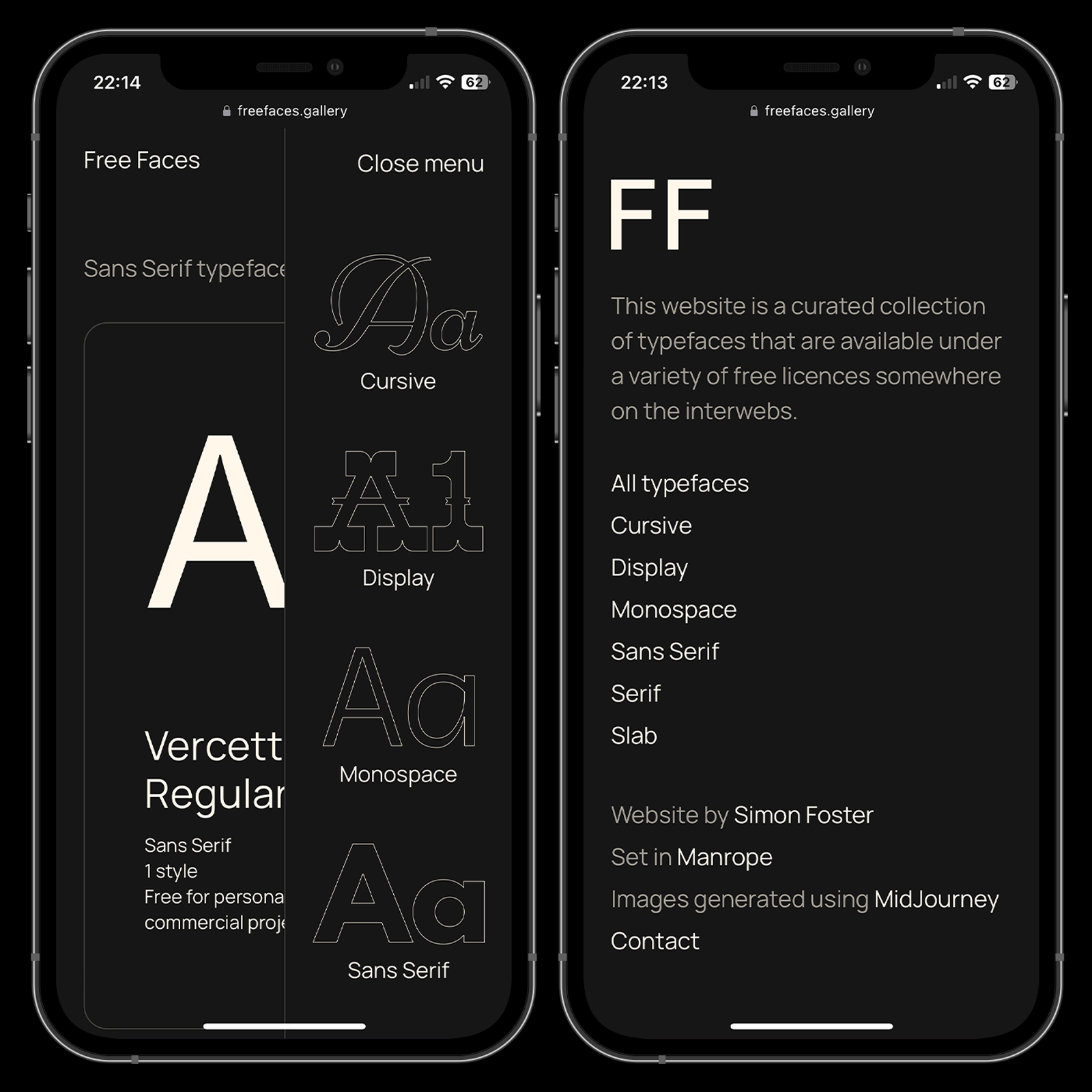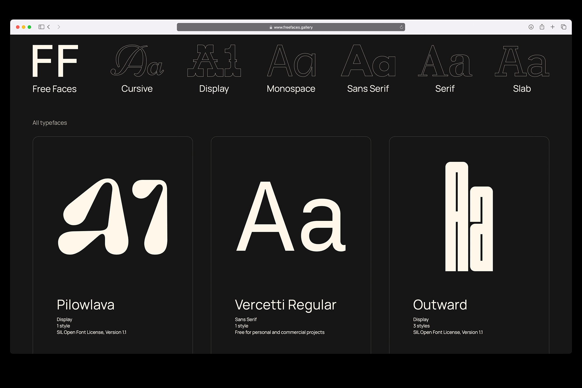 The Free Faces website, created by Simon Foster, features a variety of font styles, including sans serif, serif, slab, monospace, display and cursive. Each typeface is sourced from different parts of the web and is available for commercial use.