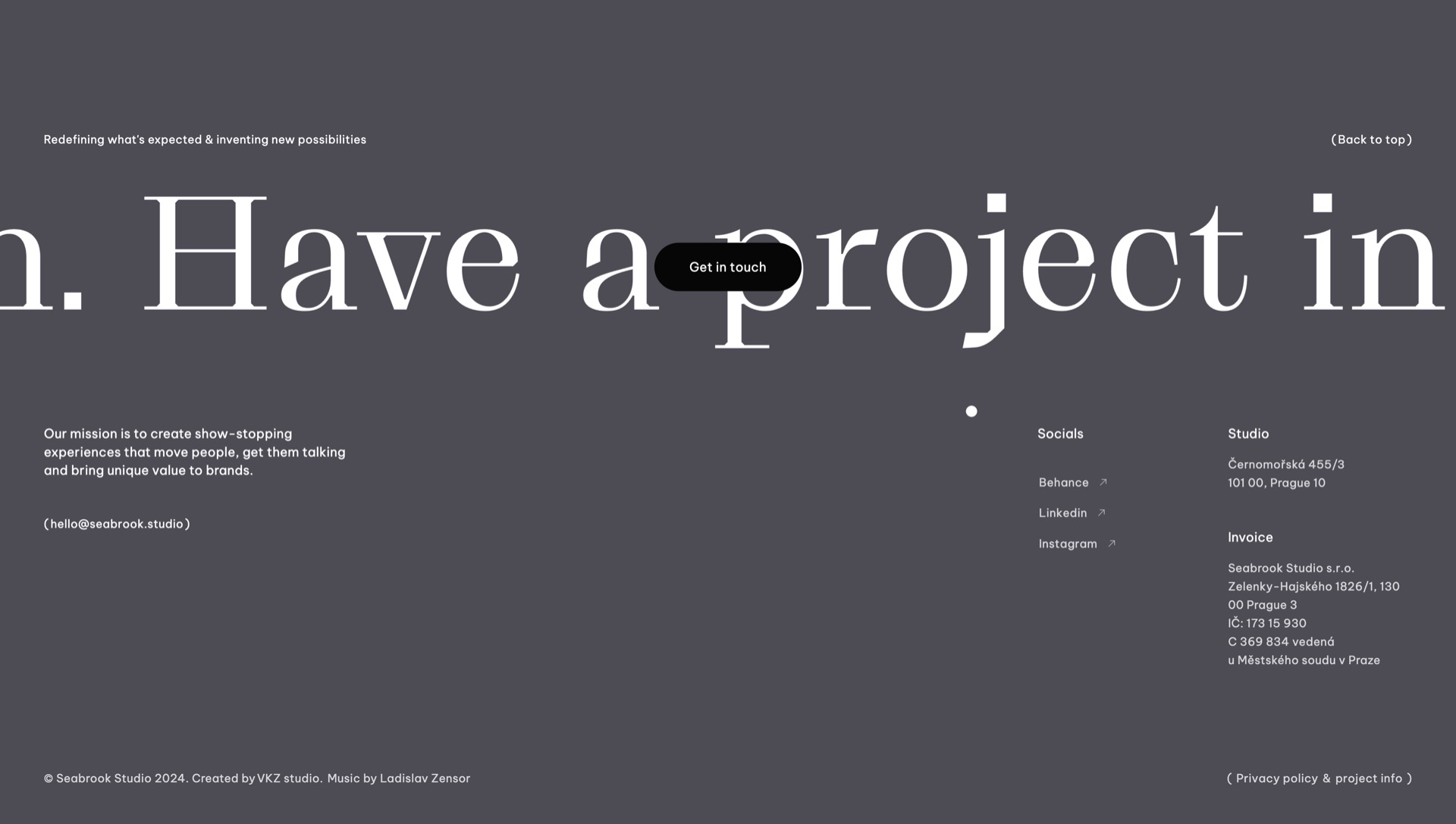 Seabrook Studio website Contributed by Alex Slobzheninov on Mar 26th, 2024. Artwork published in July 2023. Source: seabrook.studio Seabrook Studio. License: All Rights Reserved. From Prague-based VKZ Studio: The website is made for Seabrook Studio, a creative studio that builds & transforms brands. Using cutting-edge technology, we brought their mission of reinvention to a digital space. Seabrook Studio describes themselves as follows: Our mission is to create show-stopping experiences that move people, get them talking and bring unique value to brands. Source: seabrook.studio Seabrook Studio. License: All Rights Reserved. Source: seabrook.studio Seabrook Studio. License: All Rights Reserved. Source: seabrook.studio Seabrook Studio. License: All Rights Reserved. Source: seabrook.studio Seabrook Studio. License: All Rights Reserved. Source: seabrook.studio Seabrook Studio. License: All Rights Reserved. Source: seabrook.studio Seabrook Studio. License: All Rights Reserved. Source: seabrook.studio Seabrook Studio. License: All Rights Reserved. Typefaces More about GrafierGet GrafierMore about Be VietnamGet Be Vietnam Formats Web (5714) Branding/Identity (8605) Topics Services (1578) Graphic Design (3041) Designers/Agencies VKZ Studio (1) Tagged withwebsites (3653)portfolios (779)design studios/agencies (497)big type (1744)menus (UI) (583) Artwork location Czech Republic (295) Prague (172) Post a comment Name Email – will not be published Website Your response Submit Comment More Grafier in use Generative Gallery website2020Anna NefiodkinaContributed by Adelina Shaydullina Cuenca – Debajo de la segunda farolac. 2020Péter MorvaiContributed by Péter Morvai Mujeres arquitectas de Santa Fe poster2019Emilia TonelloContributed by Emilia Tonello Sponsor More in Services David Shepard brandingc. 2022Boyle Design GroupContributed by Max Phillips Wagtimec. 2024Studio Ping PongContributed by Studio Ping Pong PuppSync2013Karen MessingContributed by Village Nicole Nero website2024Zane KrumanockerKrum MarketingContributed by Zane Krumanocker More in Web PSW Engineeringc. 2018diesdas.digitalTom KleinLars KrügerContributed by Revolver Type Foundry Plural2022SpinContributed by harrison marshall Nike members only sale ads2024unknownContributed by Claire Shin Design Census 20162017Google DesignContributed by Love Lagerkvist More Fonts In Use Diet for the Atomic Age by Sara Shannon (Belarus, 1991)1991unknownI. SlavyaninContributed by Alex Chumak Staff Pick The Mother Knot by Jane Lazarre (McGraw Hill, 1976; Dell, 1977)1976unknownContributed by Florian Hardwig Staff Pick House number for Bink362009Studio Het MesContributed by Matthijs Sluiter Staff Pick Dexter logo and titles2006Don McNeillDigital KitchenJosh BodnarContributed by Stephen Coles Staff Pick