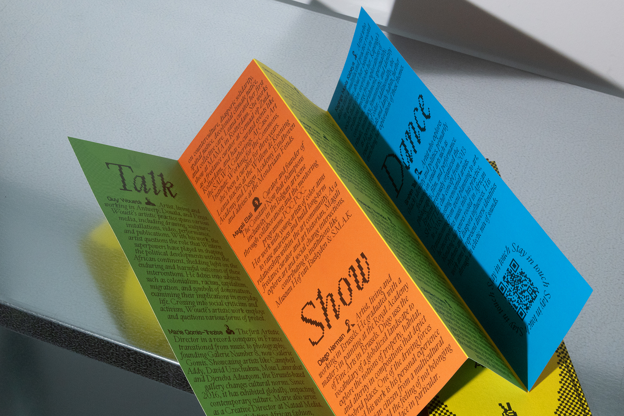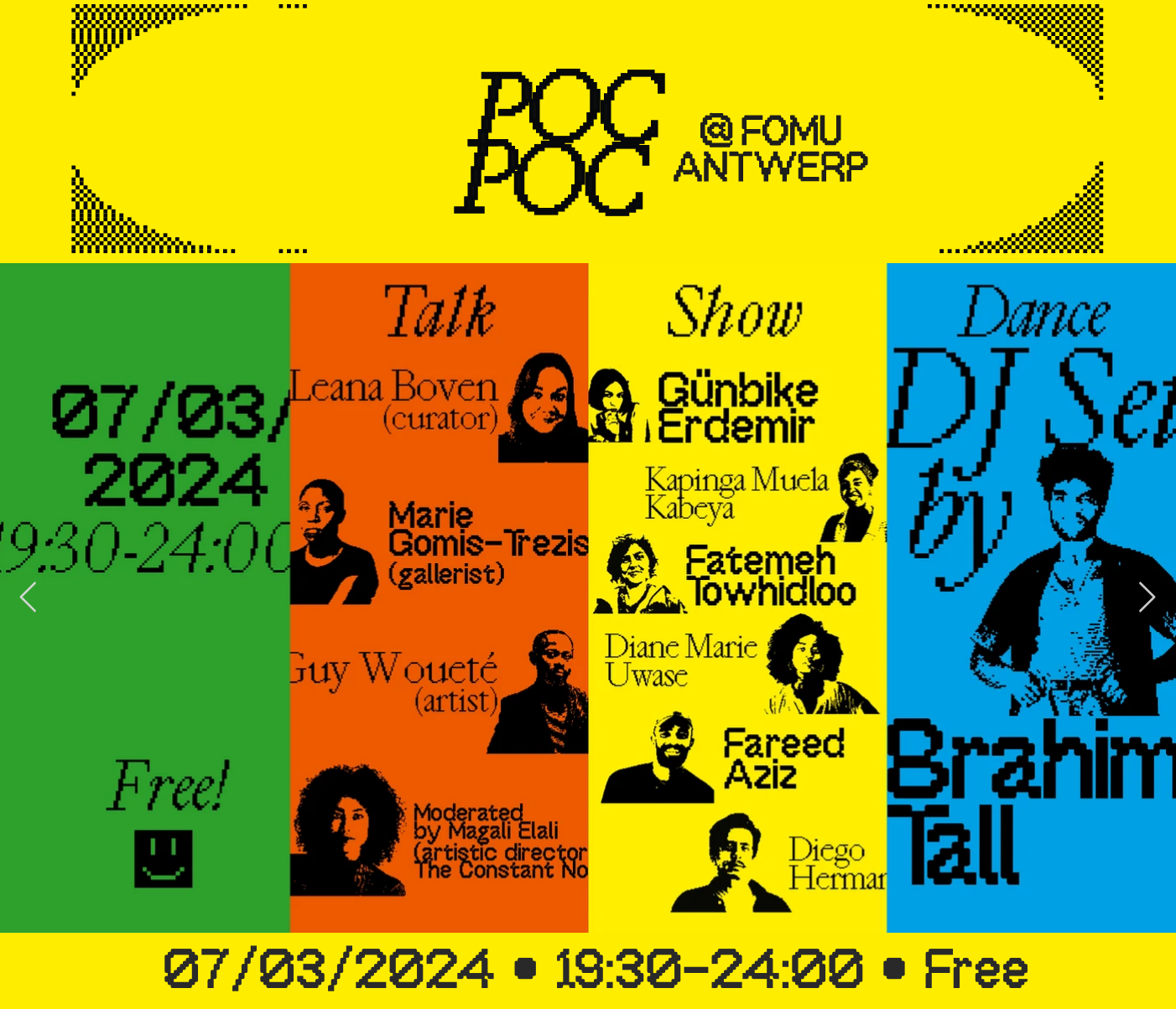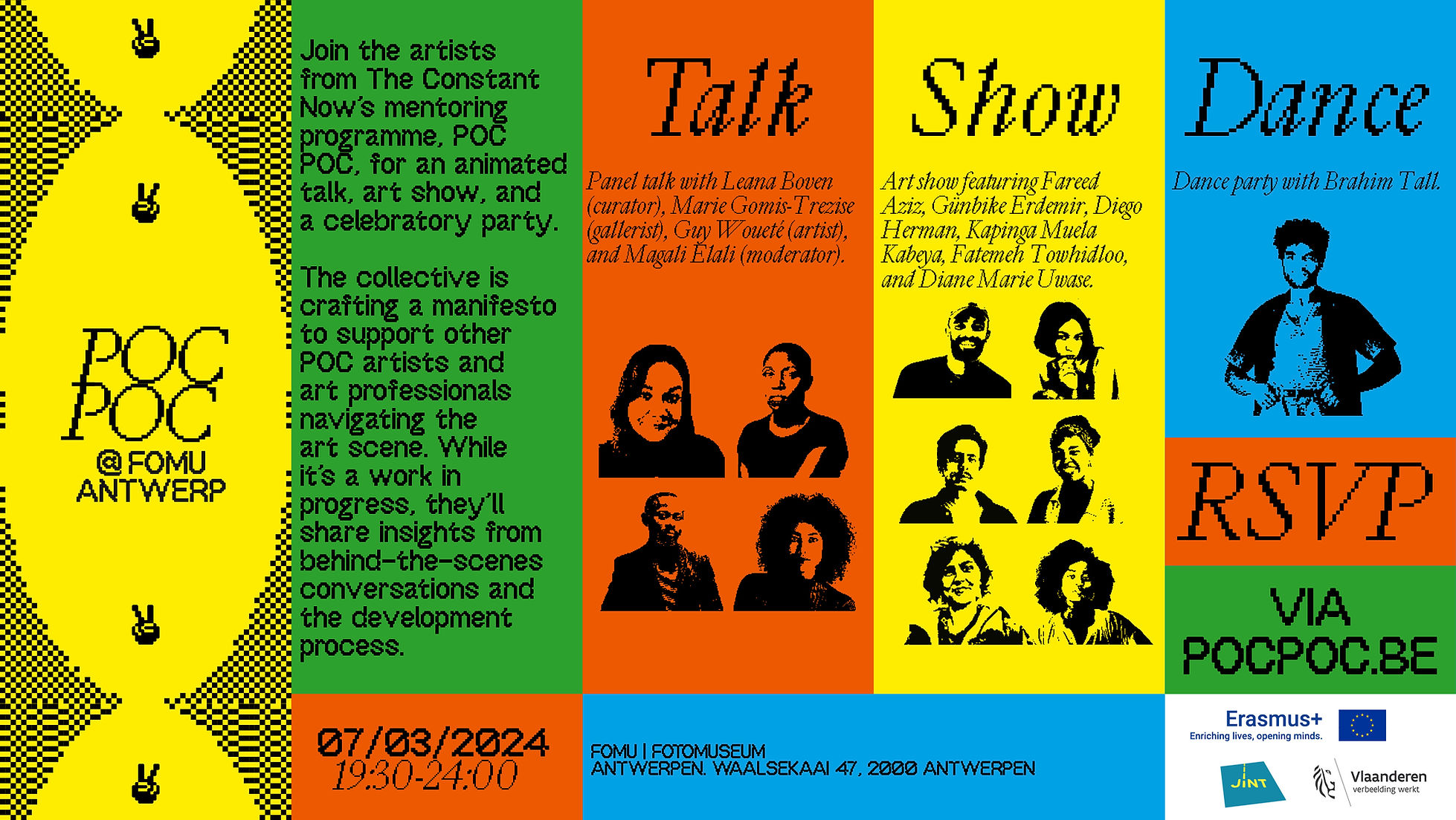 Featured in this post is visual material designed by Elali’s partner Bart Kiggen, a graphic designer, photographer and videographer running the studio Keen. It advertises a special event held at FOMU Fotomuseum Antwerp on March 7, 2024. The graphic concept combines black-and-white portraits of the participants in a high-contrast xerox look with vibrant bright colors: yellow, green, blue, and orange red.