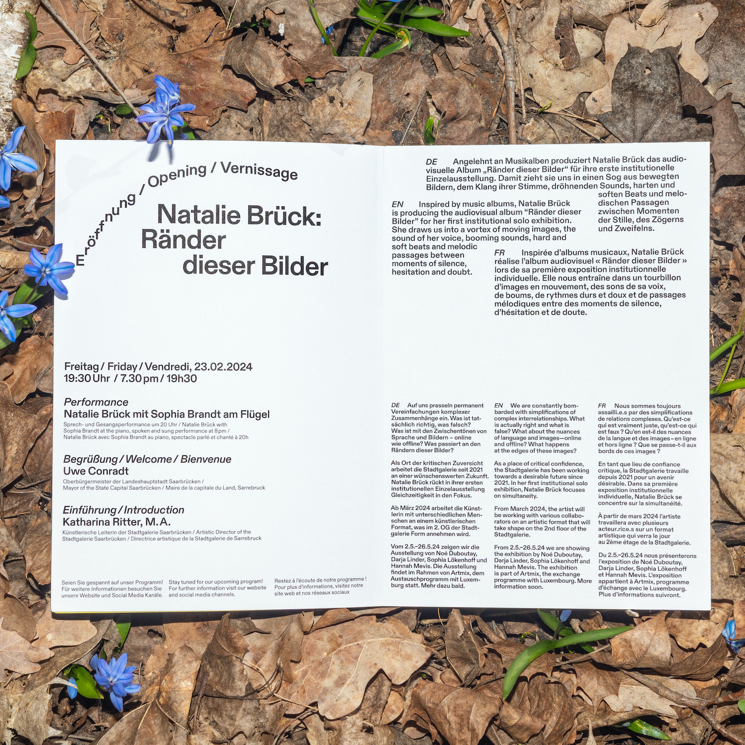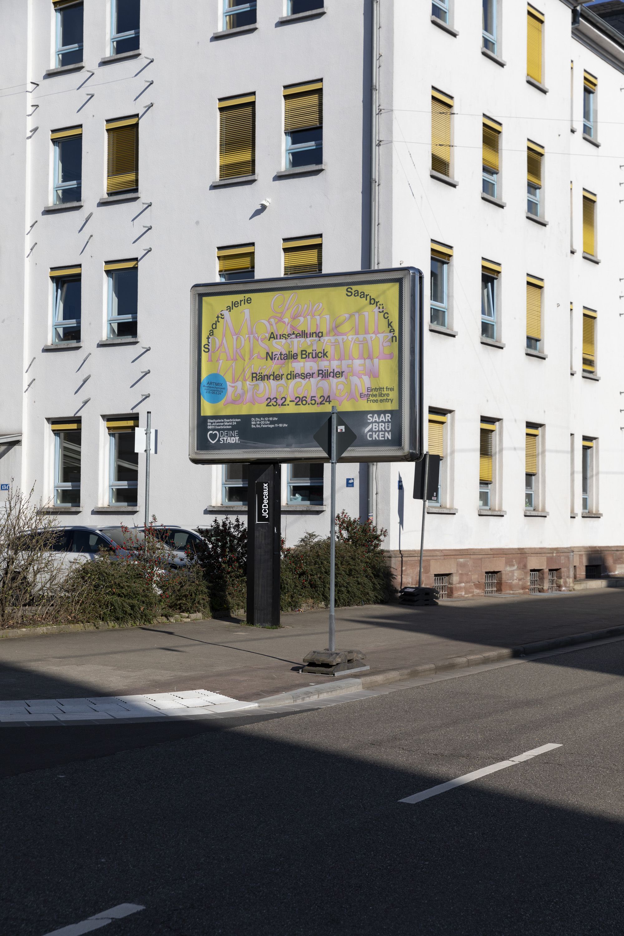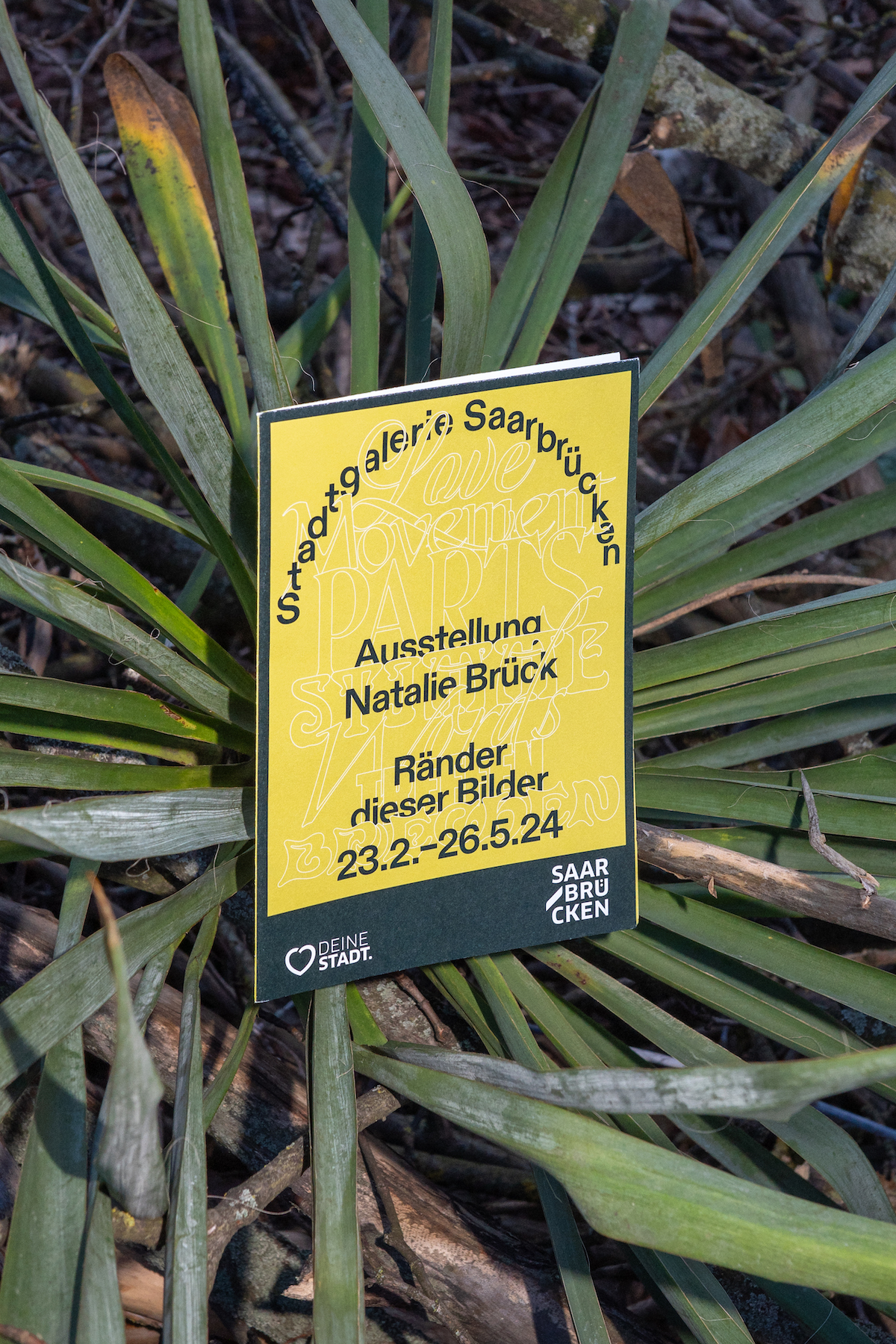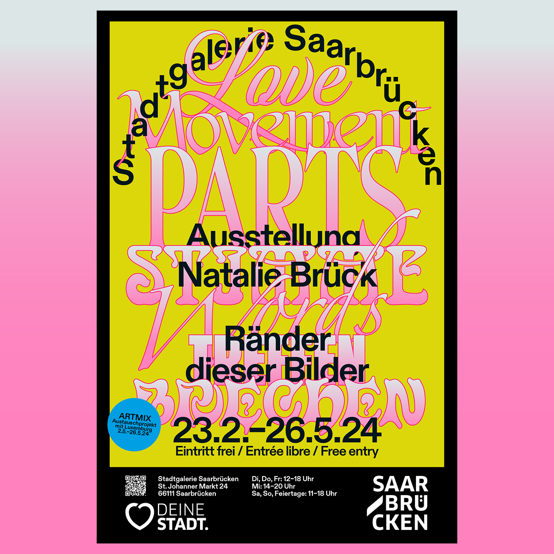 This exhibition is also the first to use the new identity of Stadtgalerie Saarbrücken featuring of ABC Diatype from Dinamo. The arched type of the logo is a reference to the architecture of the inner courtyard.