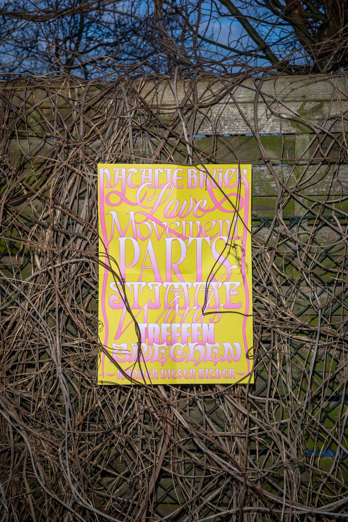 Several fonts make an appearance for the tracklist to her album which is used as a key visual for posters, invitations and other media. Every song title gets its own typographical voice, sometimes kitschy, sometimes tough, and is intertwined with the others. “Love” is in Candlescript from Vast. “Movement” is set in an older version of Dykhotomos Italic by Jules Durand; Roslindale is used for “Parts” by David Jonathan Ross and distributed via his Font of the Month Club – as is his Bild which is used for “Treffen”. “Stimme” uses Arnold Böcklin; “Words” is set in Zapfino; “Brechen” in an unreleased typeface by myself.