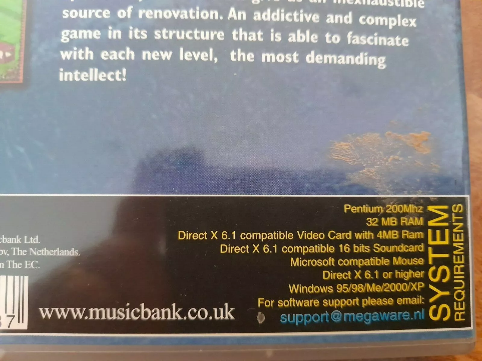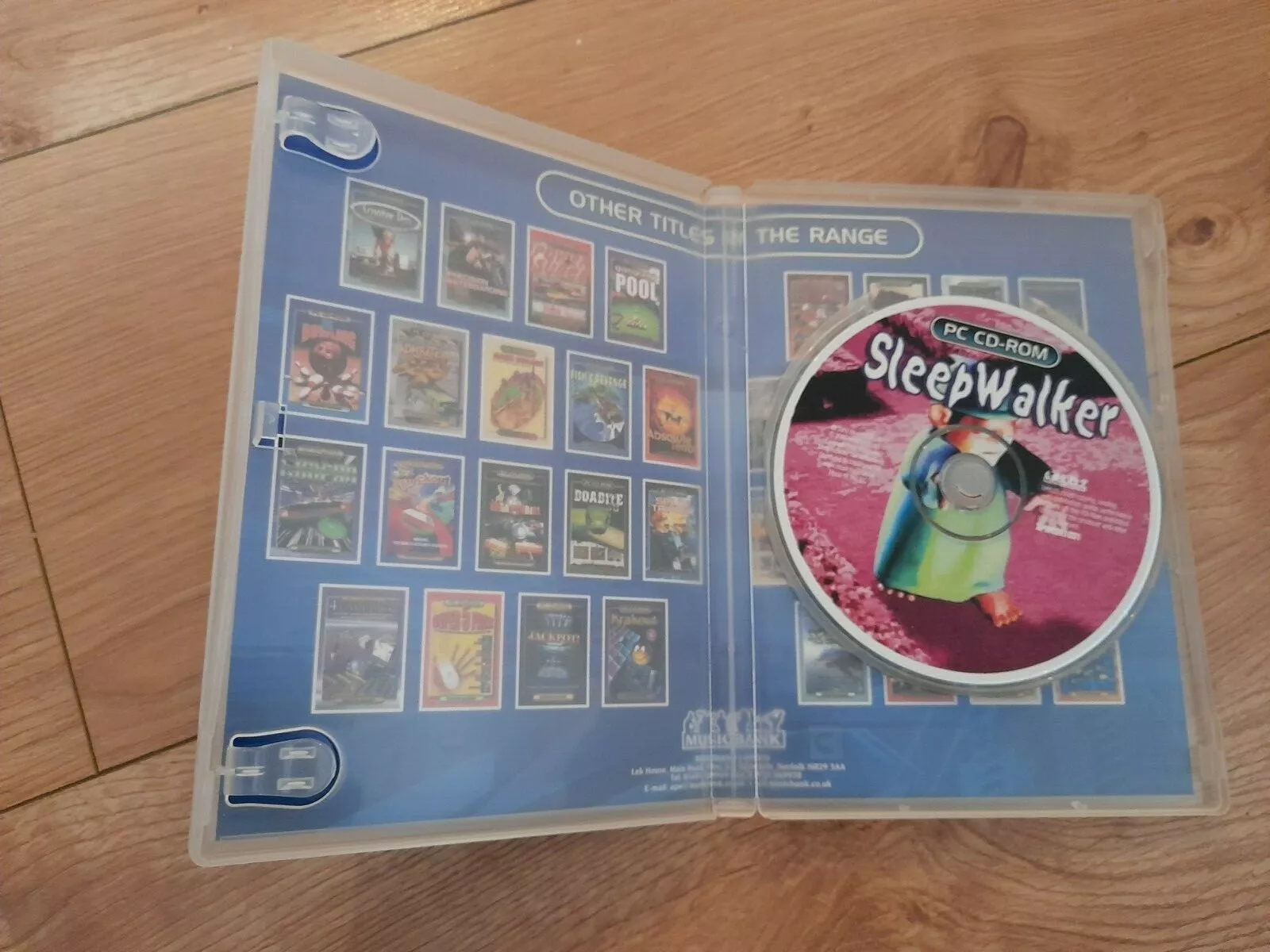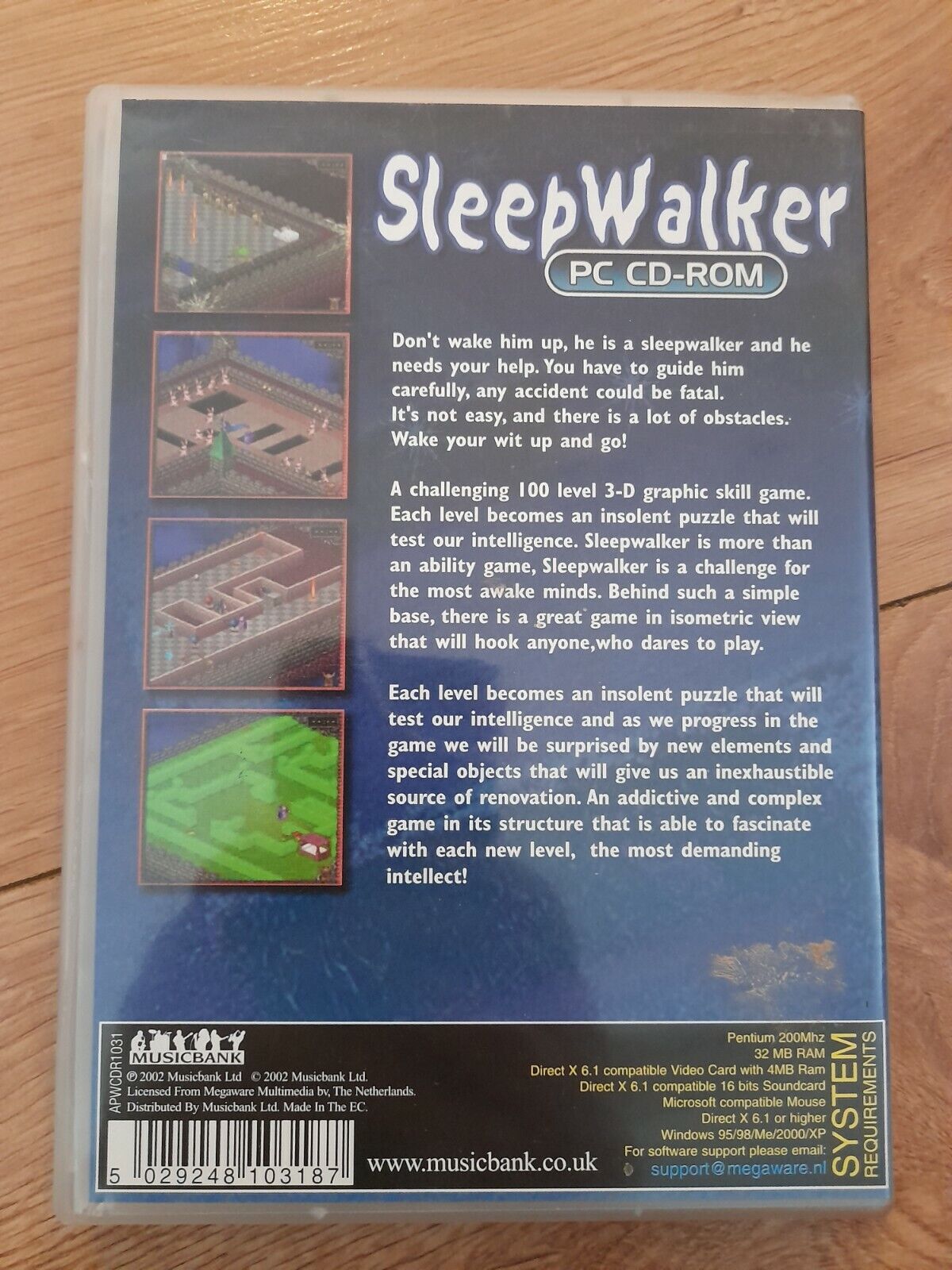 SleepWalker, published in 2002 by Musicbank, is a game in which the player guides a sleepwalker while avoiding waking him up. The game is compatible with Windows 98/ME/XP. The packaging front uses Sand for “SleepWalker” and “Don’t wake him up! He is a sleepwalker… and he needs your help.” and Handel Gothic for “PC CD-ROM” and “WINDOWS 98/ME/XP”. The description uses Gill Sans. The system requirements are in Helvetica.