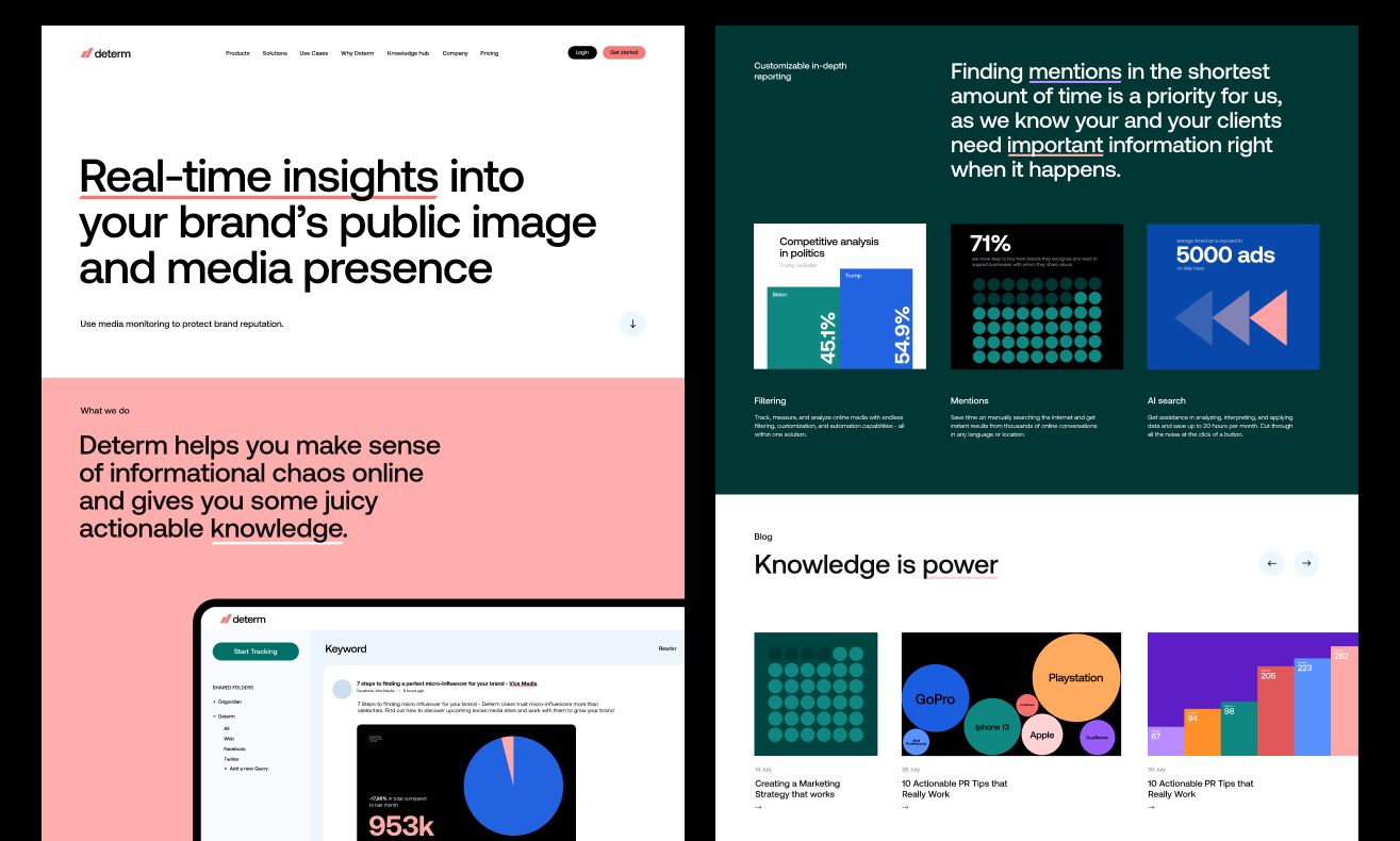 Studio Size crafted a holistic brand identity for Determ, an AI-powered media monitoring tool previously known as Mediatoolkit. The new name ‘Determ’ suggests that the tool aids users in determining relevant information, empowering them to be more determined in making decisions.