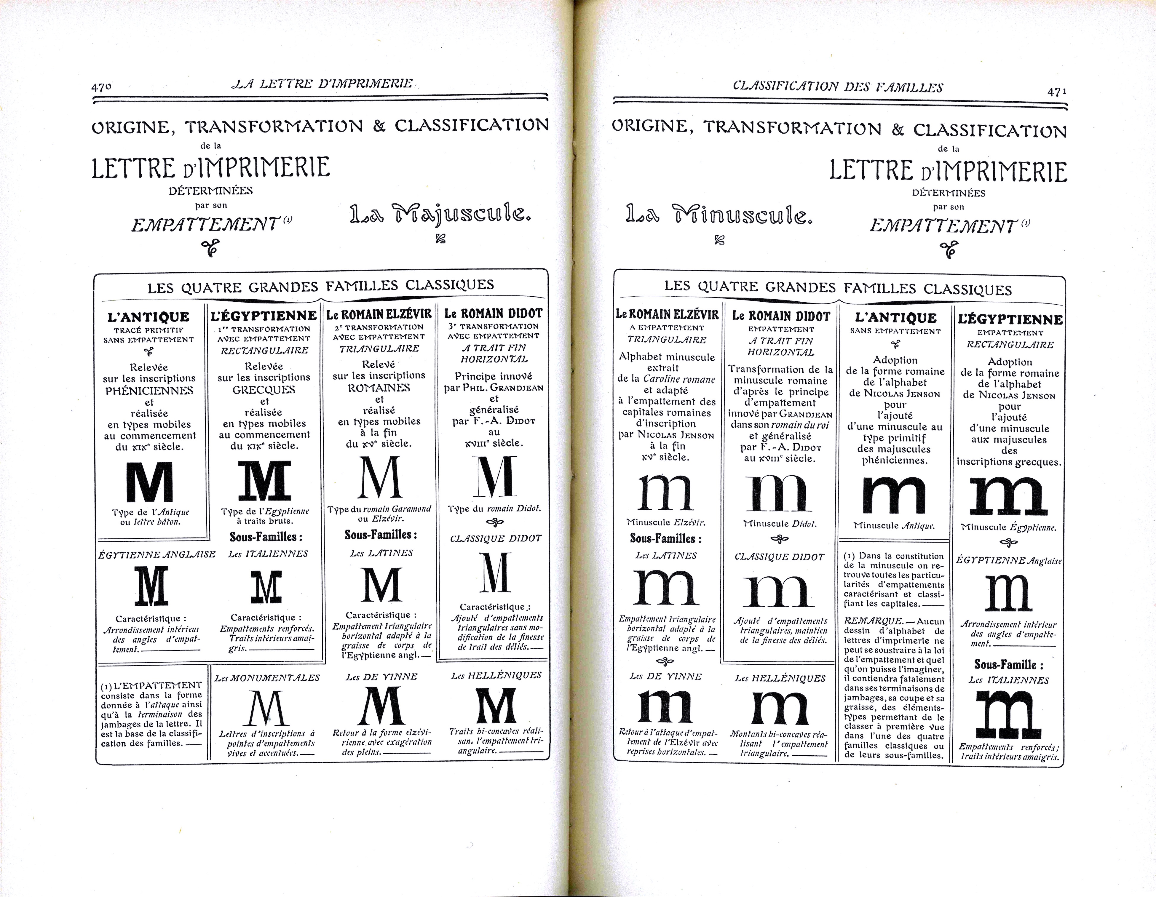 Francis Thibaudeau published two major works in the early 1920s that were important contributions to type history: La Lettre d’imprimerie, a two-volume set from 1921; and Manuel français de typographie moderne, its 1924 follow-up. The first of these was one of the first attempts to categorize typeface designs more systematically. Thibaudeau constructed a matrix of categories based on the shape of the serif.