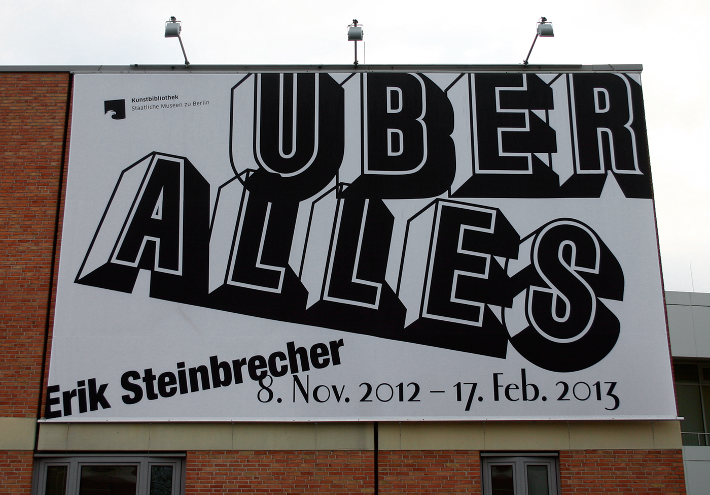 Uber Alles by Erik Steinbrecher Contributed by Florian Hardwig on Feb 15th, 2014. Artwork published in 2012. Photo: Florian Hardwig. License: CC BY-NC-SA. Banner at the Kunstbibliothek Berlin for the Uber Alles exhibition by Swiss artist Erik Steinbrecher Typefaces More about BuxomGet BuxomMore about Helvetica CondensedGet Helvetica CondensedMore about ITC LunaGet ITC Luna Formats Signs (2187) Topics Art (4789) Designers/Agencies unknown (4274) Tagged withbanners (376)art exhibitions (893)black and white (2045)only type (1297)Erik Steinbrecher (1)type on an angle (1364)overlapping type (350)XXL type (134)Kunstbibliothek Berlin (4)Staatliche Museen zu Berlin (16) Artwork location Germany (3930) Berlin (1167) In SetsBerlin Street Type (Florian Hardwig) (162)RADIOGIAPPANESE (Leonardo de la Fuente) (2878)bb (Leonardo de la Fuente) (1331) Post a comment Name Email – will not be published Website Your response Submit Comment More Buxom in use 3rd Annual 4 Wheel & Off-Road Jamboree shirt1990unknownContributed by Jack Grimes Staff Pick Dillinger – Ready Natty Dreadie album art1975unknownContributed by Matthijs Sluiter The Soft Machine by William Burroughs (Corgi Books)1970unknownContributed by Johannes Vandenheuvel Staff Pick Sponsor More in Art Chaire Arts & Sciences identity2018Baldinger•Vu-HuuContributed by BVH Type Institute of Contemporary Art, San Diego2021MiresBallContributed by MiresBall Josua Reichert: Freilich ein Handwerker, kein Derwisch1973Josua ReichertIngo MöllerContributed by Stephen Coles The Noguchi Museum2004PentagramAbbott MillerContributed by Shiva Nallaperumal Staff Pick More in Signs Leiden Discoveriesc. 2015JUSTContributed by Matthijs Sluiter Maharashtra Covid campaignc. 2022Government of IndiaContributed by Sarang Kulkarni Greene County Fairgrounds signsunknownContributed by Kyle Anderson “Serrurerie” – shop sign in ParisContributed by Inga Plönnigs More Fonts In Use TIME magazine, “The Gun in America” (1968, 1998, ?)1968Roy LichtensteinContributed by Florian Hardwig Staff Pick Collection “Écrivains de Toujours”, Éditions du Seuilc. 1954unknownContributed by Florian Hardwig Staff Pick Koschke – Woche der Kritik2018Kai BergmannMatthias NeumannContributed by Revolver Type Foundry Staff Pick Wuthering Heights2011Contributed by David Nguyen Blog
