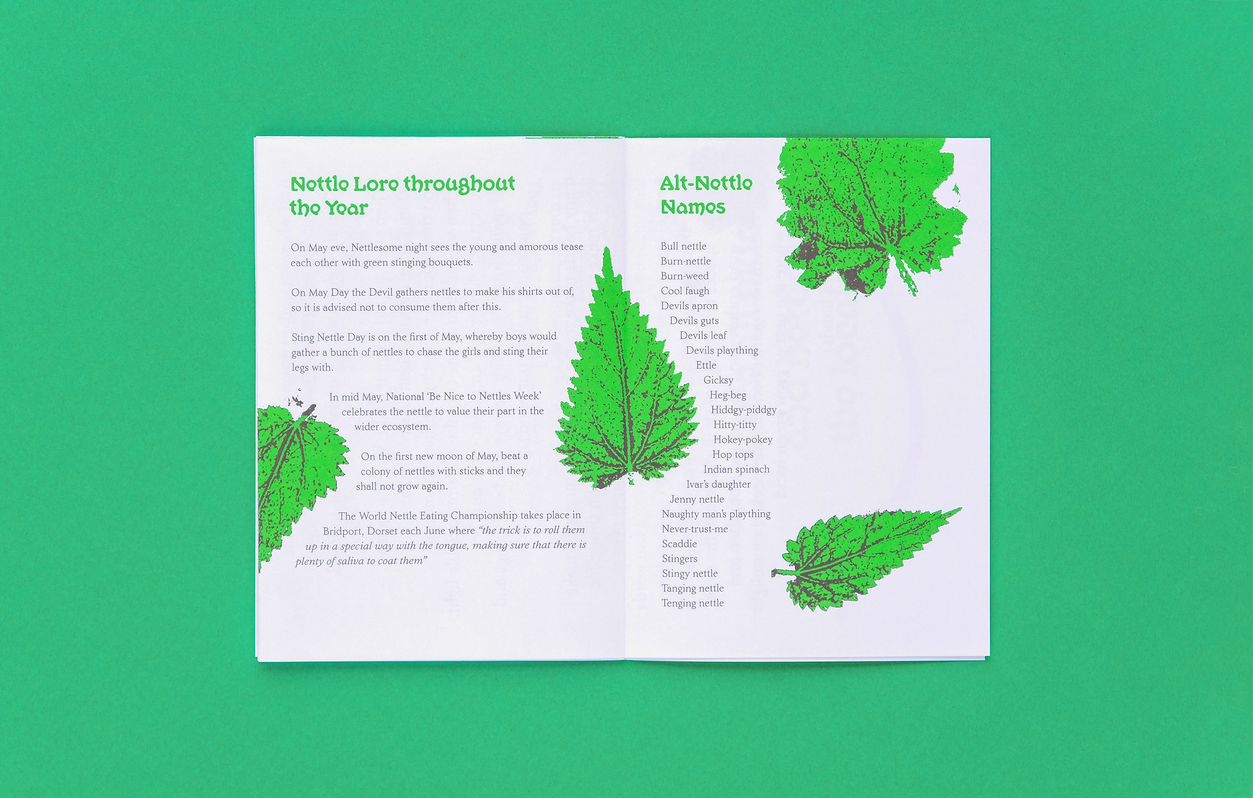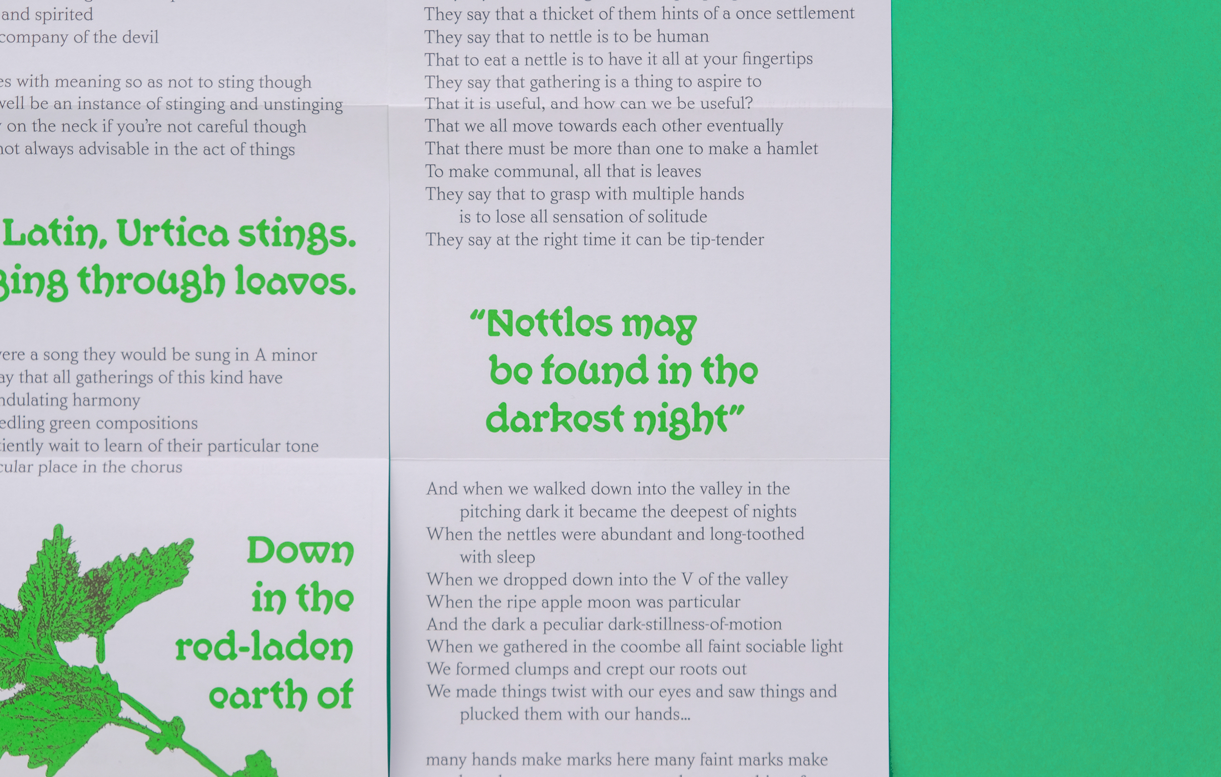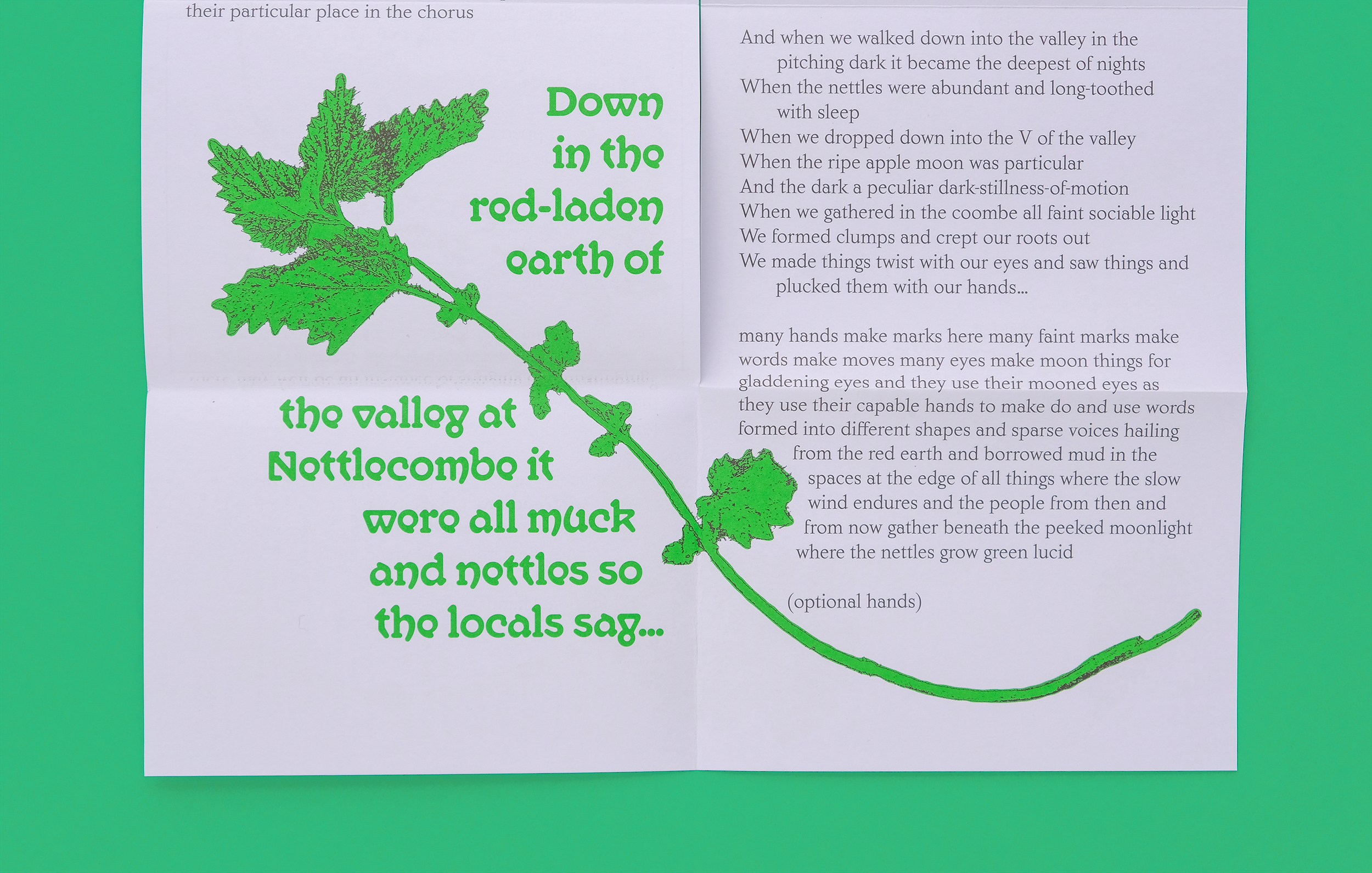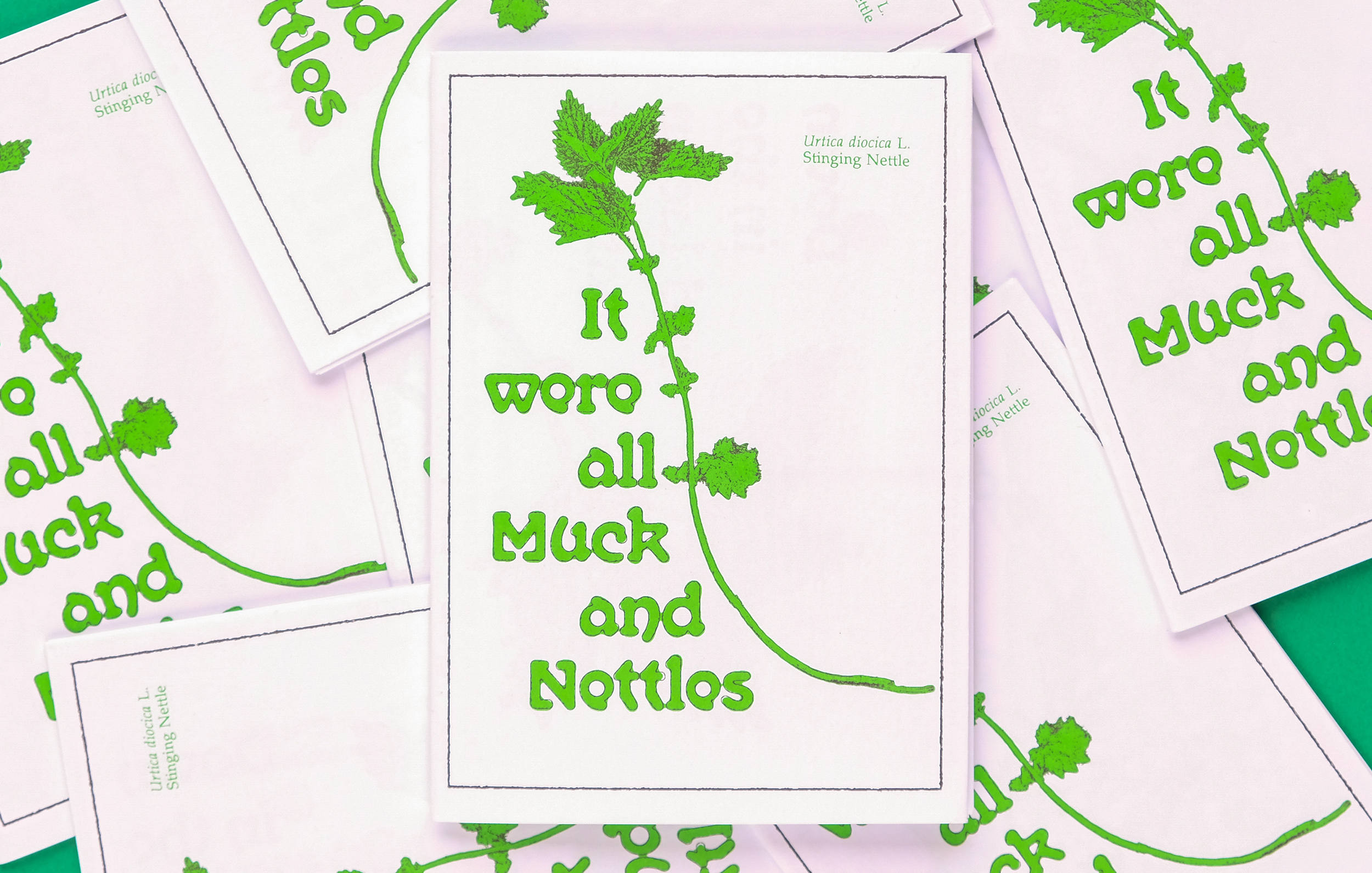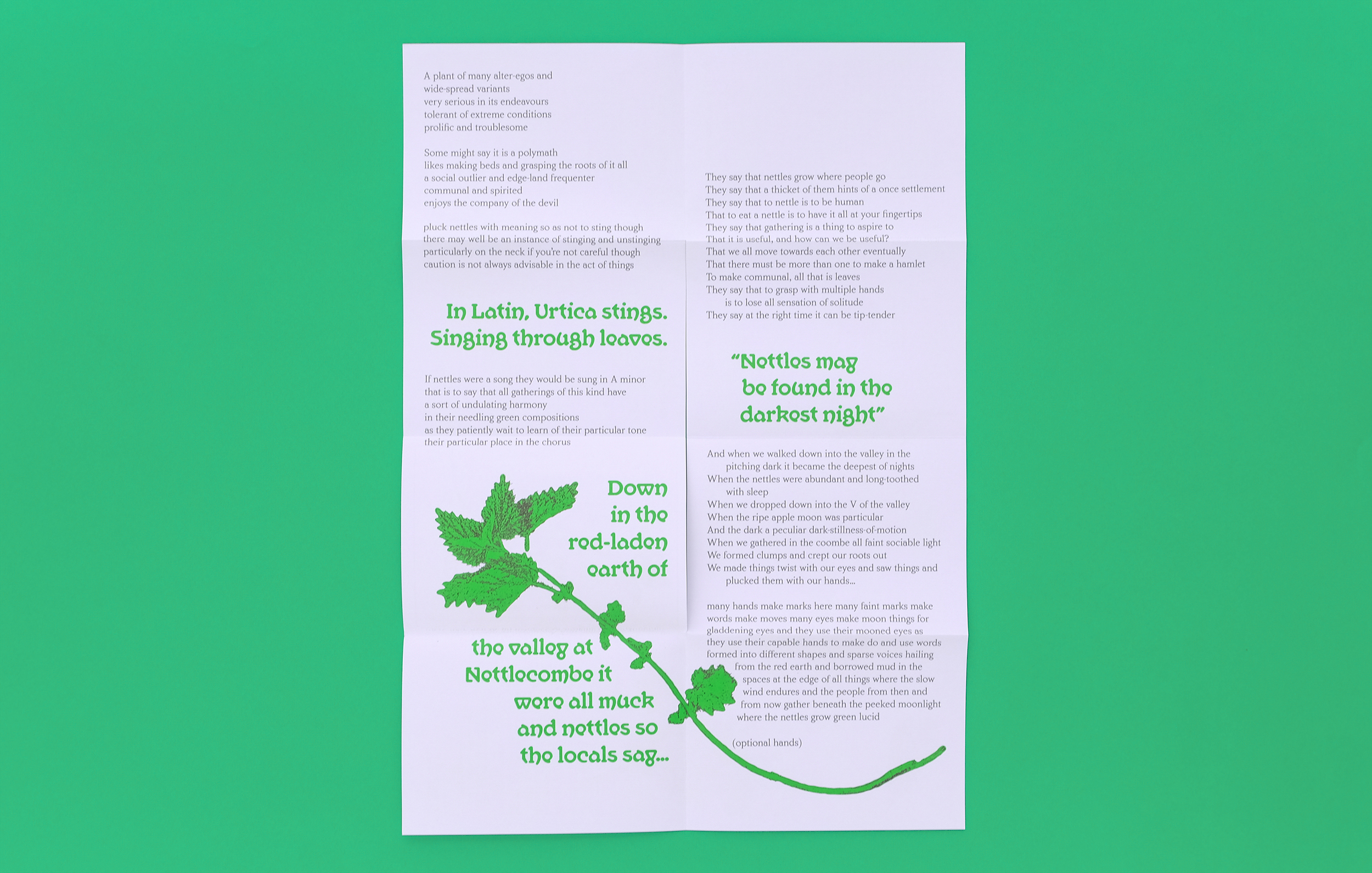 It Were All Muck & Nettles is a folded “hot dog” cut zine for artist Sam Francis as part of her People Came for Tea and Stayed Forever show at East Quay Watchet. The zine examines the use of nettles in folklore, food, magic and traditional remedies.