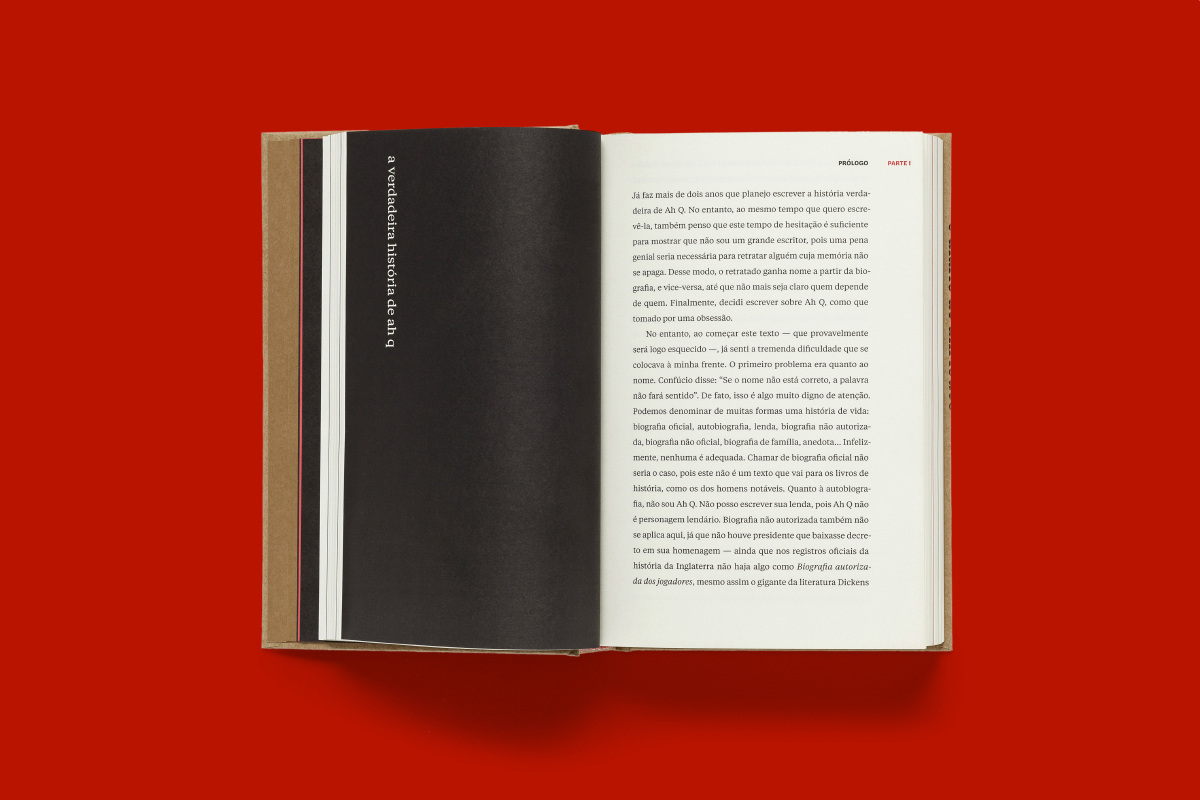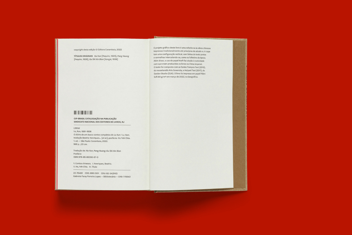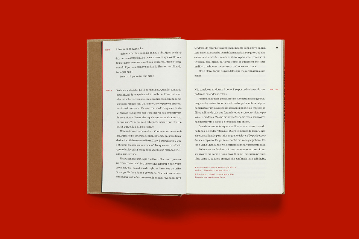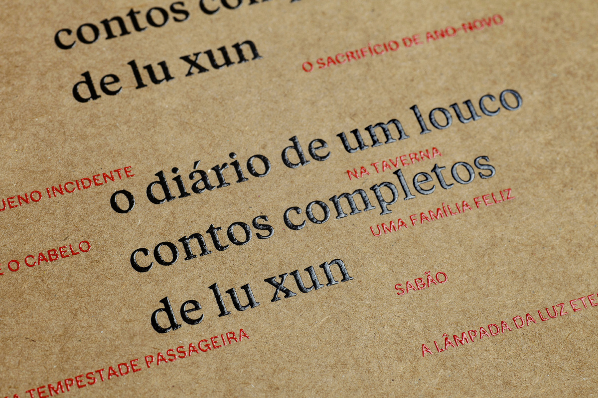 Signed by Lucas Blat and Túlio Cerquize, the graphic design of this edition is bound in hardcover with serigraphy and two-color interior. The idea was to make reference to the Chinese works traditionally printed until the beginning of the 20th century: the cover has a vertical configuration, with black and red text lines interspersed, like the serials of the time. In addition, the use of Kraft paper alludes to the rusticity with which books were produced in imperial China.