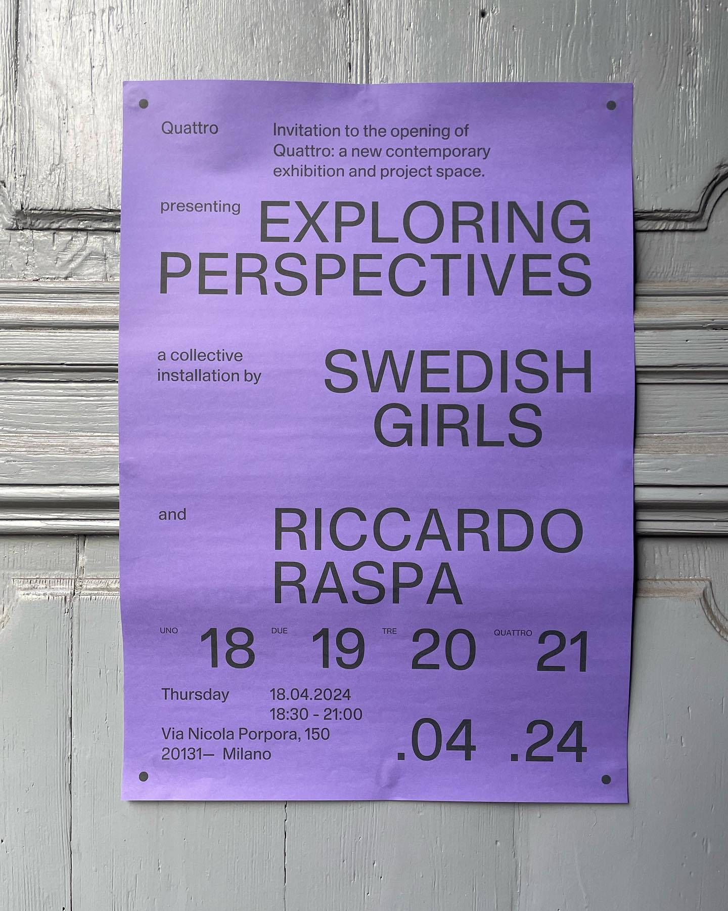 Quattro Milano is an interdisciplinary project space in Milan, shaped by its name “Quattro” anchored in the idea of brevity and intensity, where exhibitions unfolding across four days.