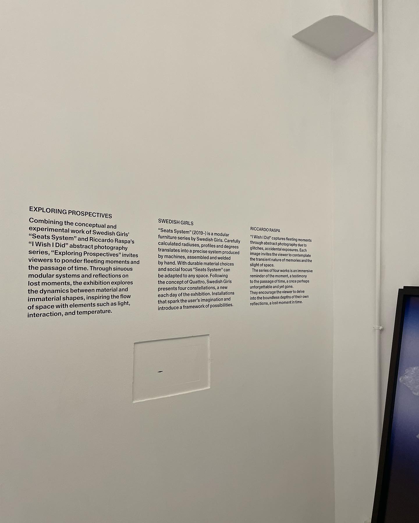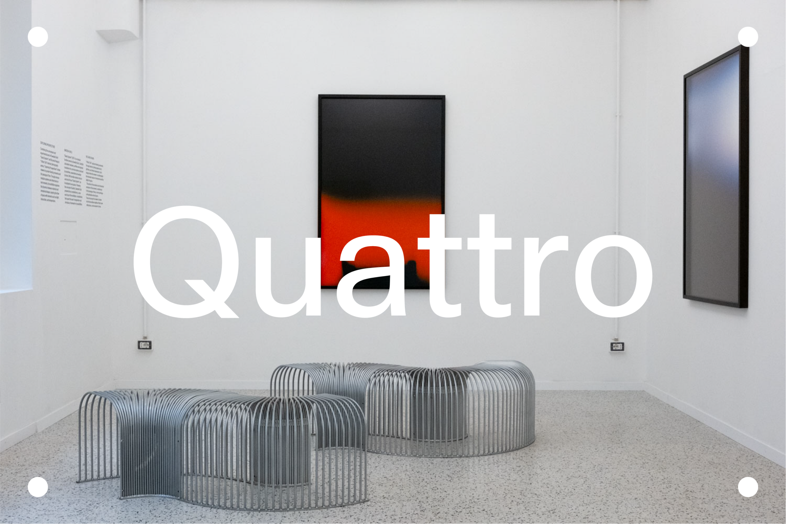 The inaugural exhibition, Exploring Perspectives, opened on April 18, 2024, with the modular Seats System by Swedish Girls and the abstract photography series I Wish I Did by Riccardo Raspa. This marked the beginning of Quattro’s commitment to short-form exhibitions that bring international and local voices into dialogue.