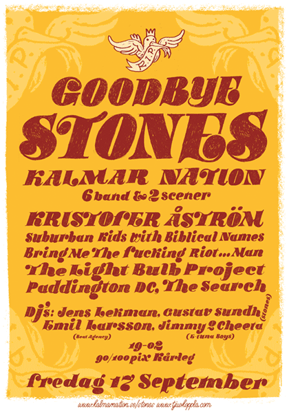 “Goodbye Stones” poster Contributed by Florian Hardwig on Feb 18th, 2014. Artwork published in 2004. Source: www.hijackyourlife.com License: All Rights Reserved. Typefaces More about StillaGet Stilla Formats Posters/Flyers (5690) Topics Music (6262) Designers/Agencies Hijack Your Life (1) Tagged withconcert & gig posters (508)yellow (400)lettering derived from typeface (732) Artwork location Sweden (440) In SetsFonts I Like (Bijou K) (102) 2 Comments on ““Goodbye Stones” poster” Florian Hardwig says: Feb 18th, 2014 8:19 pm So far, all our Uses featuring Stilla are not directly typographic, but have gone through a filter of some sort. Stephen Coles says: Feb 18th, 2014 11:34 pm Or embroidered! Post a comment Name Email – will not be published Website Your response Submit Comment More Stilla in use The Bangs flyer1982Susanna HoffsContributed by Herb Lubalin Study Center U&lc, Vol. 1 #2, 19741974Herb LubalinContributed by Stéphane Darricau Staff Pick Milton Wright – Friends and Buddies album art1975Drago FernandezContributed by CJ Dunn Sponsor More in Music Benny Goodman: Sextet Session1946George MaasContributed by Stephen Coles Frank Lowe – Doctor Too-Much album art1977Norman G. Goben, Jr.Contributed by Robert Beatty Groovy Goodies album art1964unknownContributed by Florian Hardwig Chuck Berry’s Greatest Hits album art1964Don BronsteinContributed by Florian Hardwig More in Posters/Flyers Zero Dark Thirty Movie Posters2012BLT CommunicationsIgnitionDominic SmithContributed by Stephen Coles Unfathomable film festival2024Polina BoroninaContributed by Polya Boronina Robotics Camp2016CipmannContributed by Nina Raimann Mads Nørgaard identityc. 2014e-TypesContributed by Playtype Foundry More Fonts In Use Marsden Hartley: The German paintings 1913–1915 at Neue Nationalgalerie2014Thoma+SchekorrContributed by Florian Hardwig Staff Pick Demain l’école d’art2016Alaric GarnierContributed by Quentin Schmerber Staff Pick Takao Rock2018Onion DesignContributed by Gareth Hague Staff Pick Adieu Vieille Europe by François Wavre and Chris Gautschi2018Chris GautschiFrançois WavreContributed by Swiss Typefaces Staff Pick