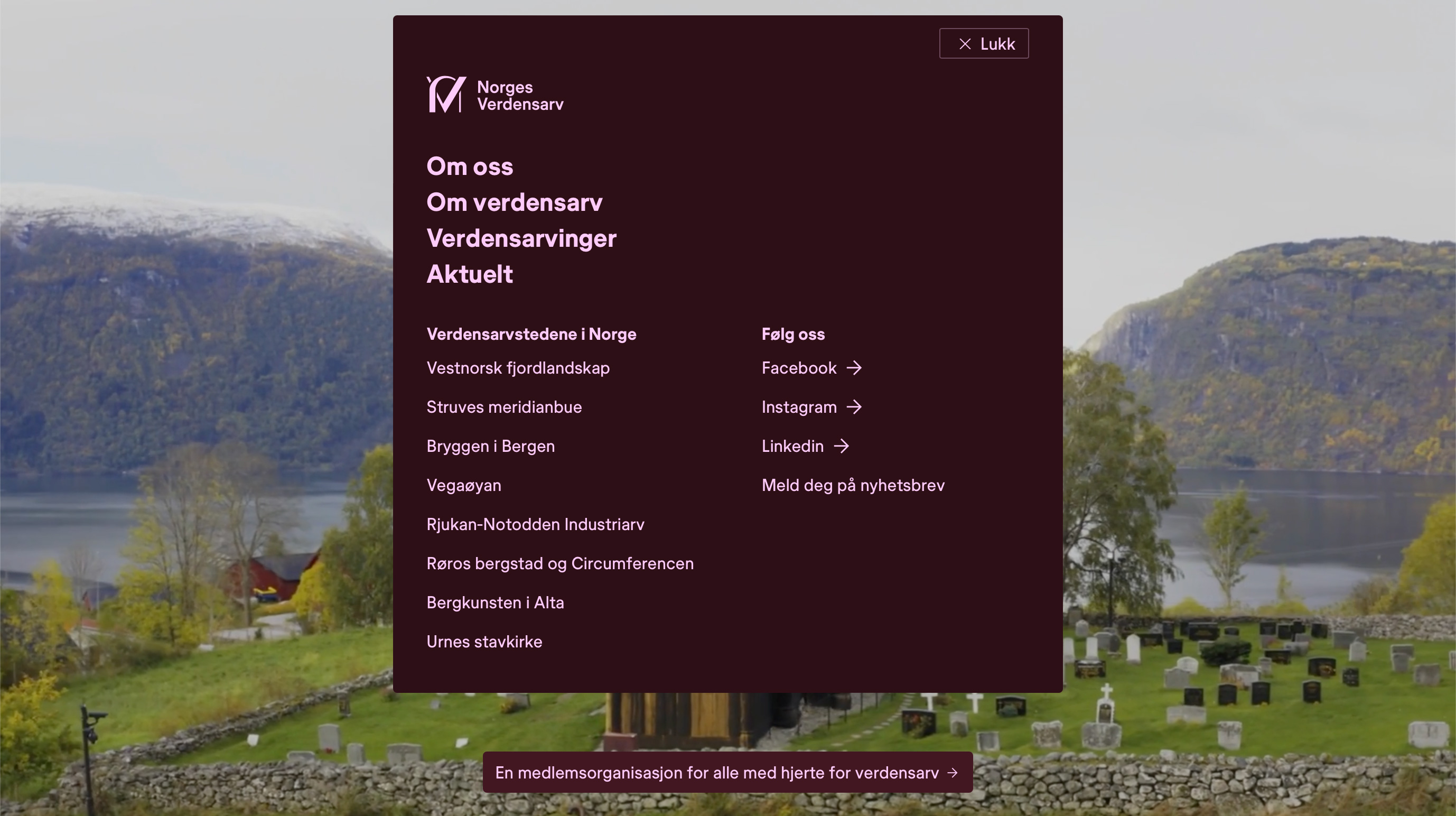 Norges Verdensarv (Norwegian World Heritage Centre) is an organisation that aims to safeguard and promote the common interests of the Norwegian World Heritage sites and contribute to their conservation and development in accordance with the UNESCO World Heritage Convention and best practice.