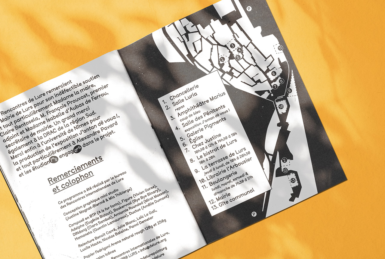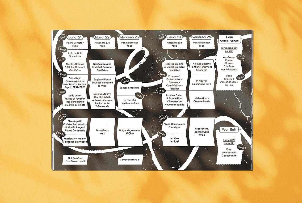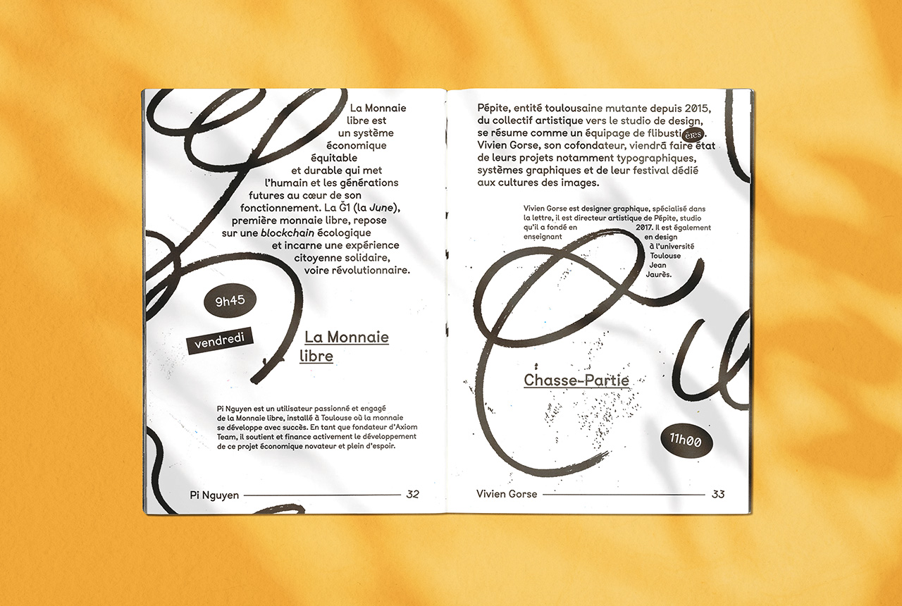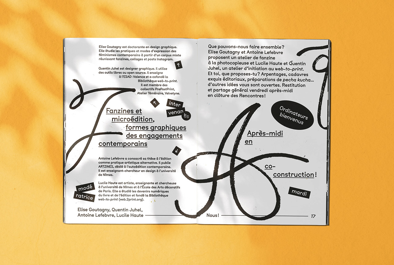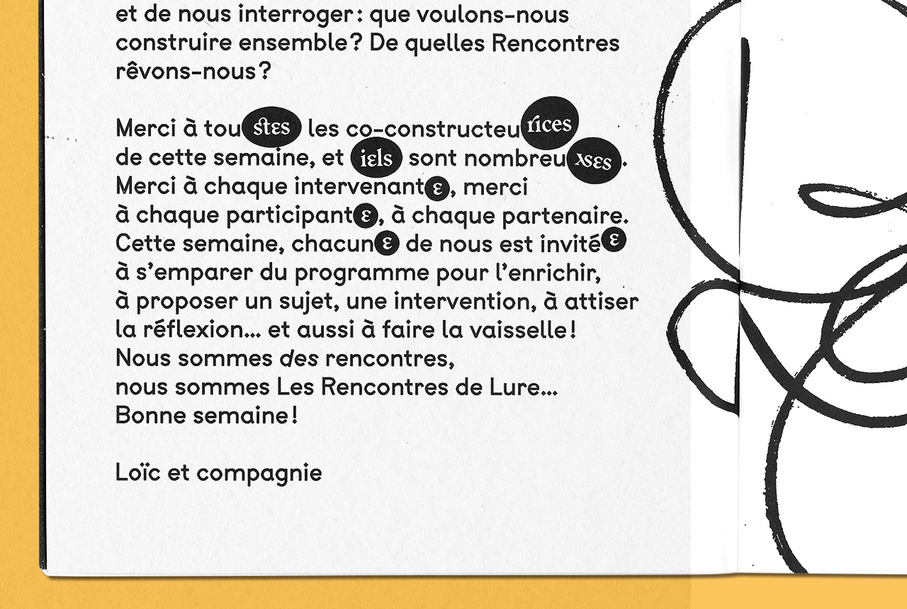 The programme was created fanzine-style to echo the idea of collective work, which was the central theme of last year’s session: copy machine look, rough hand-drawn letters, very simple hierarchy, a single font family (BTP from A is for fonts) and minimum size variation. However, since diversity and inclusivity were also a strong subject, several inclusive glyphs from various fonts can be found everywhere as little stickers stuck where needed in the text. The goal was to make them voluntarily visible and disruptive, as a mockery of criticism about their legibility or discretion in texts.