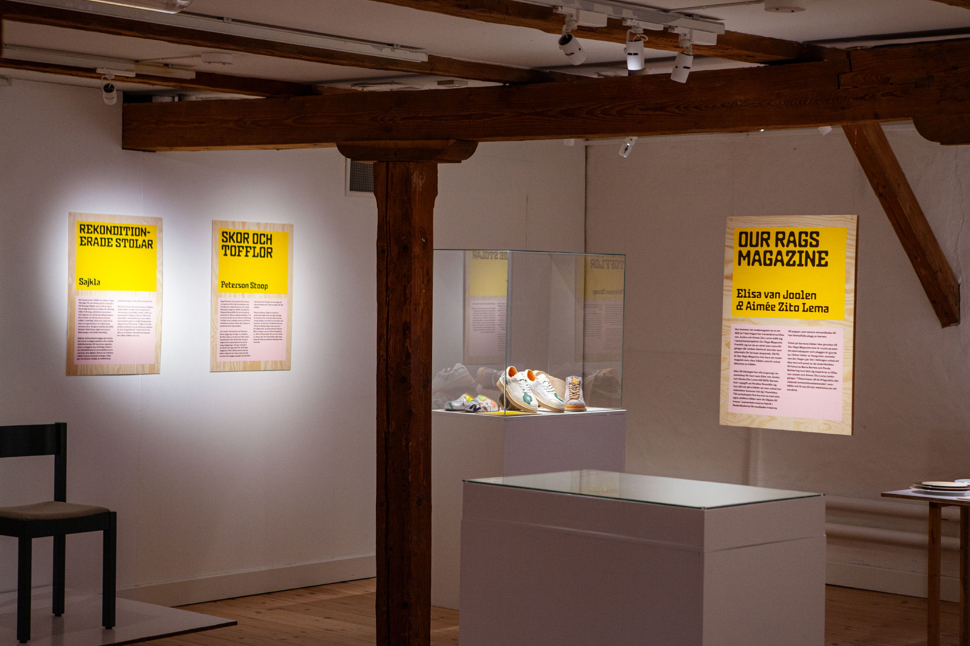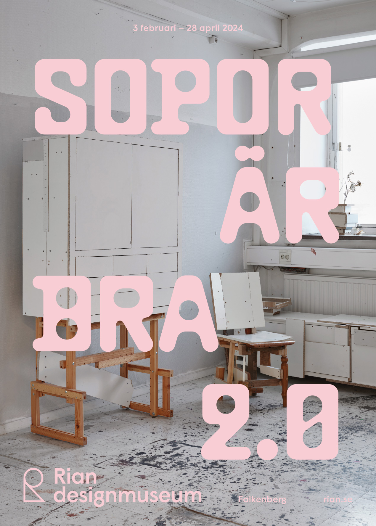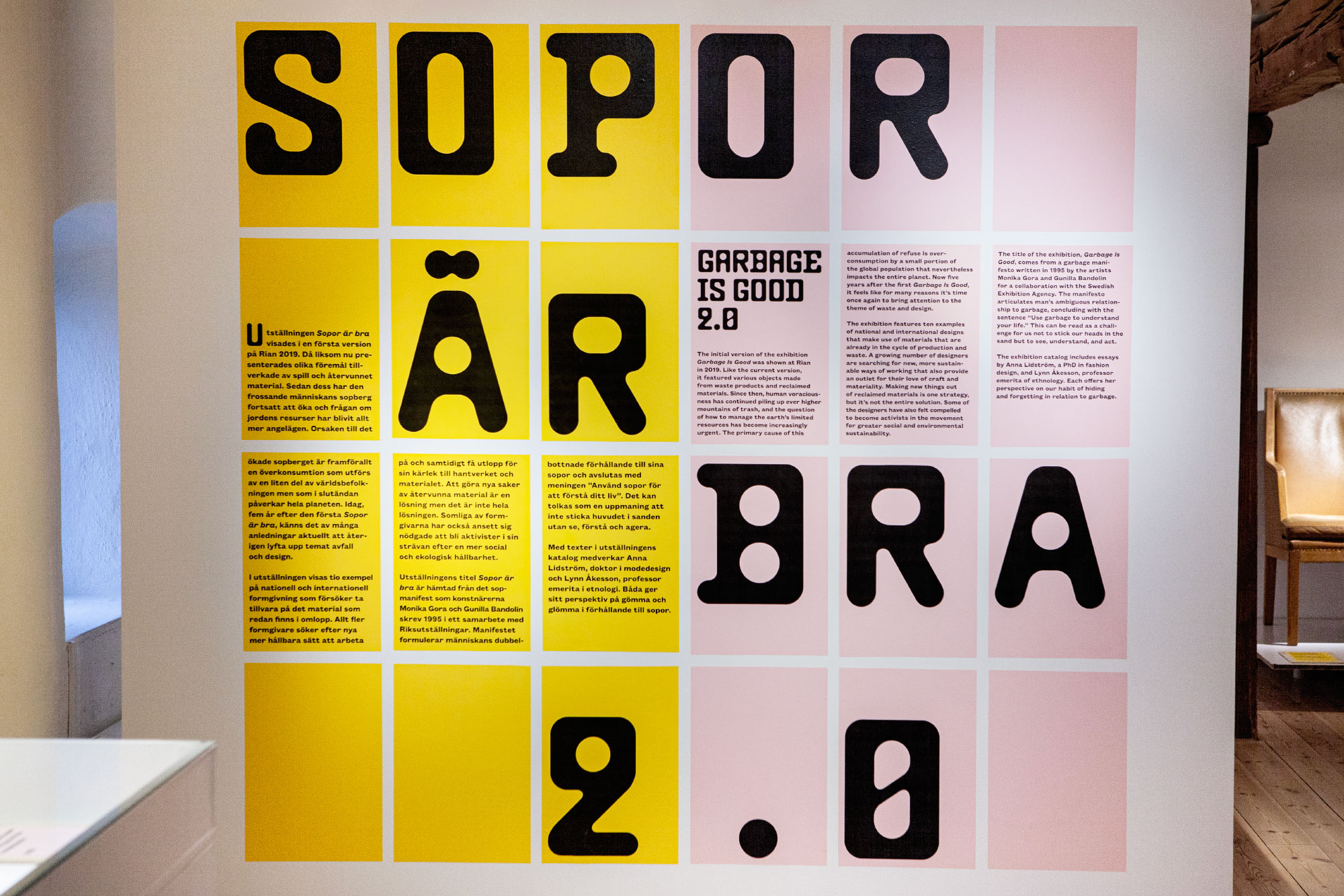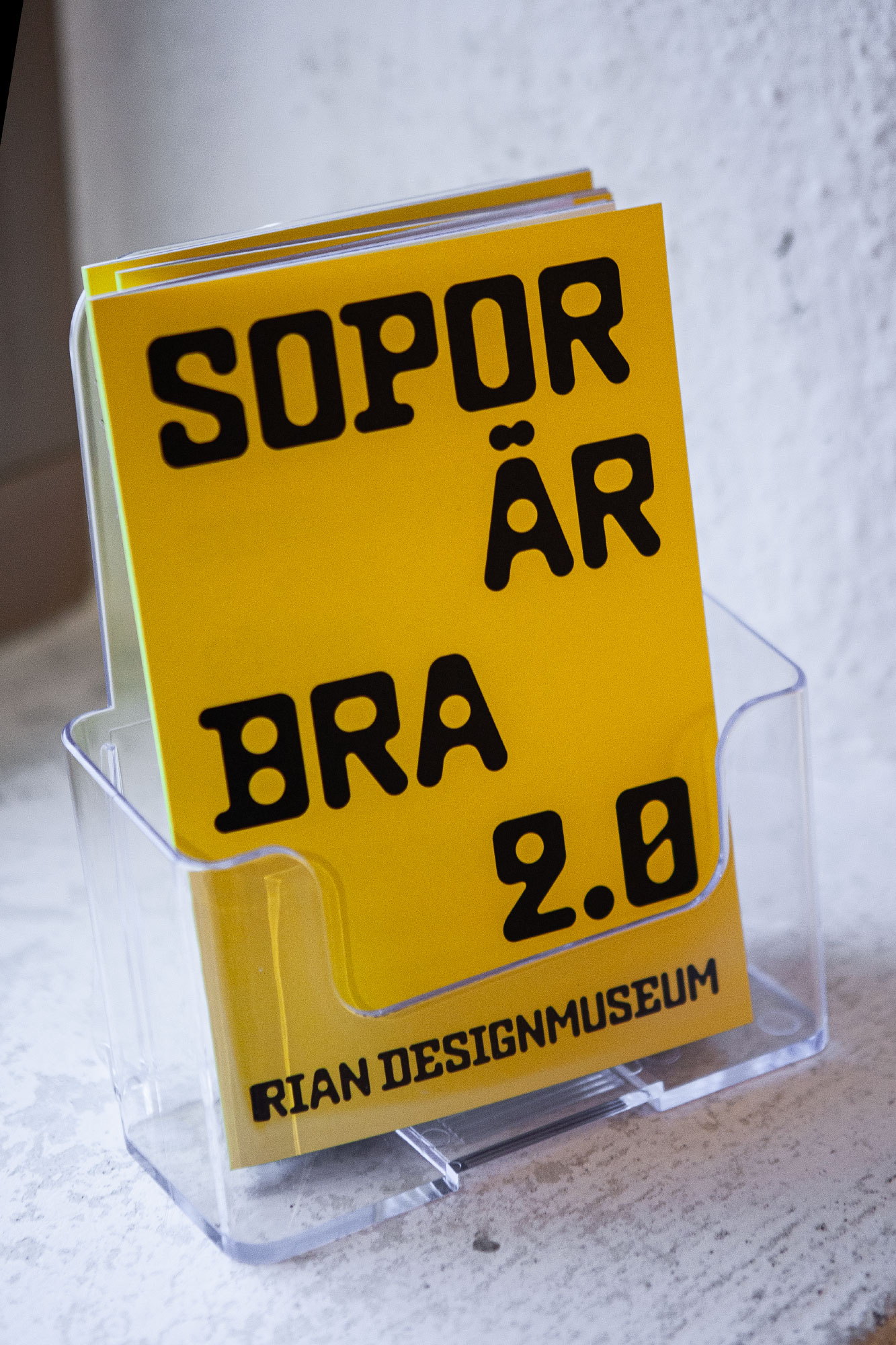 Swedish studio Bukett Grafik created the identity, signage, and a small catalog for the second round of the exhibition Sopor är bra at Rian designmuseum. In the spirit of the theme, it became a low-tech solution with recycled signage materials and laser prints on colored office papers.