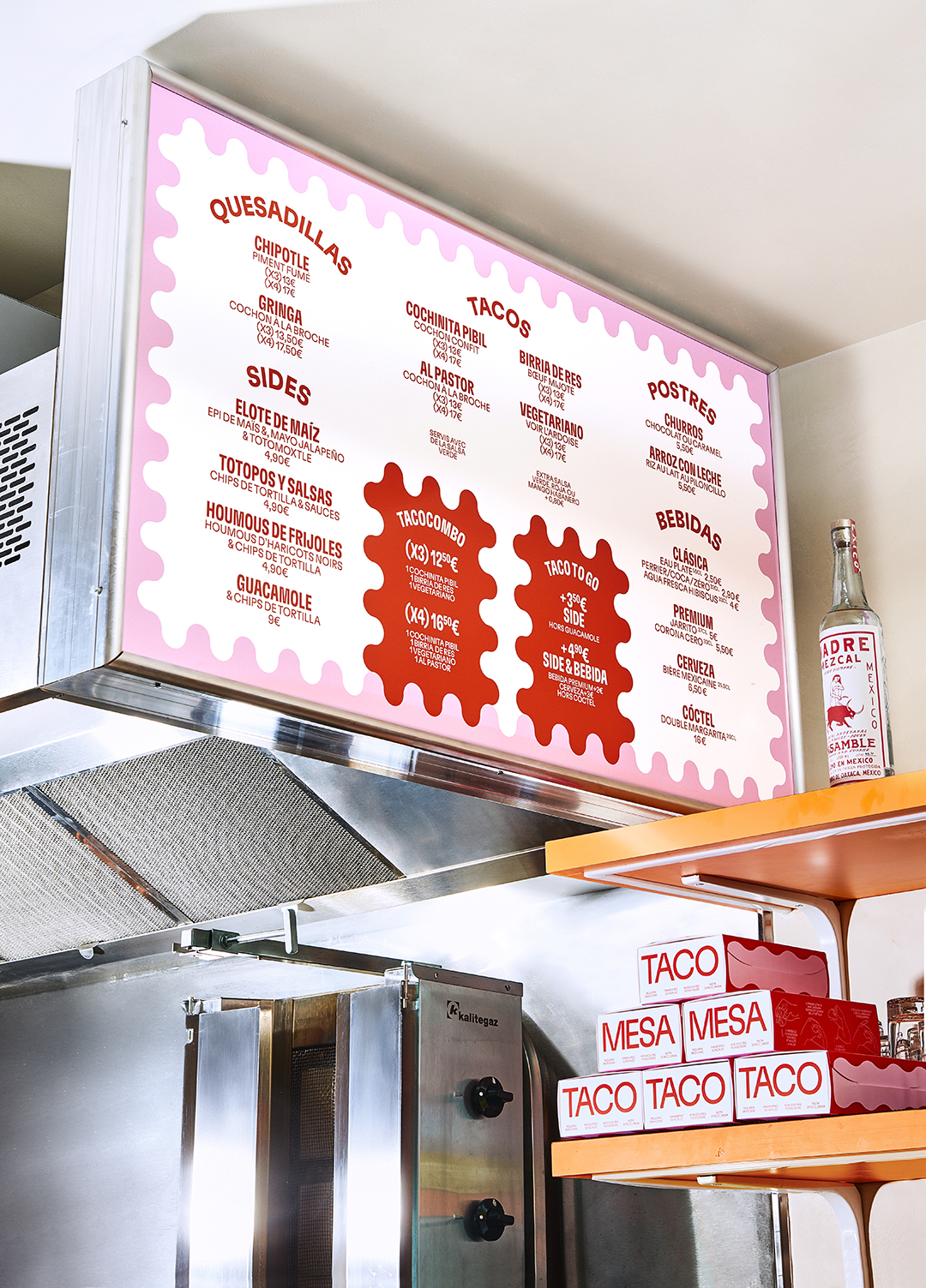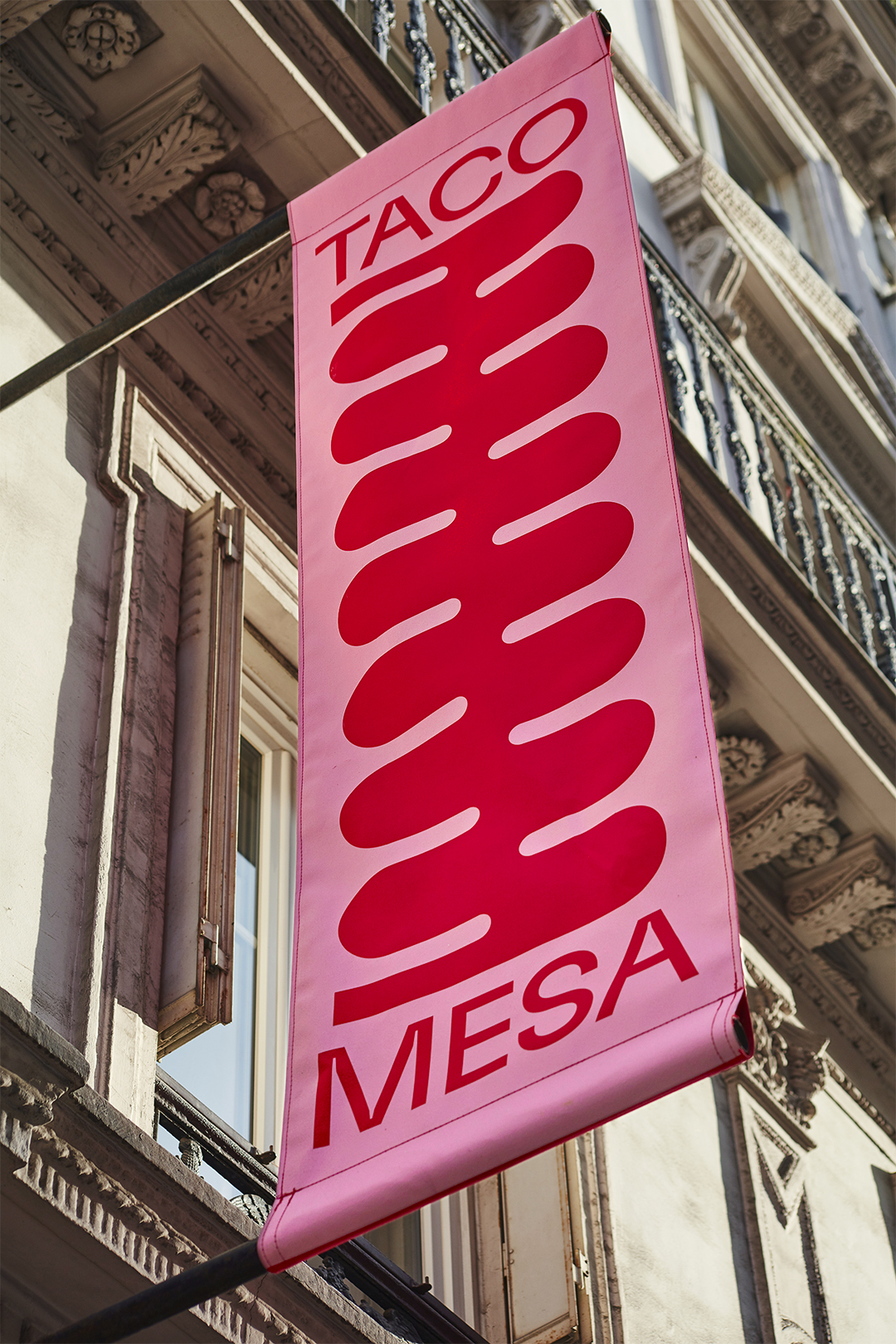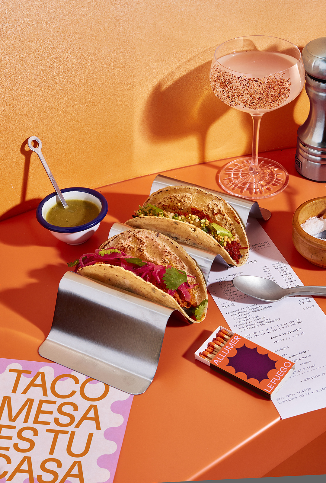 Taco Mesa is a taqueria in Paris run by chef Beatriz Gonzalez. The brand identity was designed by Studio Furious. We’ve used GT Flexa by Grilli Type for the logotype and text on the menus, packaging, stationery and signage. The M symbol is a custom design, it’s directly inspired by the taco holder shape with a touch of typical ’70s pattern. In addition, a shapes directory echoing the architectural choices of the restaurant animates the visual identity. Architecture and interiors were designed by Uchronia.