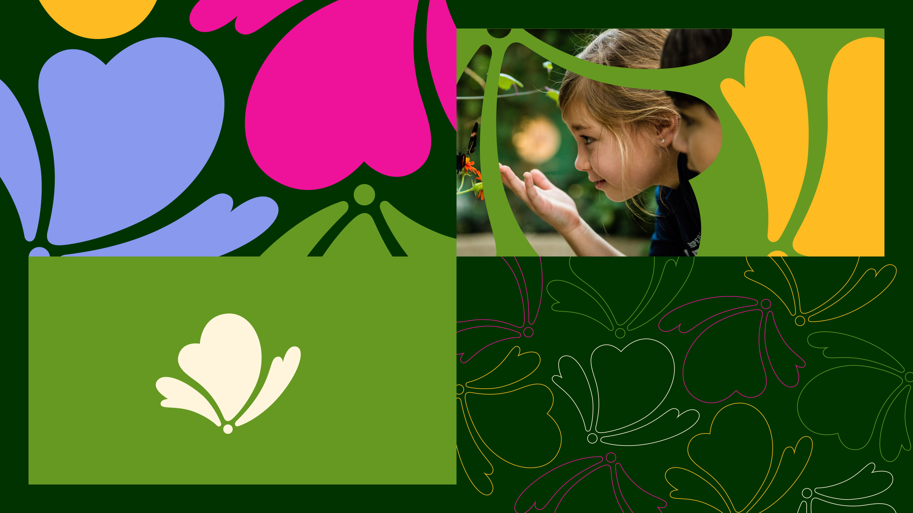 Inspired by the Illinois prairie, the color palette spans catalpa green to columbine pink to milkweed cream—unexpected blends that reflect nature’s diversity and beauty. The abstract icon evokes butterflies, flowers, and clouds—capturing the sense of wonder the natural world inspires. Beyond its official use, the icon serves as a lens to view the world and when composed into patterns, instills a sense of positive activity.