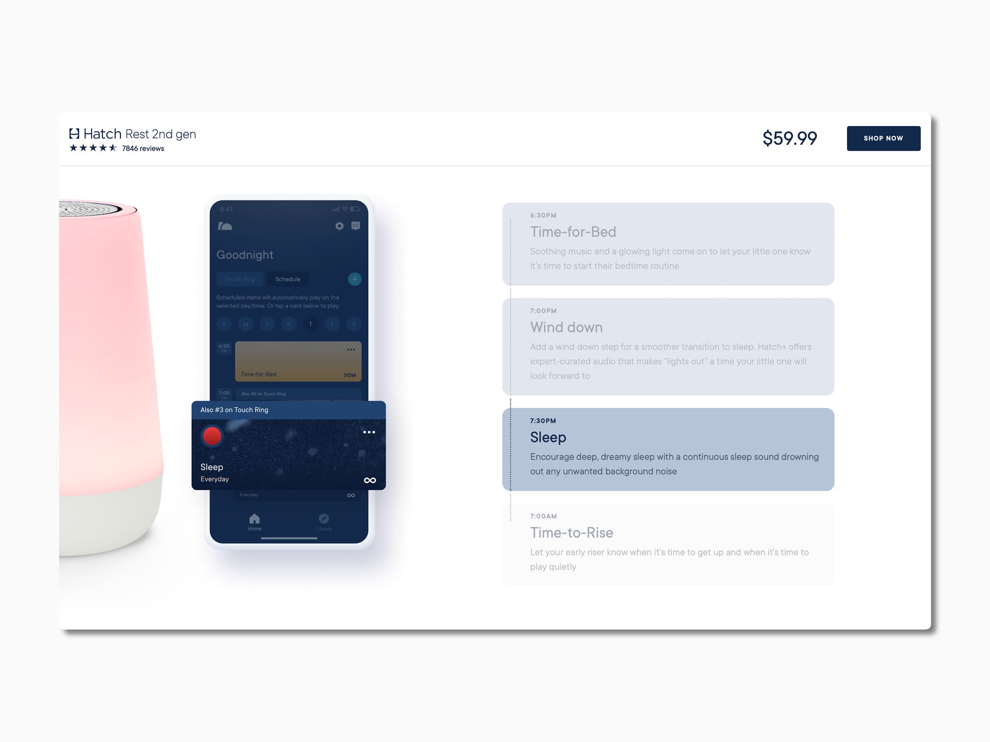Hatch provides you with natural sleep and healthy routines, finds what works best for you to get high-quality rest. Discover new ways to make sleep magical for babies, adults, and everyone in between with Hatch.