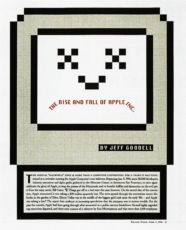 Rolling Stone, The Rise and Fall of Apple Inc. Contributed by Stephen Coles on Feb 19th, 2014. Artwork published in 1996. Source: da.aiga.org AIGA Design Archvies. License: All Rights Reserved. April 4, 1996 Typefaces More about ChicagoMore about HightowerGet Hightower Formats Magazines/Periodicals (1815) Topics Technology (1458) Designers/Agencies Fred Woodward (7) Lee Bearson (1) Tagged withmagazine interiors (1104)magazine features (137)Mac (16)Apple (41)icons (80)Rolling Stone magazine (17)vintage electronics (52)Jeff Goodell (1)drop caps (425) Artwork location United States (9760) New York City (2861) In Setsposters (Carla Saunders) (19) Stefano says: Apr 12th, 2023 2:06 pm This didn’t age incredibly well, did it? :o Post a comment Name Email – will not be published Website Your response Submit Comment More Chicago in use GEMAK identityc. 2012Wout de VringerContributed by BVH Type Staff Pick Aphex Twin – Xylem Tube EP cover1992Paul NicholsonContributed by Nathan Prost Le meilleur de … by Sébastien Bailly book seriesc. 2006Olivier FontvieilleContributed by Florian Hardwig Sponsor More in Technology Penguin Village Wars handheld game, Animest logo1982Popy ElectronicsContributed by Fonts In Use Staff #ffbcn fàbrica futur barcelonac. 2014Mario Eskenazi StudioContributed by Emtype Foundry Beat Foundry visual identity2022Adam HoContributed by Nguyen Gobber Web Graphic Experiments by Keita Yamada2021Keita YamadaContributed by Alain Papazian More in Magazines/Periodicals Elle magazine1950Contributed by Tânia Raposo Akademische Mitteilungen No. 25, “All Inclusive”, 20202020Alina WenzlerDominik SchnabelrauchContributed by TypeMates Der kleine daedalus, No. 12, 20172017CaimagoContributed by Emtype Foundry Nick Shinn in the ’90s1996unknownPhoto(s) by Nick Sherman on Flickr. More Fonts In Use Death Must Die – Soundwalk Collective2018Benjamin KilchhoferContributed by Forgotten Shapes Staff Pick Visages exhibition at Almine Rech2024Geoffrey BourgeoisContributed by Geoffrey Bourgeois Staff Pick Akira by Katsuhiro Otomo1982Katsuhiro OtomoPencil StudioHiroshi HirataContributed by Quentin Schmerber Blog San Antón 20182018Aníbal HernándezContributed by Aníbal Hernández Staff Pick
