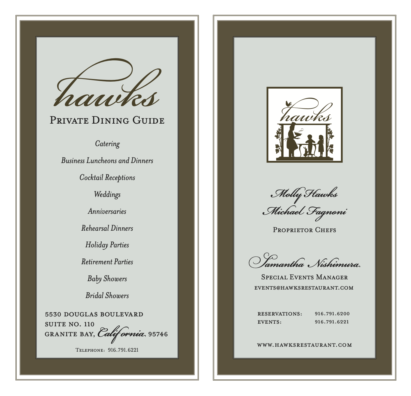 Front and back cover of the Hawks Private Dining Guide. The typeface used alongside Bickham Script is Zuzana Licko’s Mrs Eaves in roman small caps and italics.
