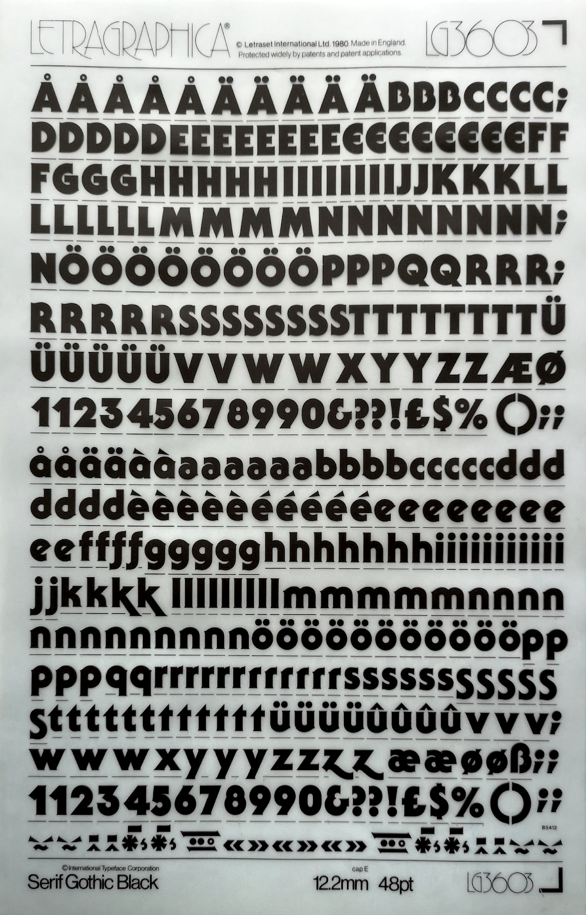 A sheet of 48pt Serif Gothic Black, issued by Letraset in 1980 as LG3603 in their Letragraphica range. Note the alternates for aefkrstzEL and the pile of combining diacritics at the bottom.
