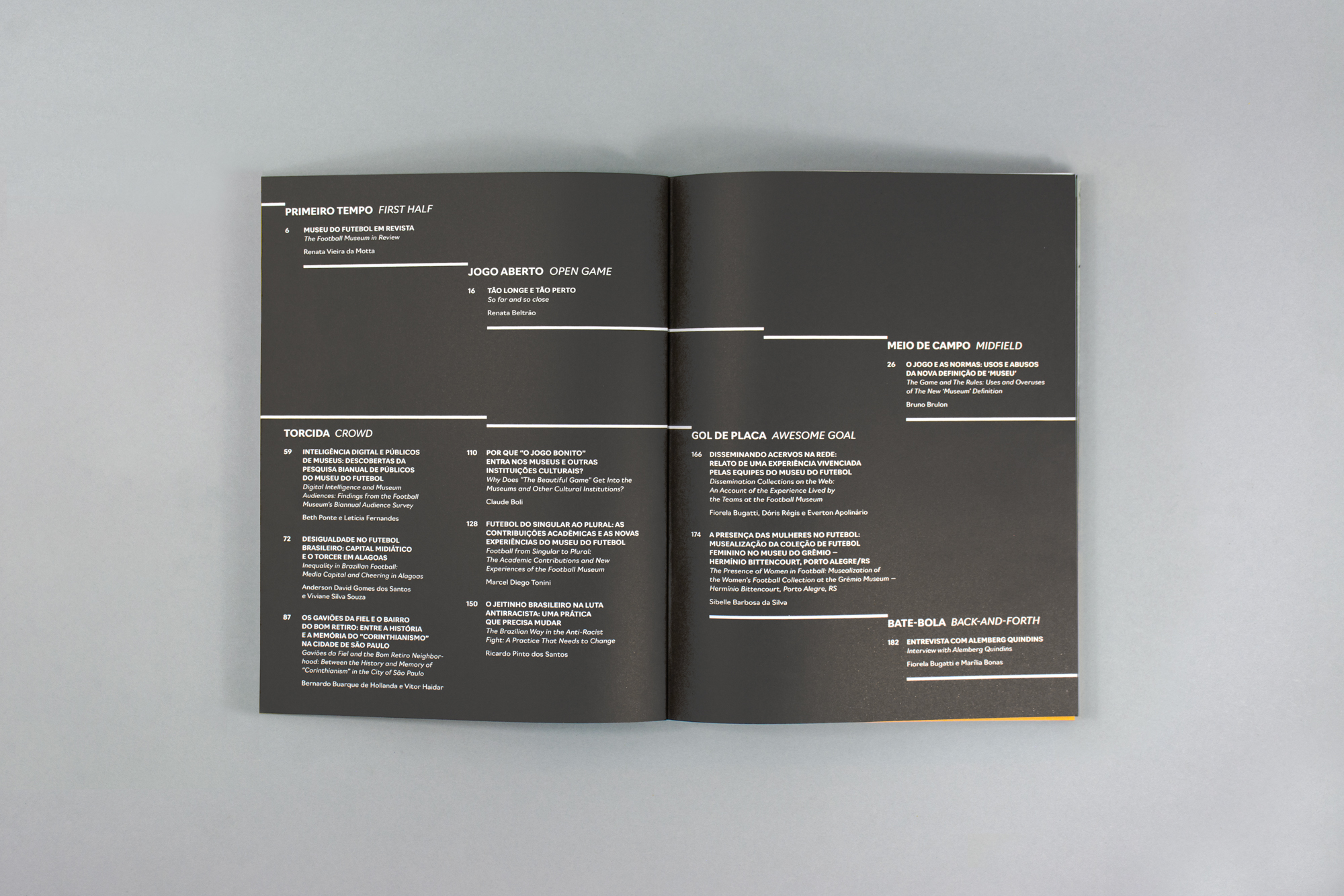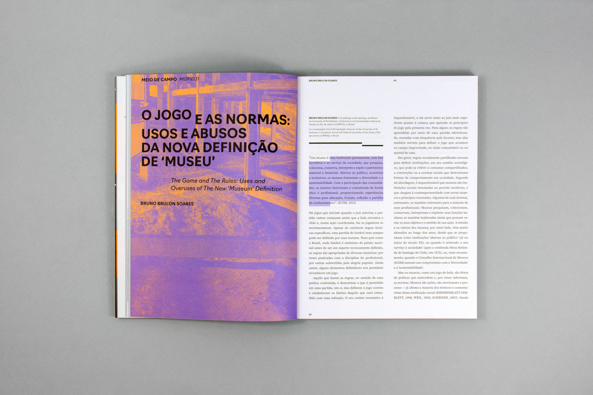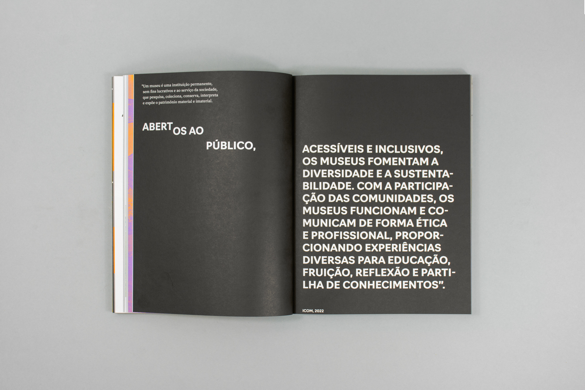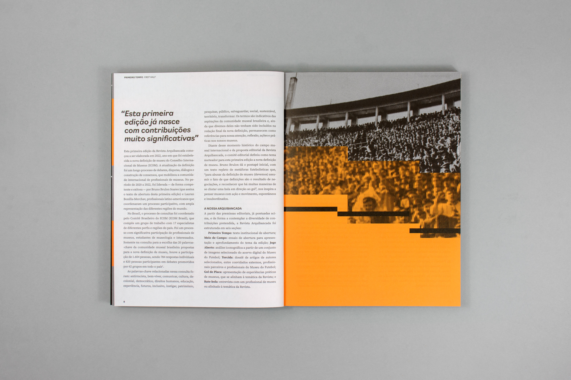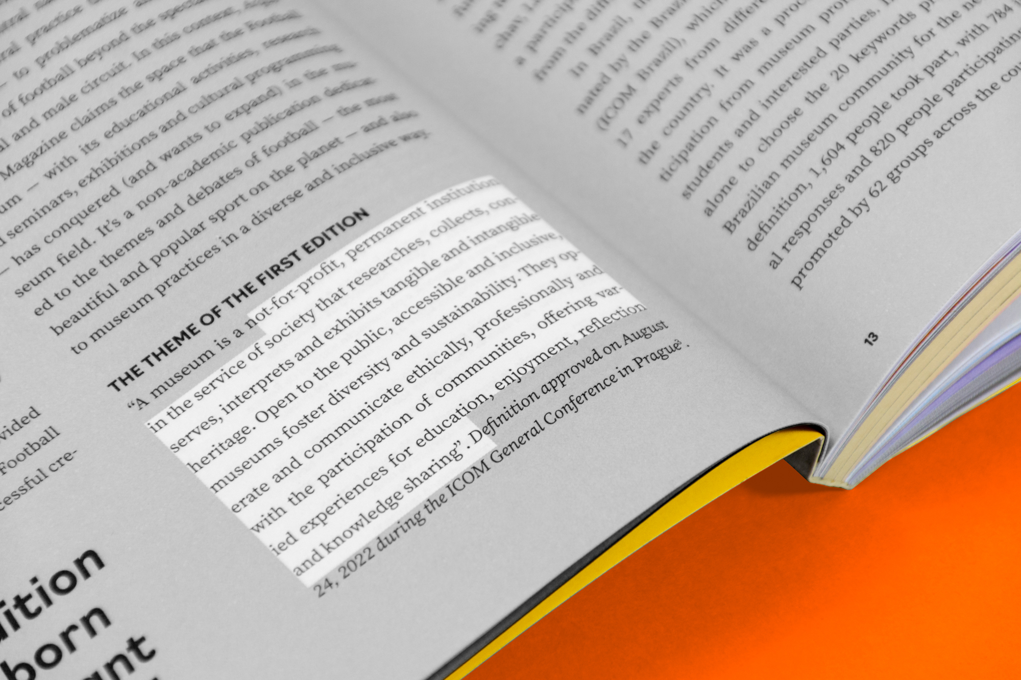 The objective of this graphic design was to convey the physical experience of visiting a stadium. The cover, with its arrangement of texts cut out like a detached paper, alludes to a ticket. Issue No. 0001, numbered like the seats in the immensity of a stadium, has 210 pages dedicated to the theme “The new museum definition”, and features texts, articles and interviews with important contributors.