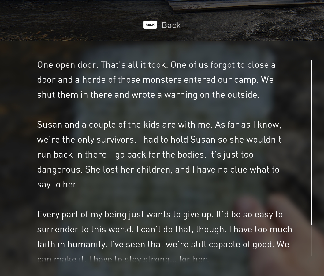 FF DIN Regular and Medium, apart from certain instances is the only typeface used for the game’s user interface. Neue Helvetica Bold is used for title cards during chapter transition sequences. What looks like Helvetica Condensed is used for the credits sequence in both Part 2 and Part 1, while the original just used Neue Helvetica. These typefaces continue to be used