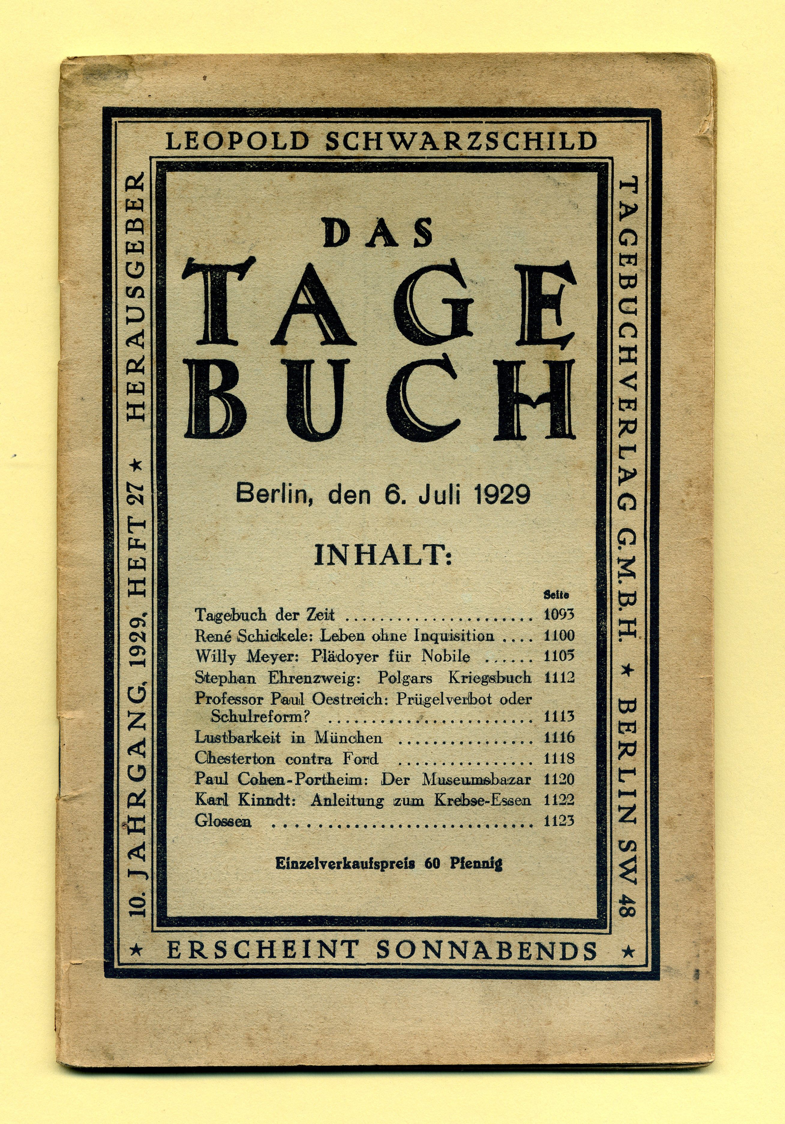 The independent weekly Das Tage-Buch was published from January 1920 until January 1933. Founded by the Viennese journalist and theater critic Stefan Großman with assistance from publisher Ernst Rowohlt in Berlin, it was later continued by co-editor Leopold Schwarzschild who published Das Neue Tage-Buch in exile in Paris until 1940.