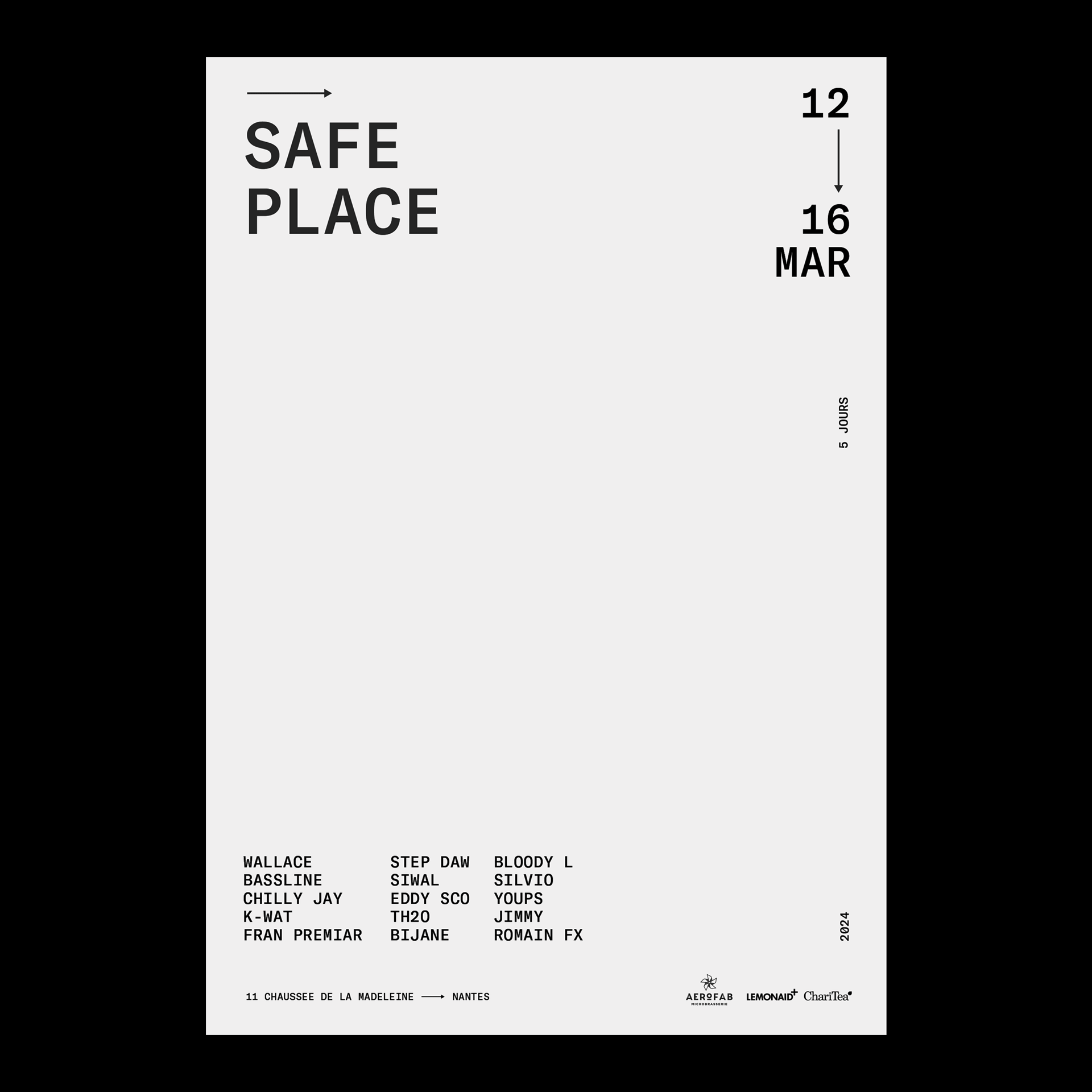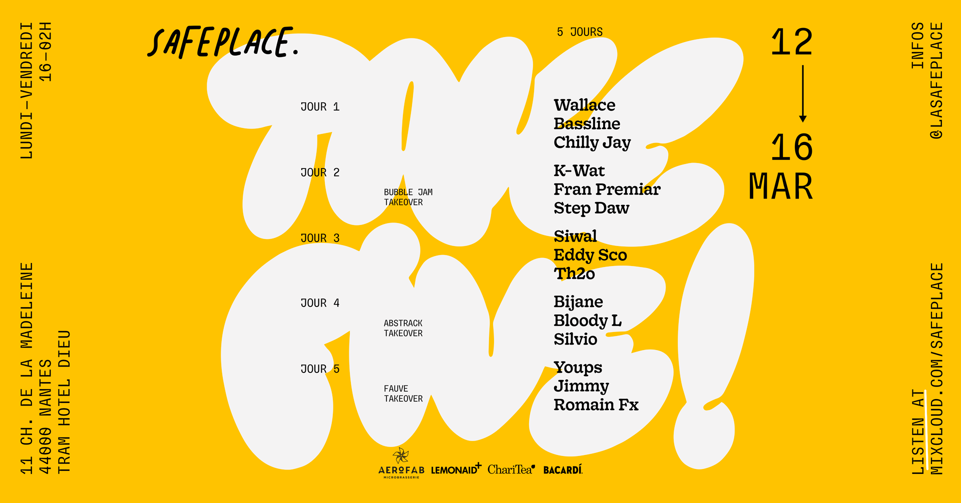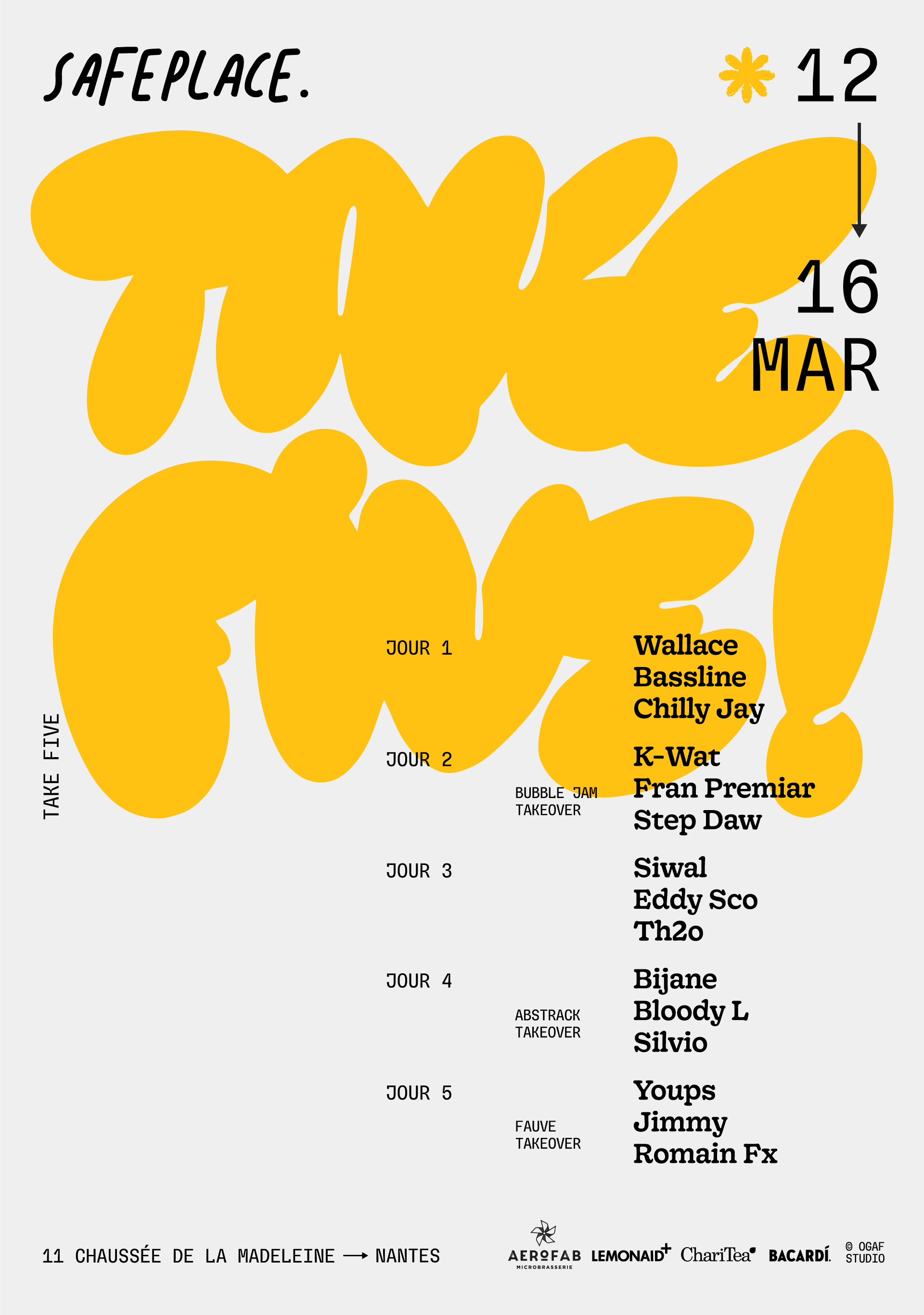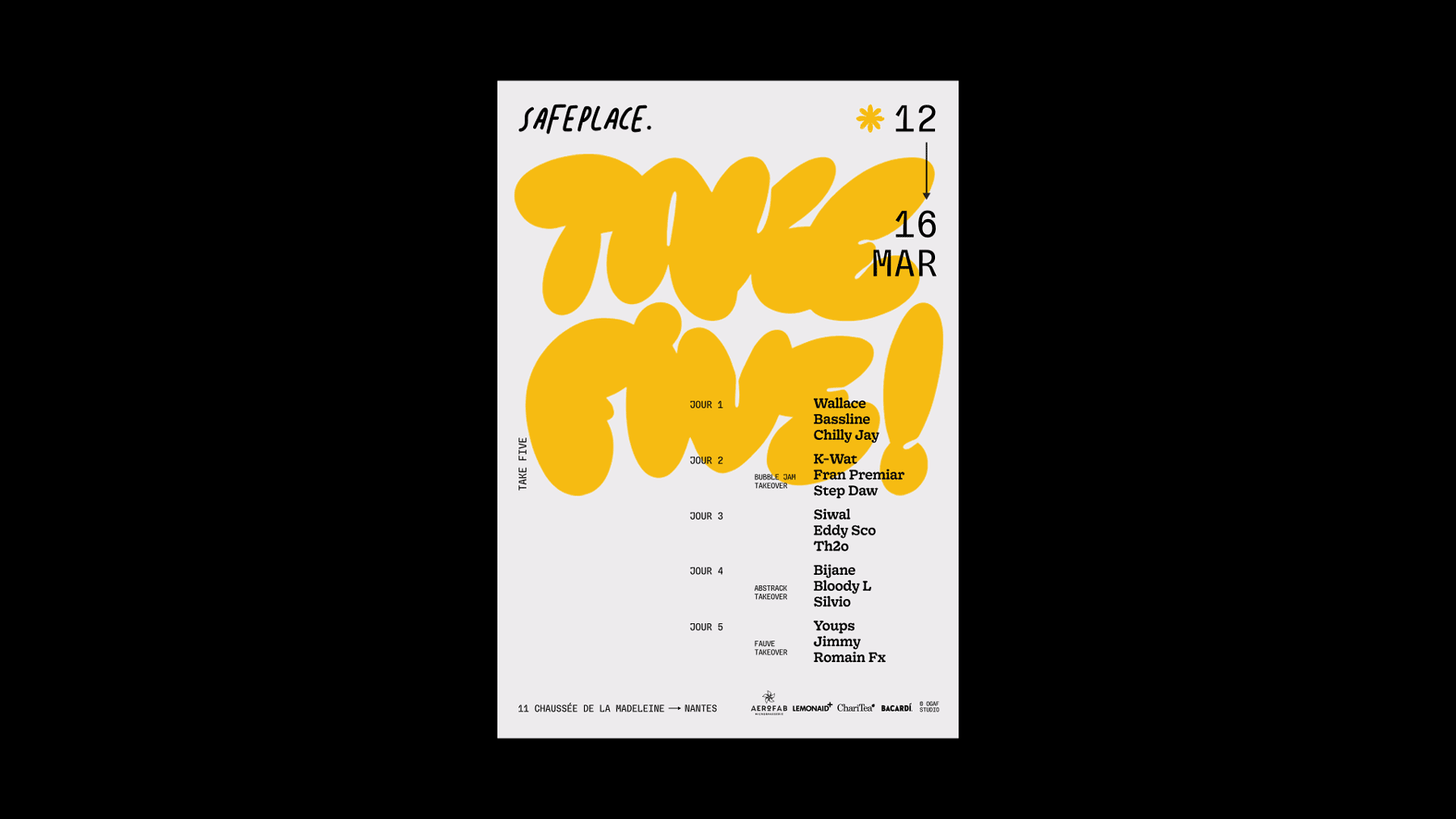 .“TAKE FIVE!” is an event organised by the audiophile bar Safe Place in Nantes, France. It’s a 30-hours musical journey by fifteen DJs over five days to celebrate the bar’s fifth anniversary.