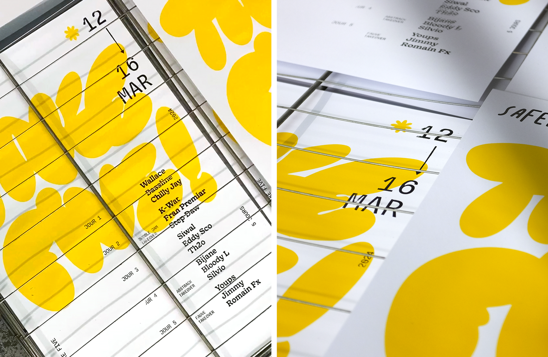 Ogaf Studio developed the art direction based on the Gooper typeface, created by Very Cool Studio in homage to the famous Cooper Black, and Sligoil Micro drawn by Ariel Martín Pérez and released with Velvetyne. We designed the visuals on a modular grid with hand-drawn letterforms that can be adapted to different communication media. It’s a true nod to the underground scene, and it was a real pleasure to screen-print this visual in a limited series.