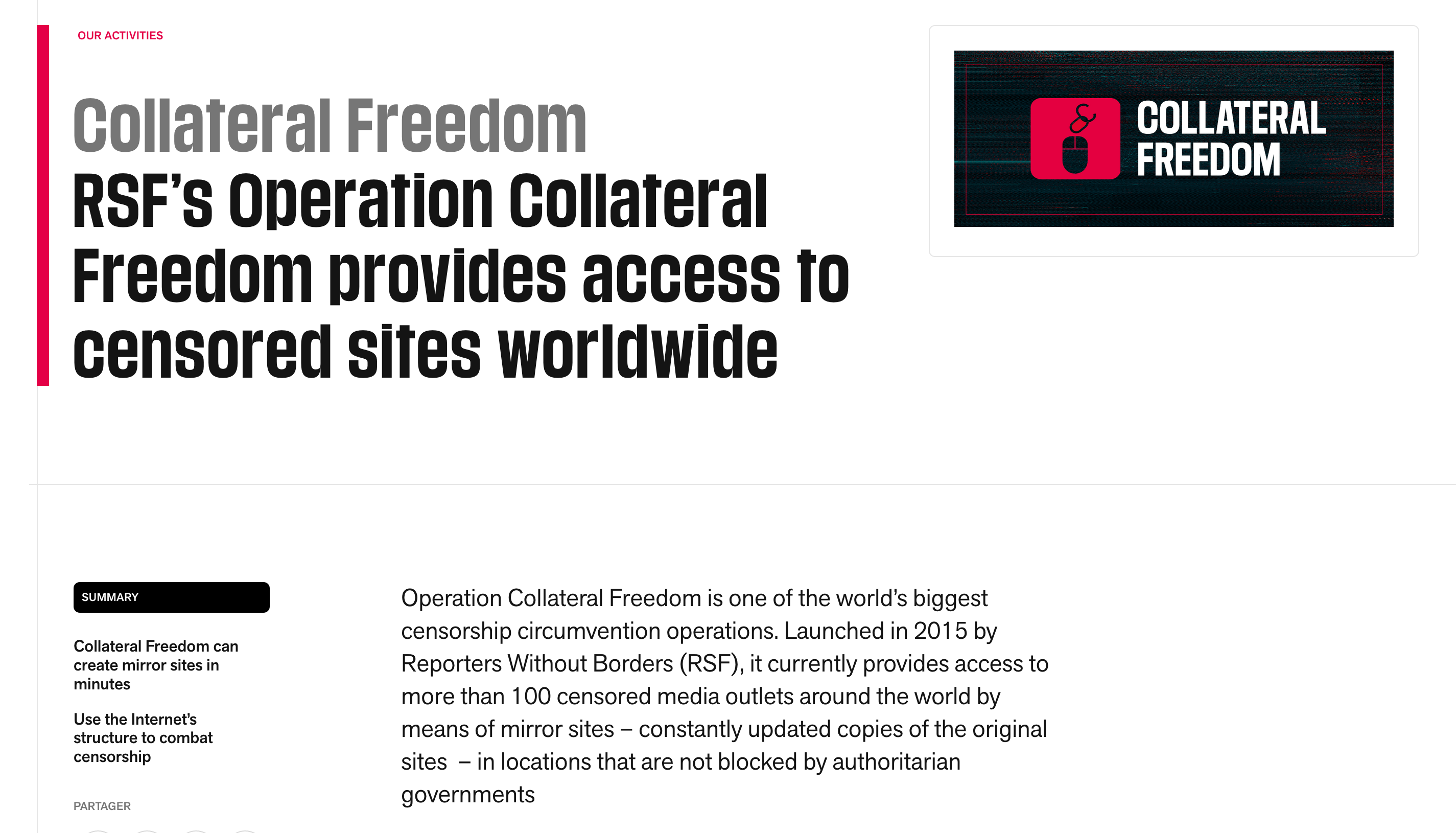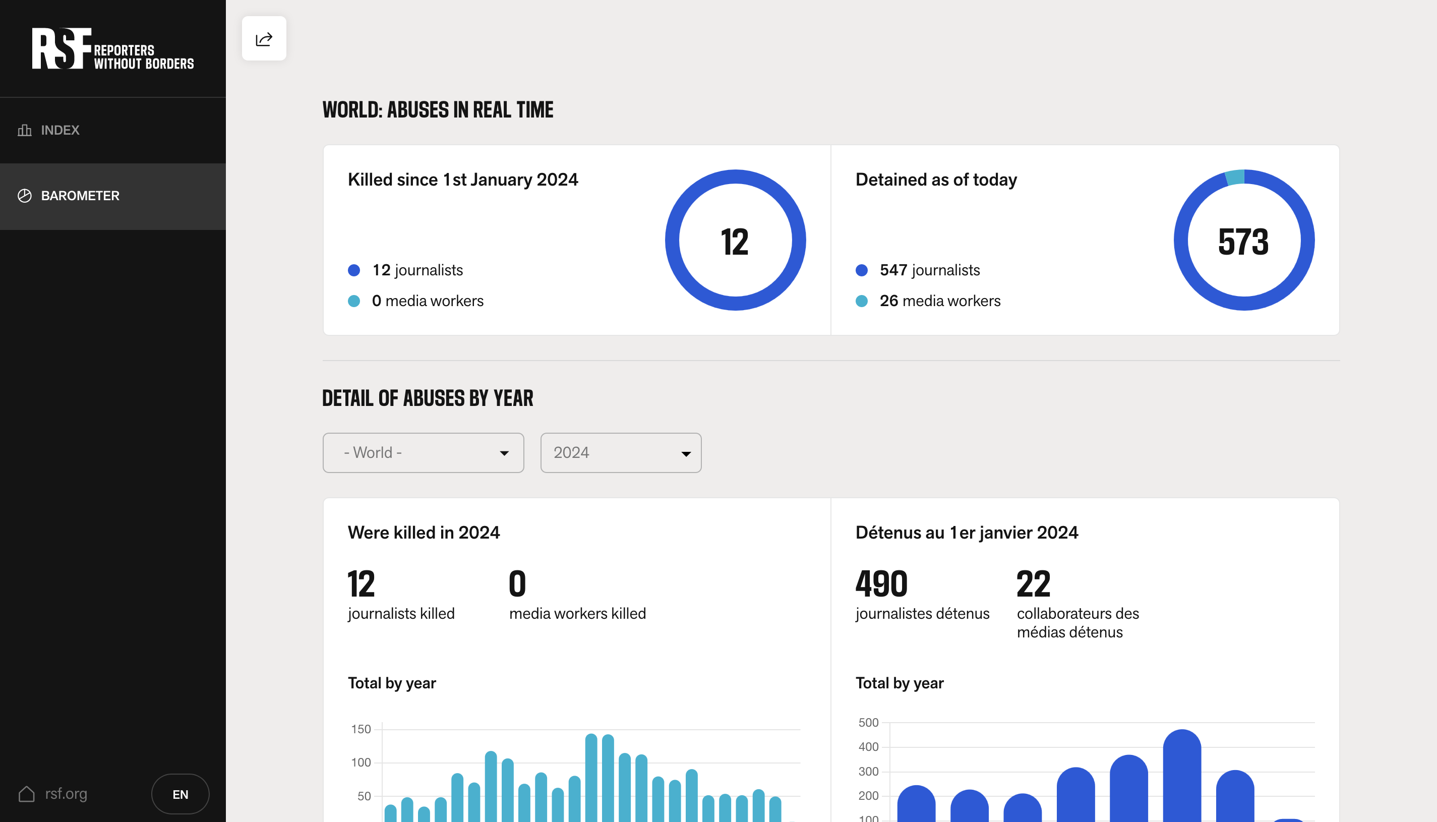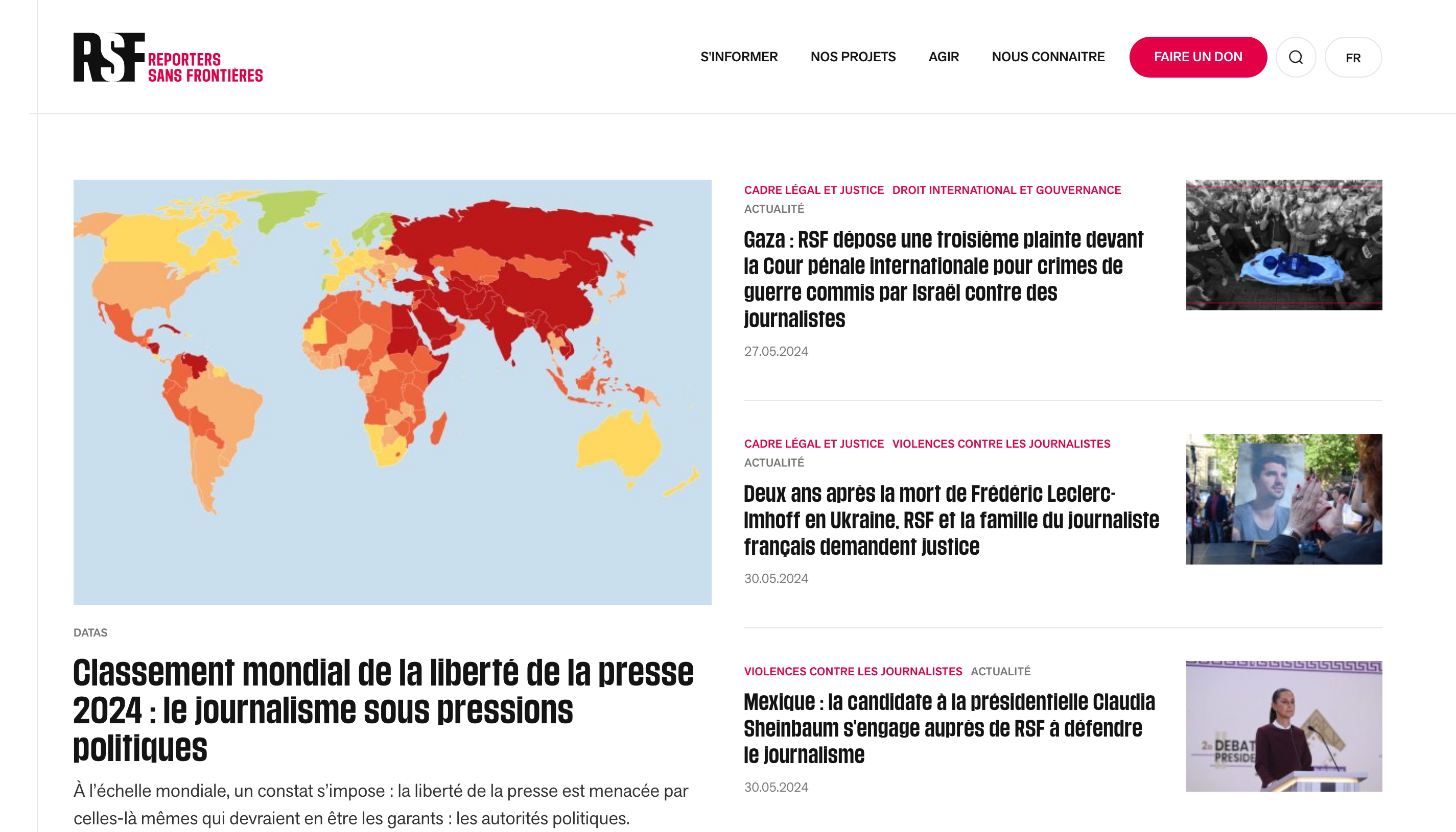 RSF – Reporters sans frontières (Reporters Without Borders) was founded in the French city of Montpellier in 1985 and named following the model of the Doctors Without Borders. Since 1995 the non-profit and non-governmental organization has its seat in Paris. It’s self-chosen purpose is to promote freedom of press and to defend and help persecuted journalists – and that worldwide. 13 national and regional offices and 146 correspondents form a network around the globe.