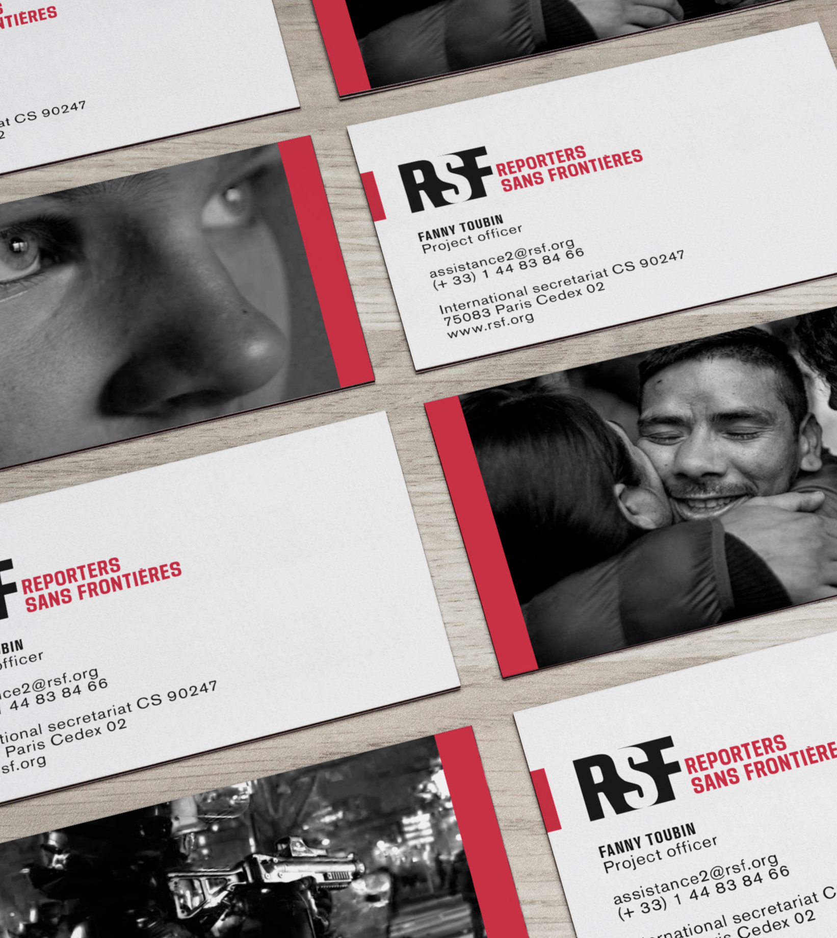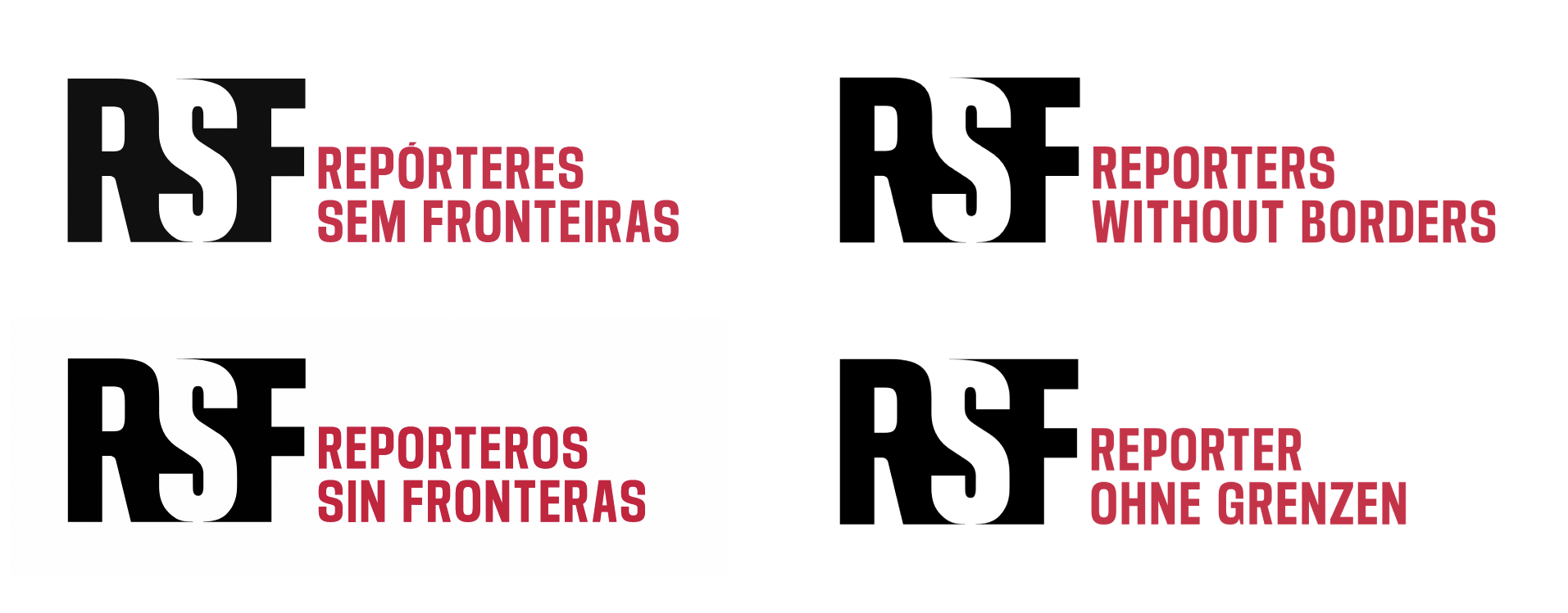 Since the introduction, all offices use the initials RSF in front of the translation of the full name in the given language. Both the logo and the name are set from Media Sans SemiCondensed designed by Jean-Baptiste Levée from Production Type. The face is also used worldwide for typesetting the headlines. A major advantage of Media Sans in this use are its extremely short ascenders and descenders: this way headlines using lowercase letters are as impressive as those set in all caps.