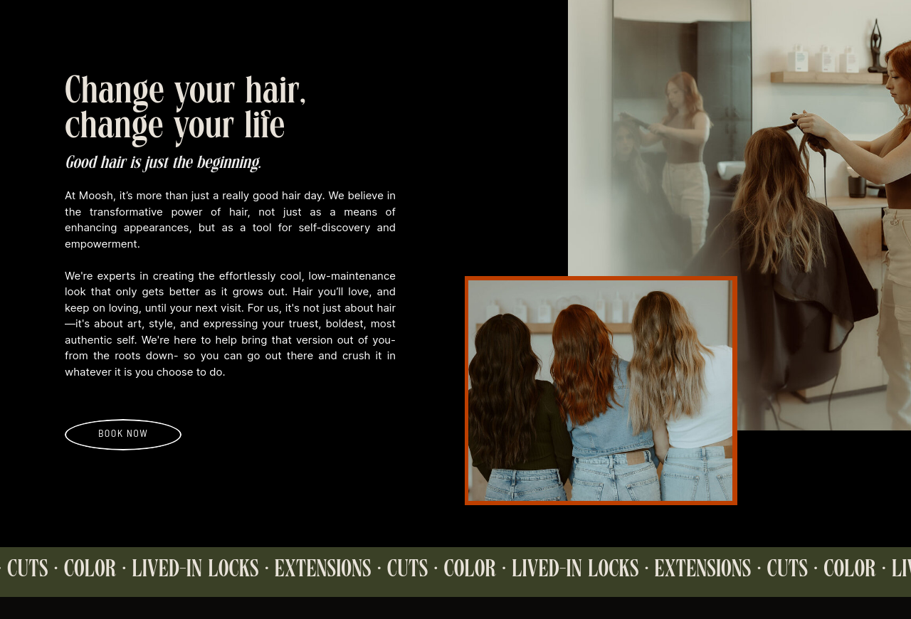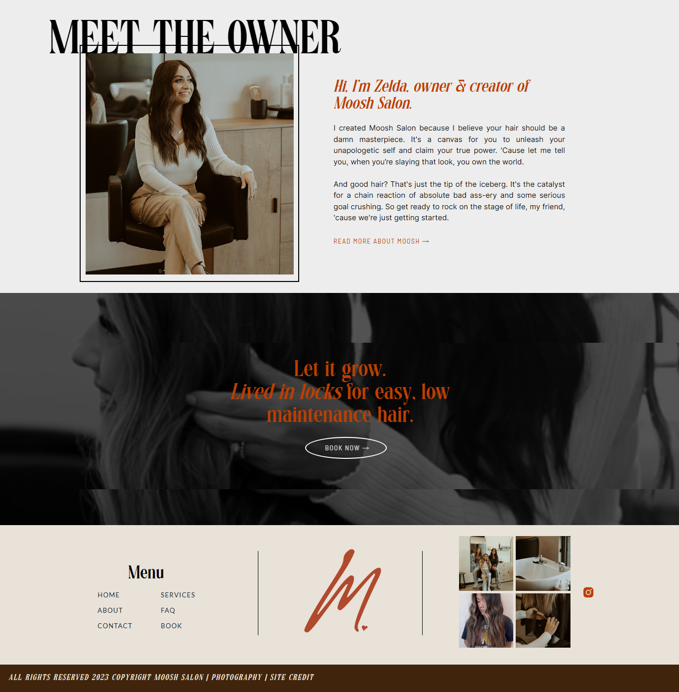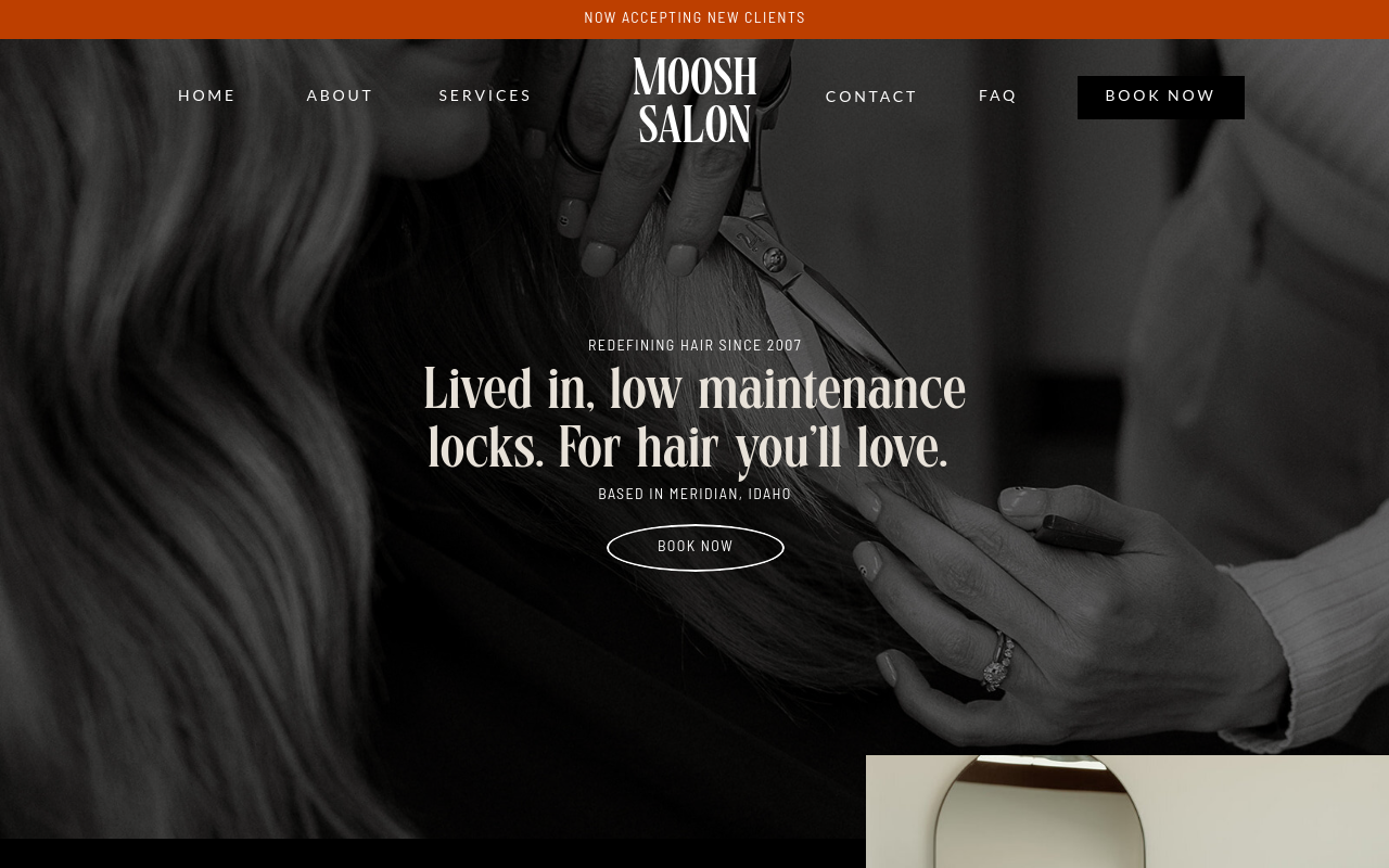 The identity by Kellie Lynn Media uses Merisca from Pixesia Studio as the basis for Moosh Salon’s logo and primary headline. Barlow Condensed is used for the navigational elements and subheading. Additionally, the website uses Lato for some selected text and Inter for the body copy.